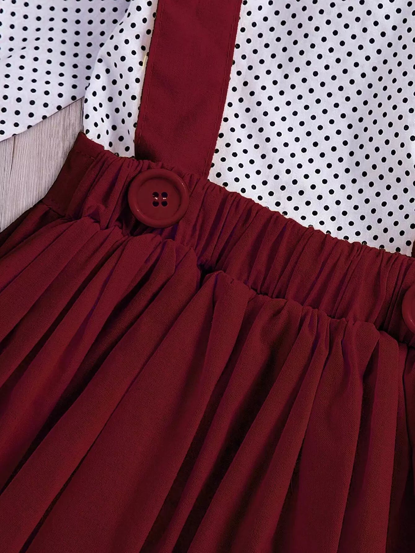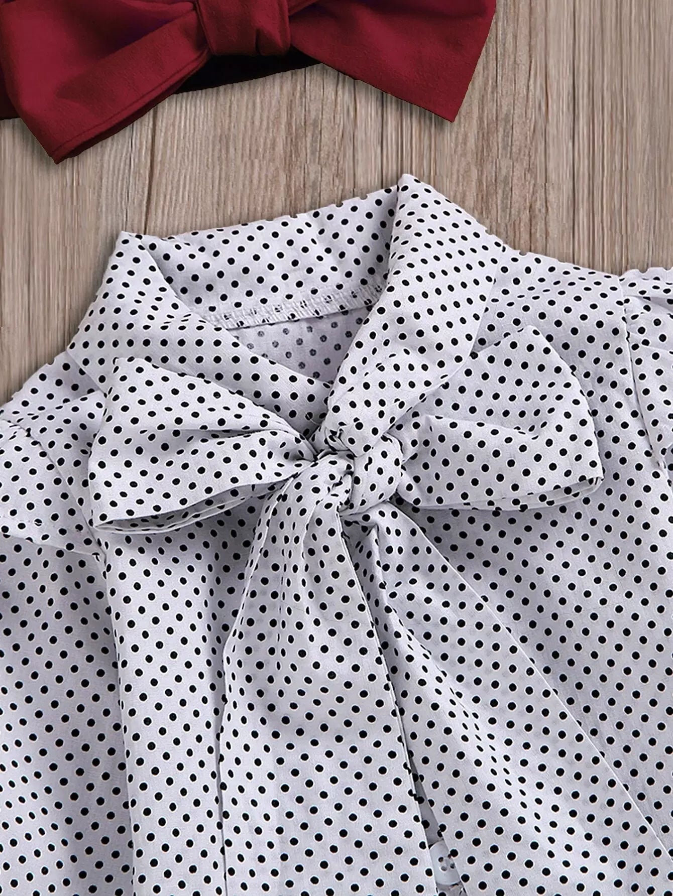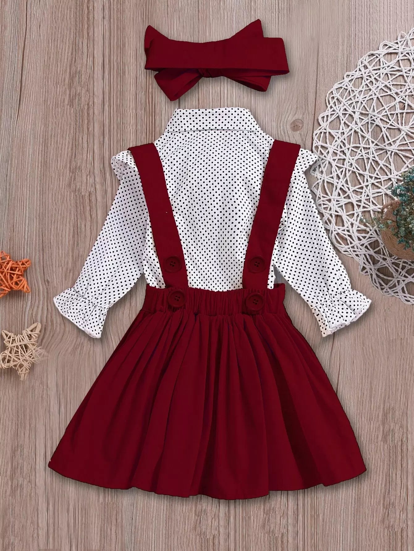 Toddler Girls Polka Dot Tie Neck Top & Pinafore Skirt & Headband