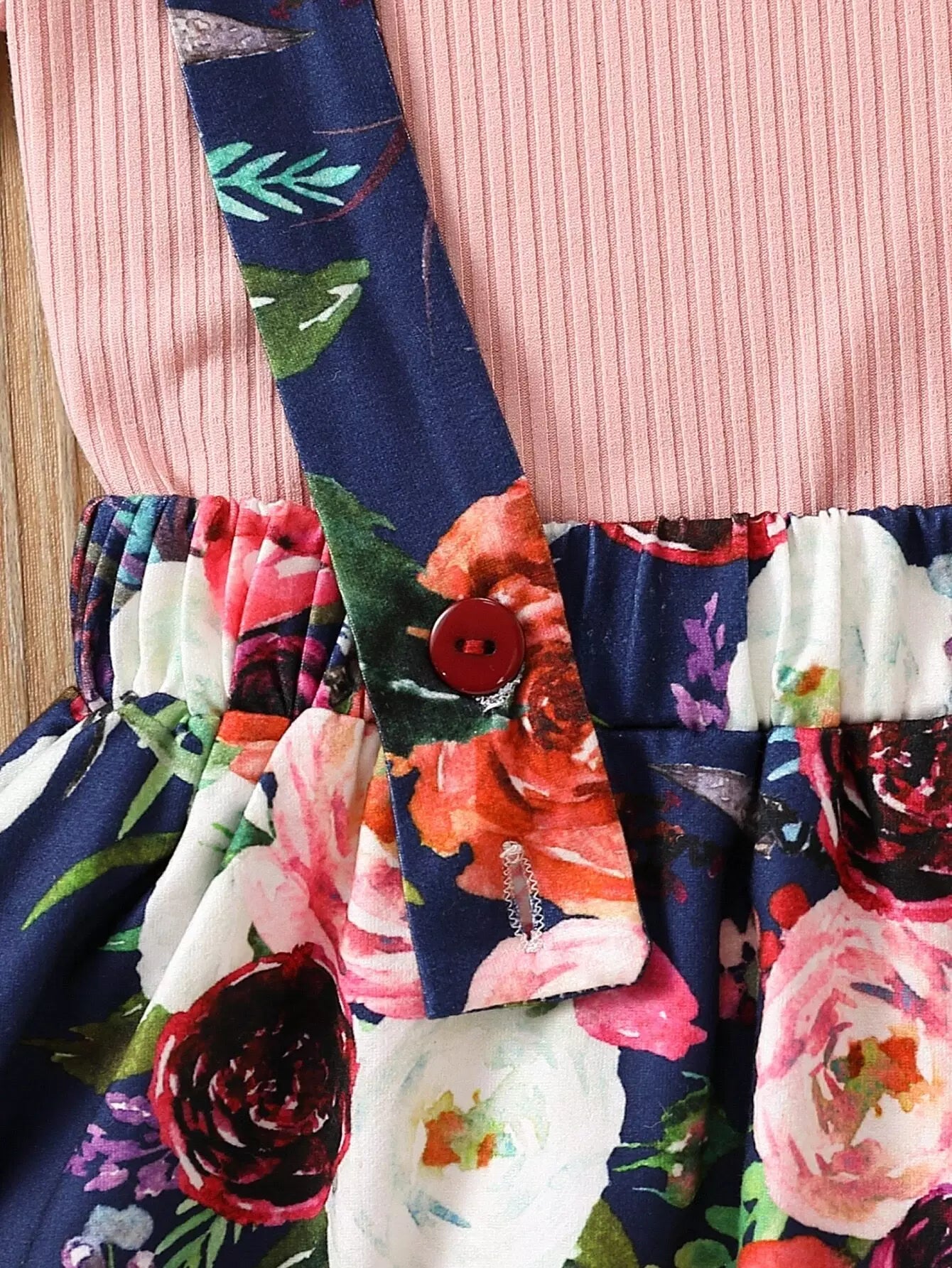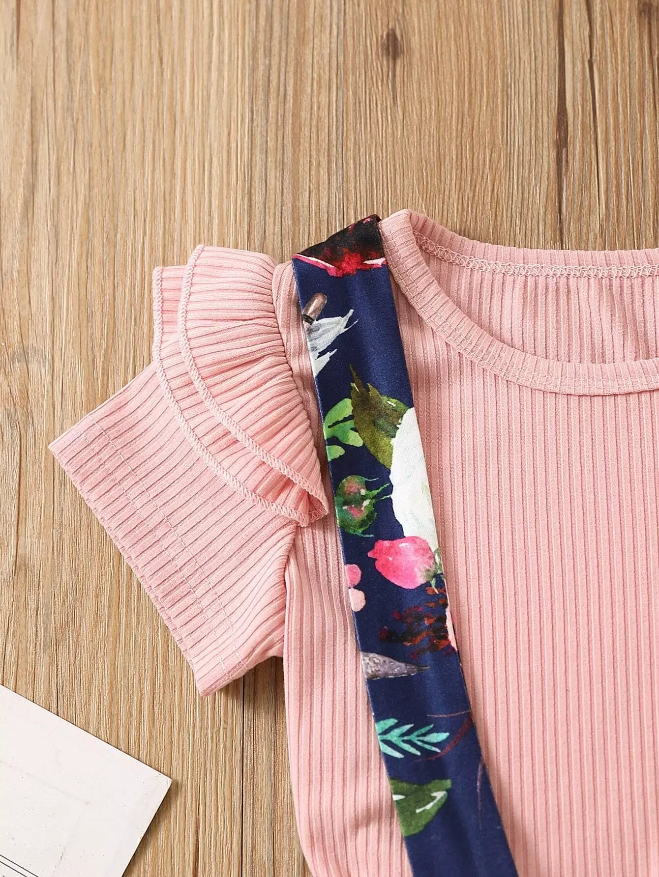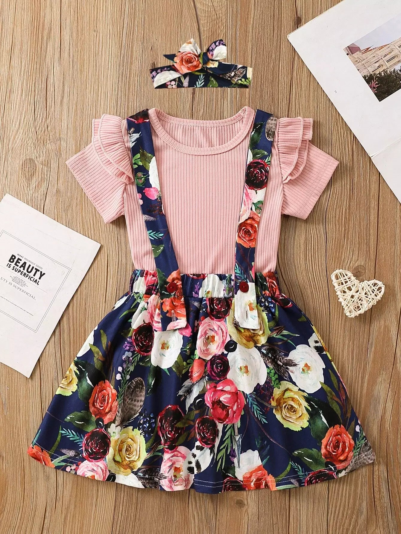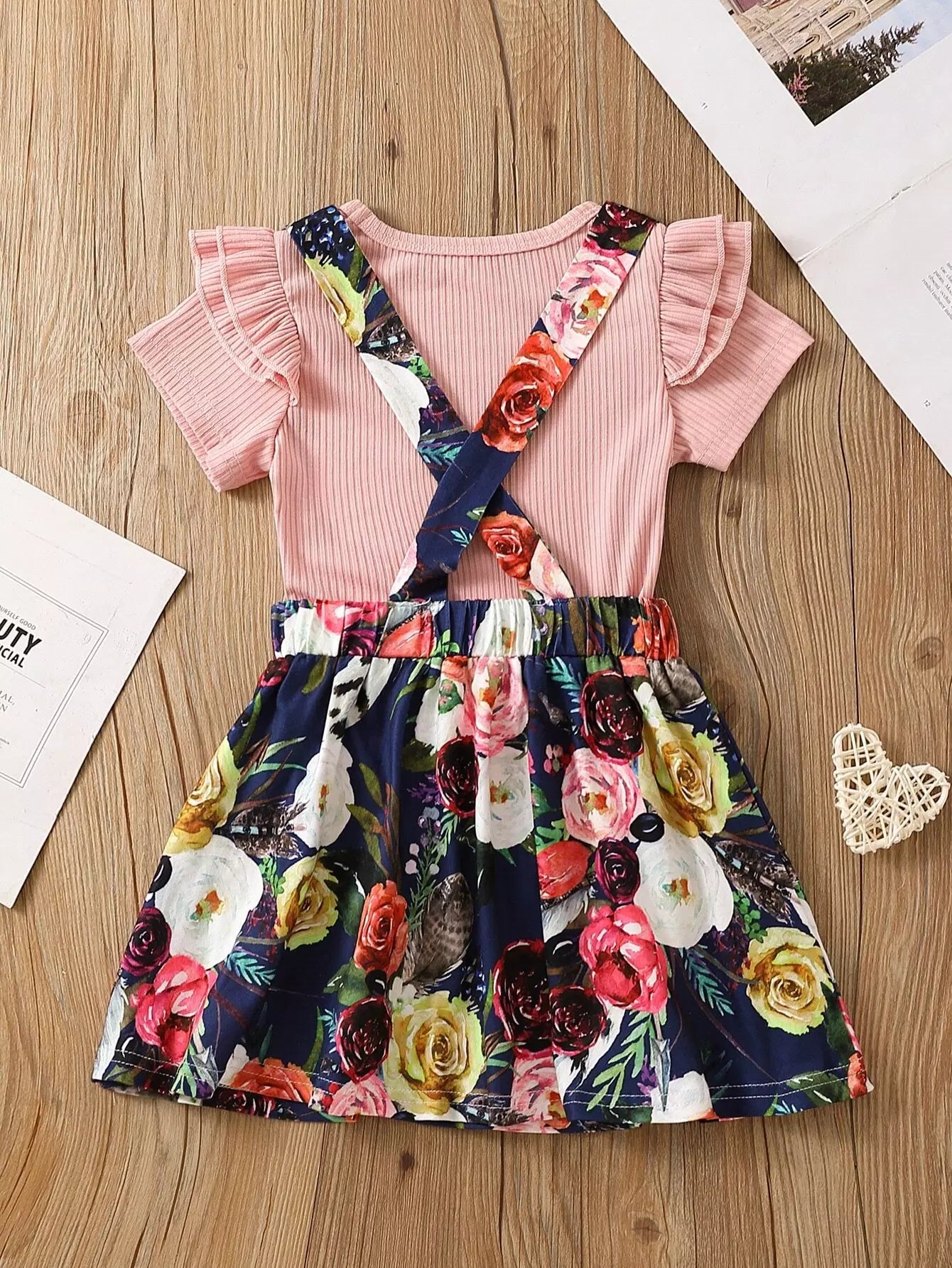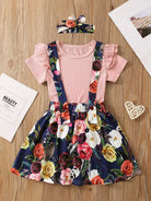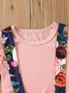 Toddler Girls Solid Rib-knit Tee With Floral Print Pinafore Skirt