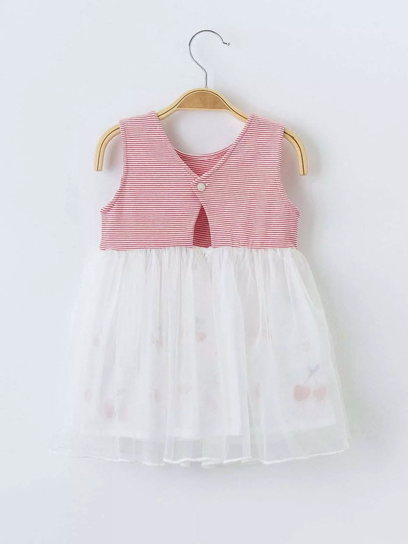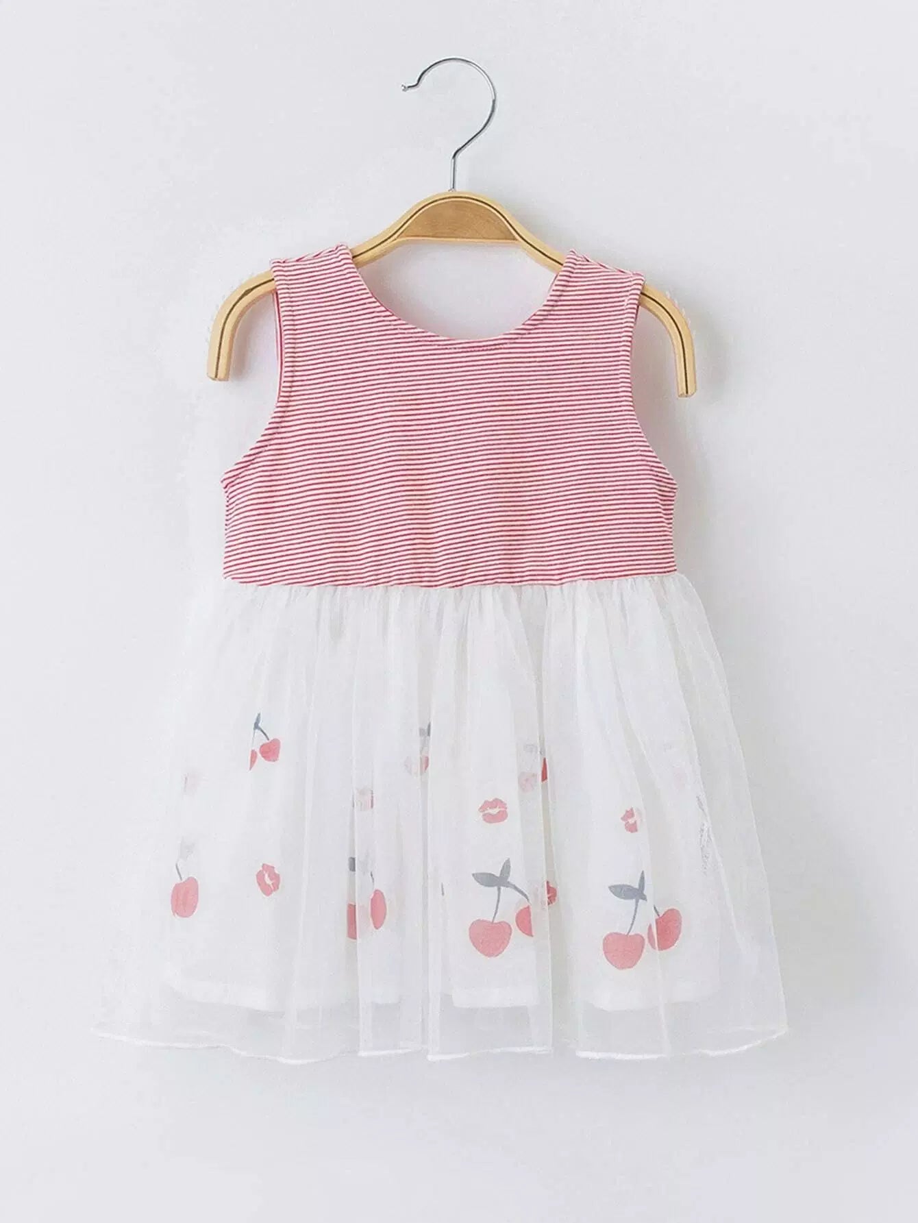 Toddler Girls Striped & Cherry Print Mesh Overlay Dress