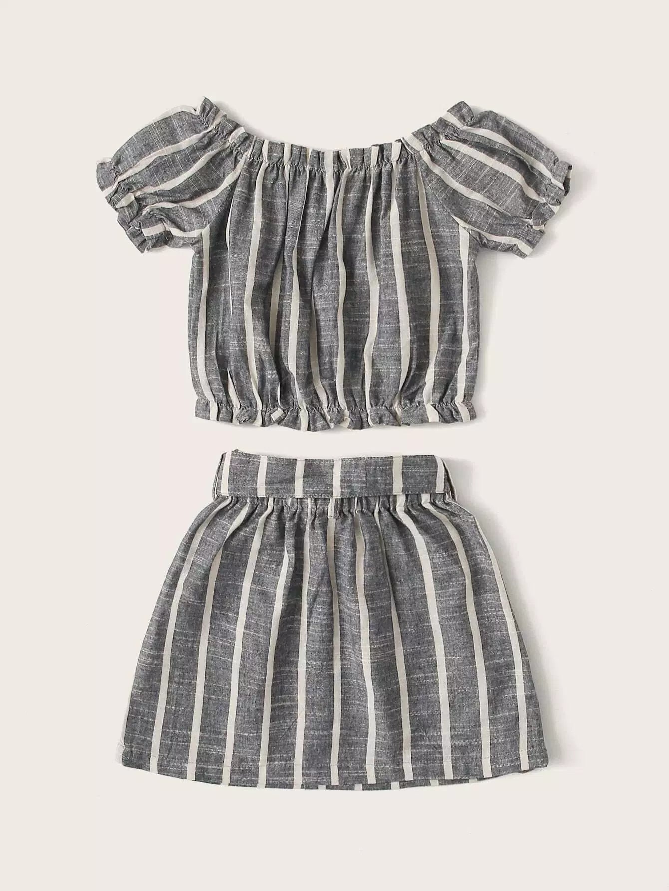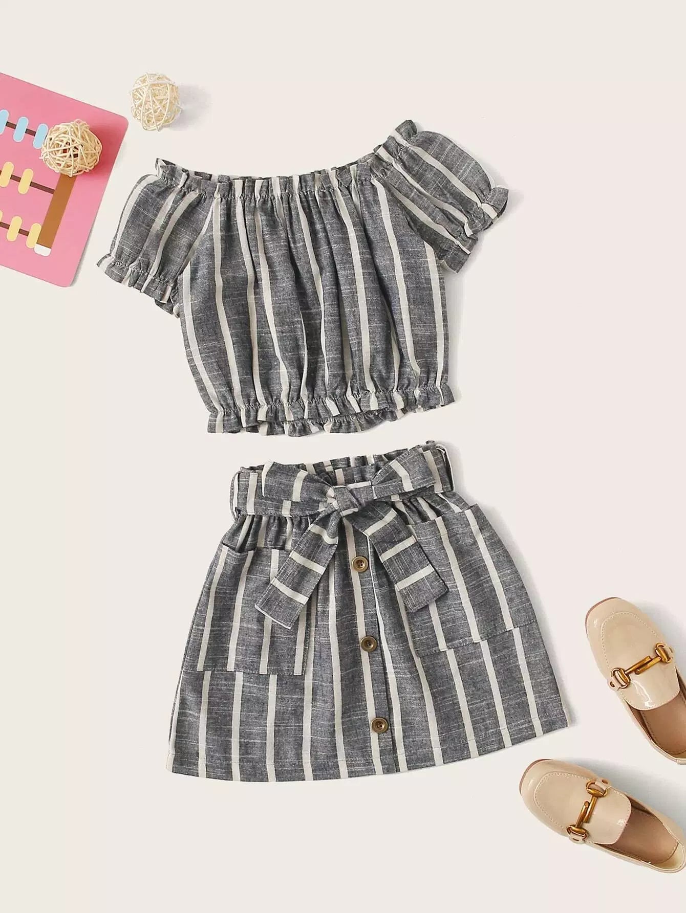Toddler Girls Striped Frill Trim Bardot Blouse & Skirt Without Belt