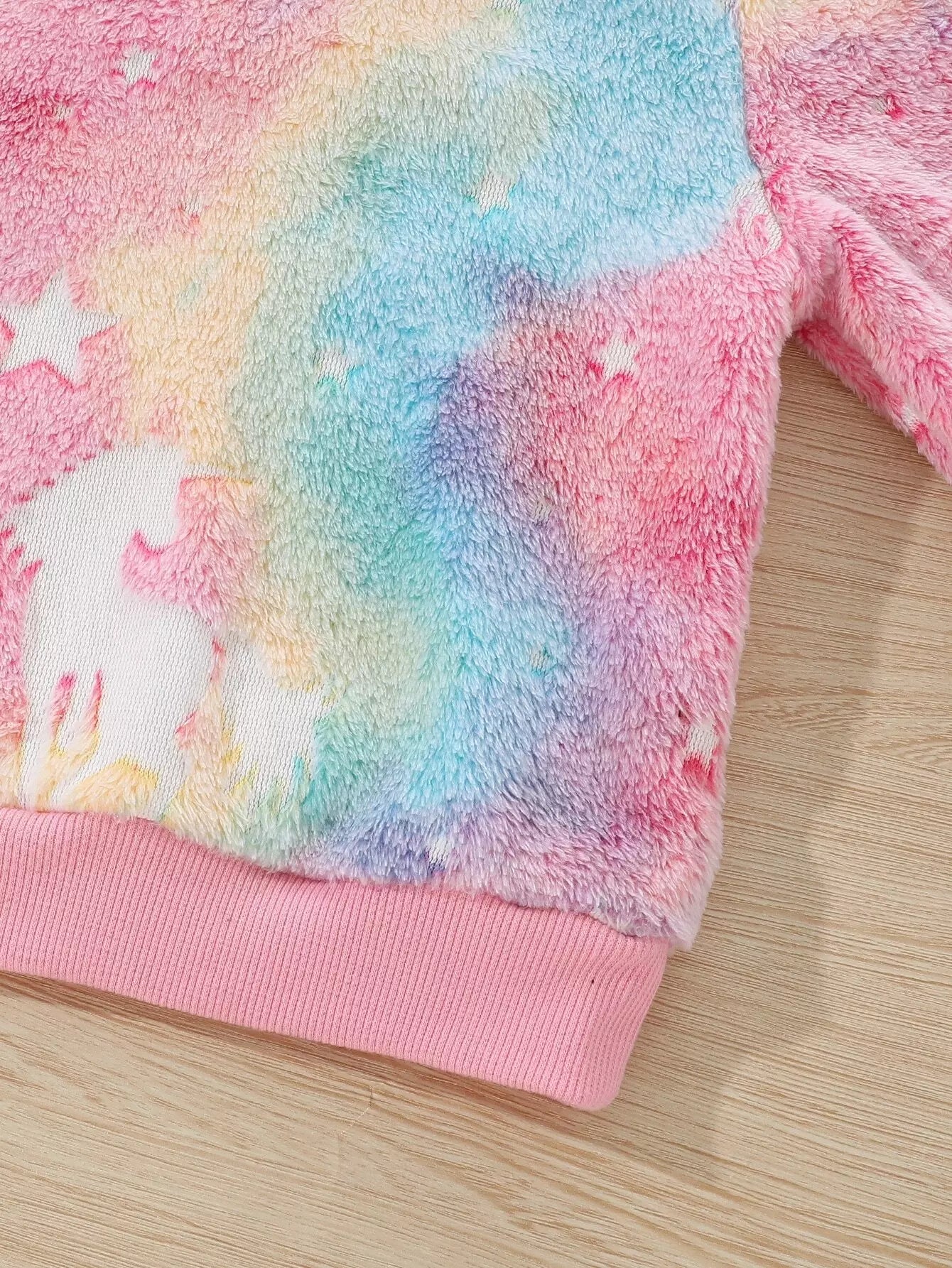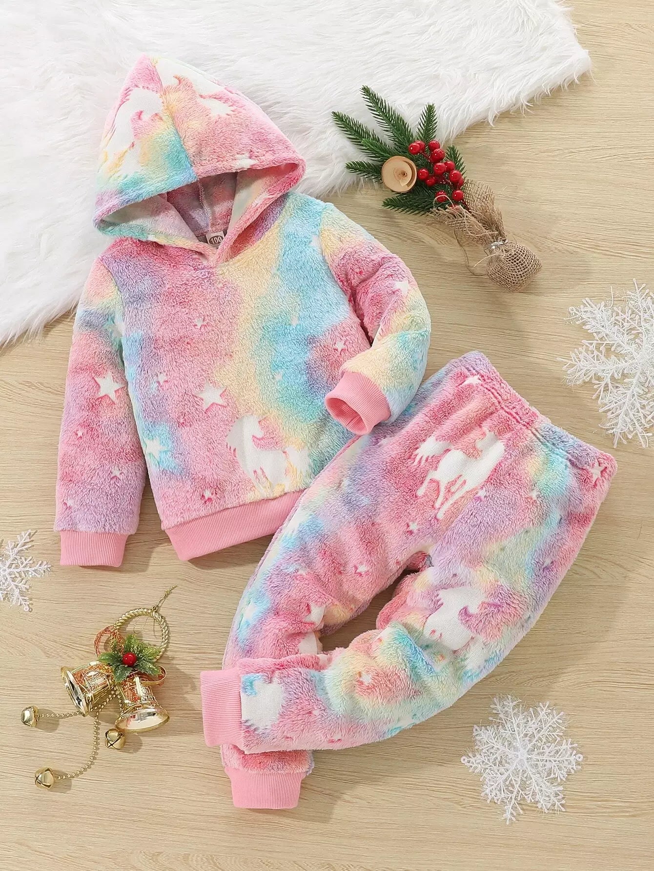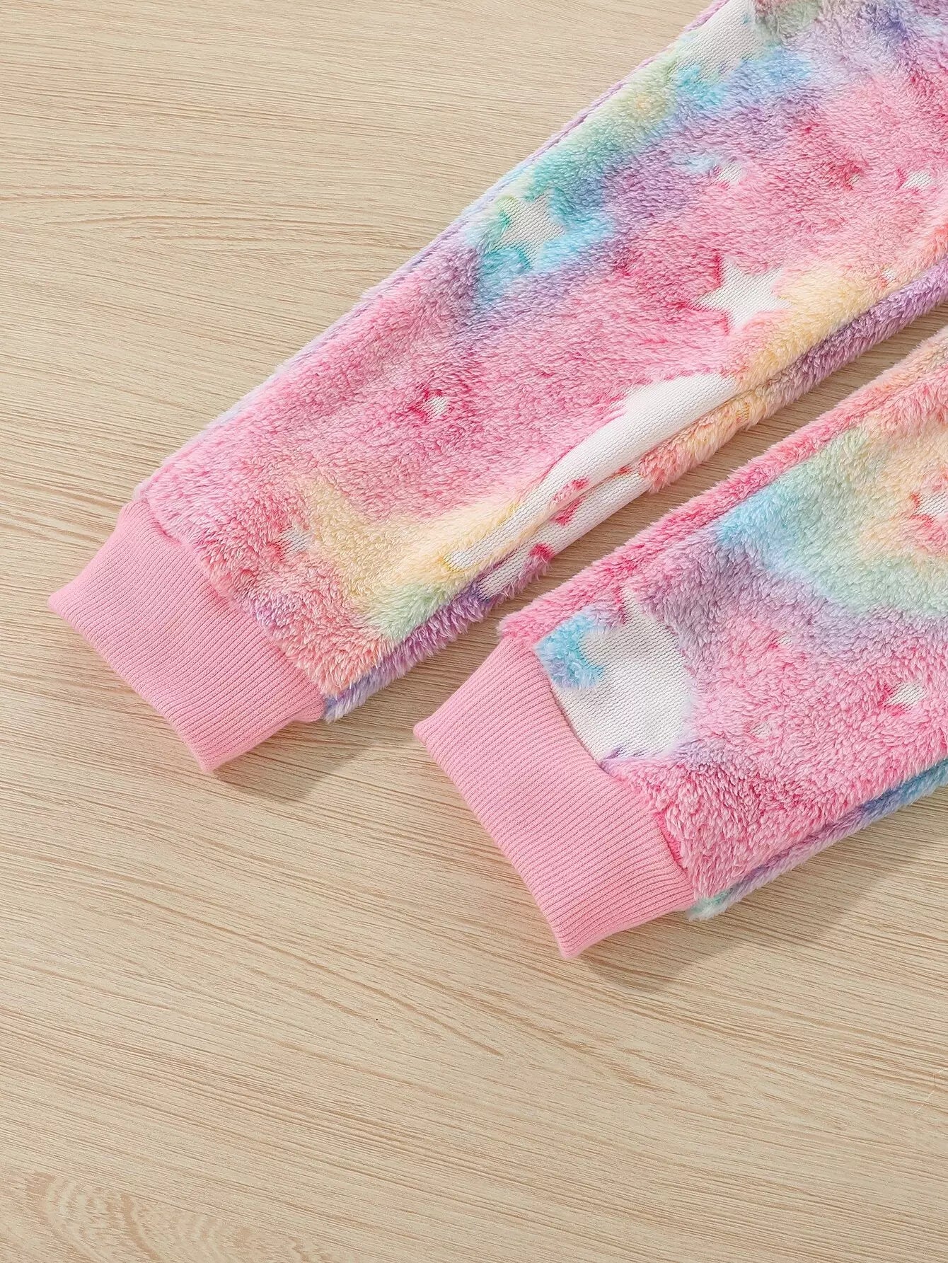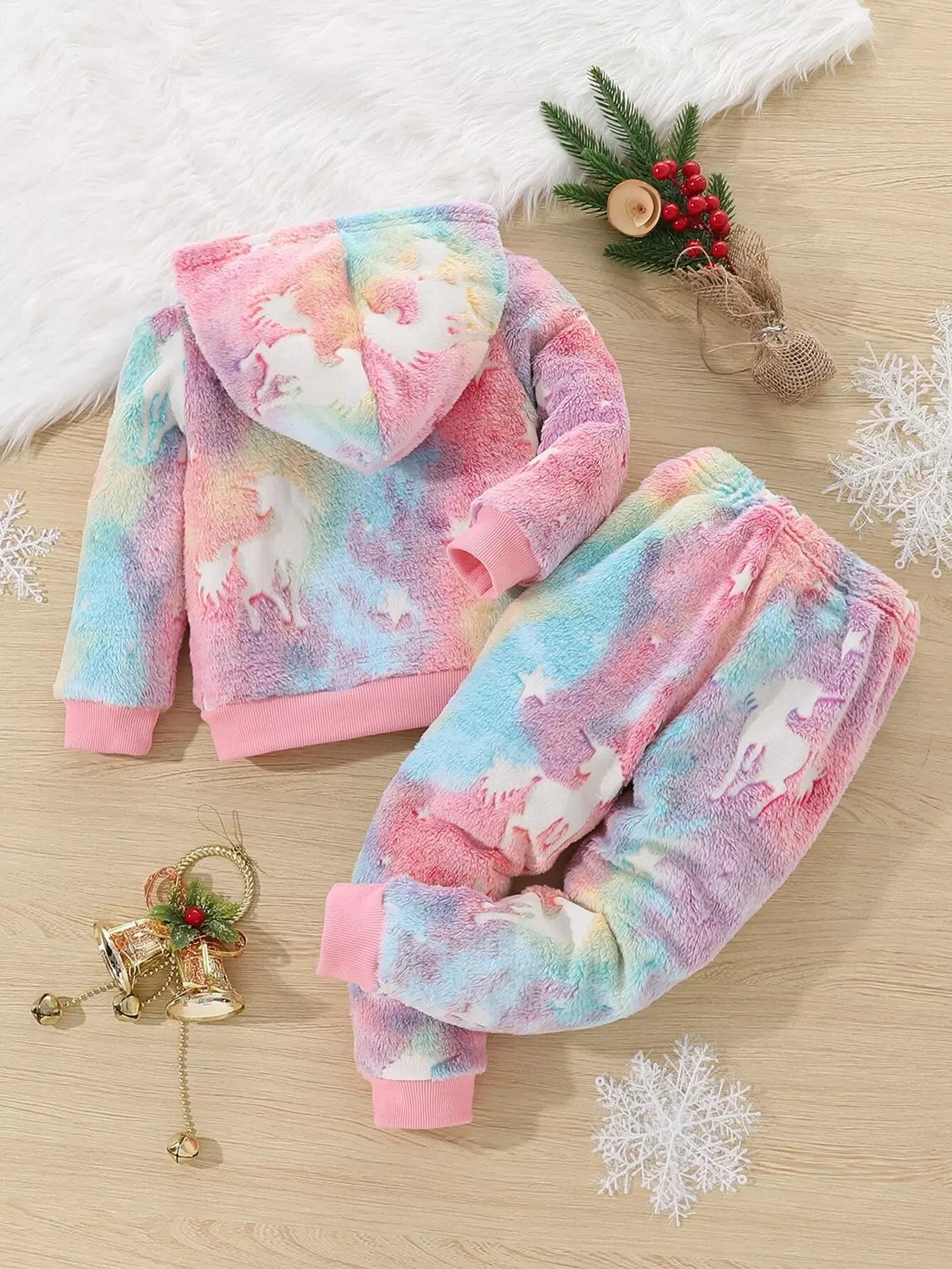 Toddler Girls Tie Dye Star & Unicorn Pattern Teddy Hoodie & Pants