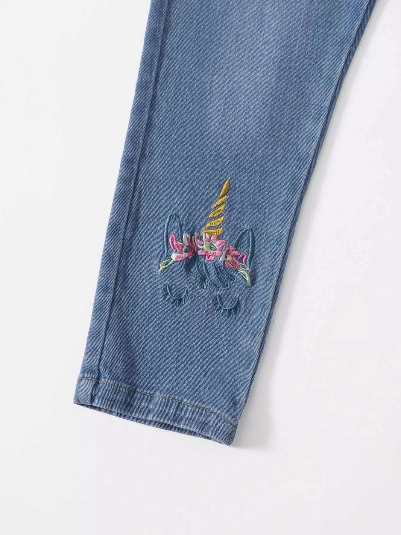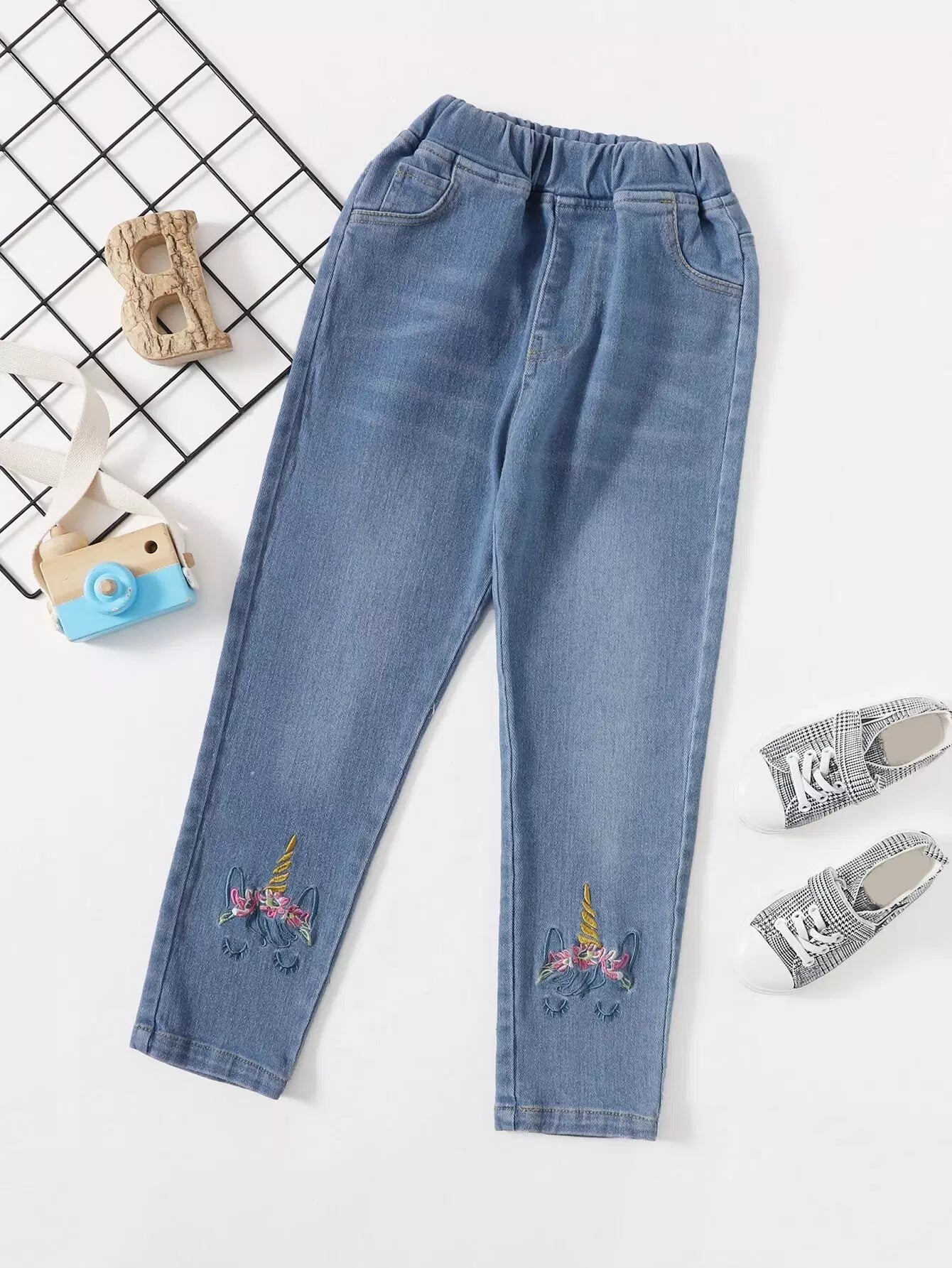 Toddler Girls Unicorn Embroidery Elastic Waist Tapered Jeans