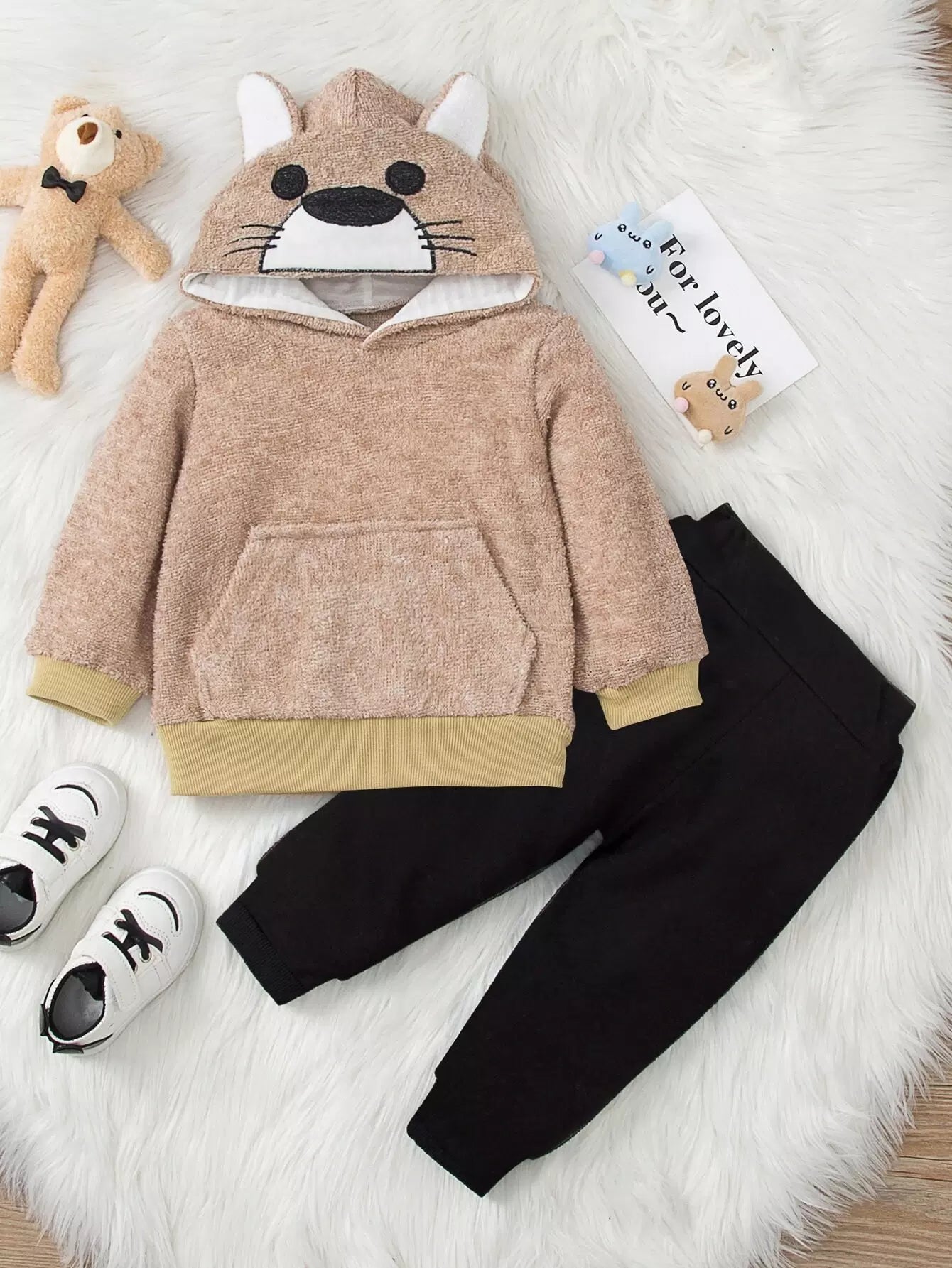 Toddler Boys Cartoon Embroidery 3D Ears Design Teddy Hoodie & Pants