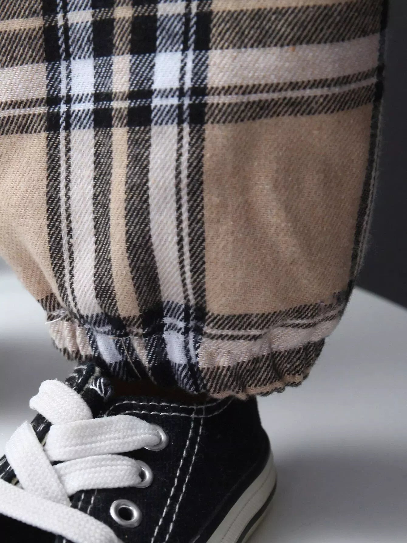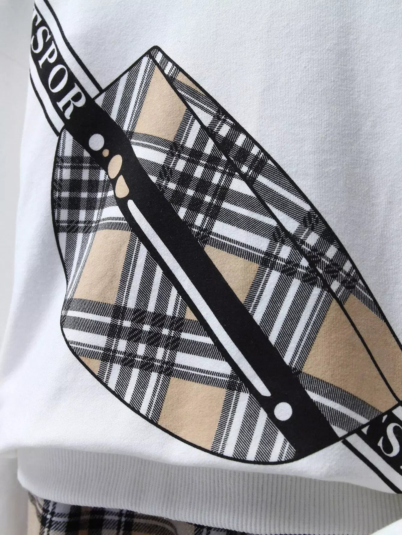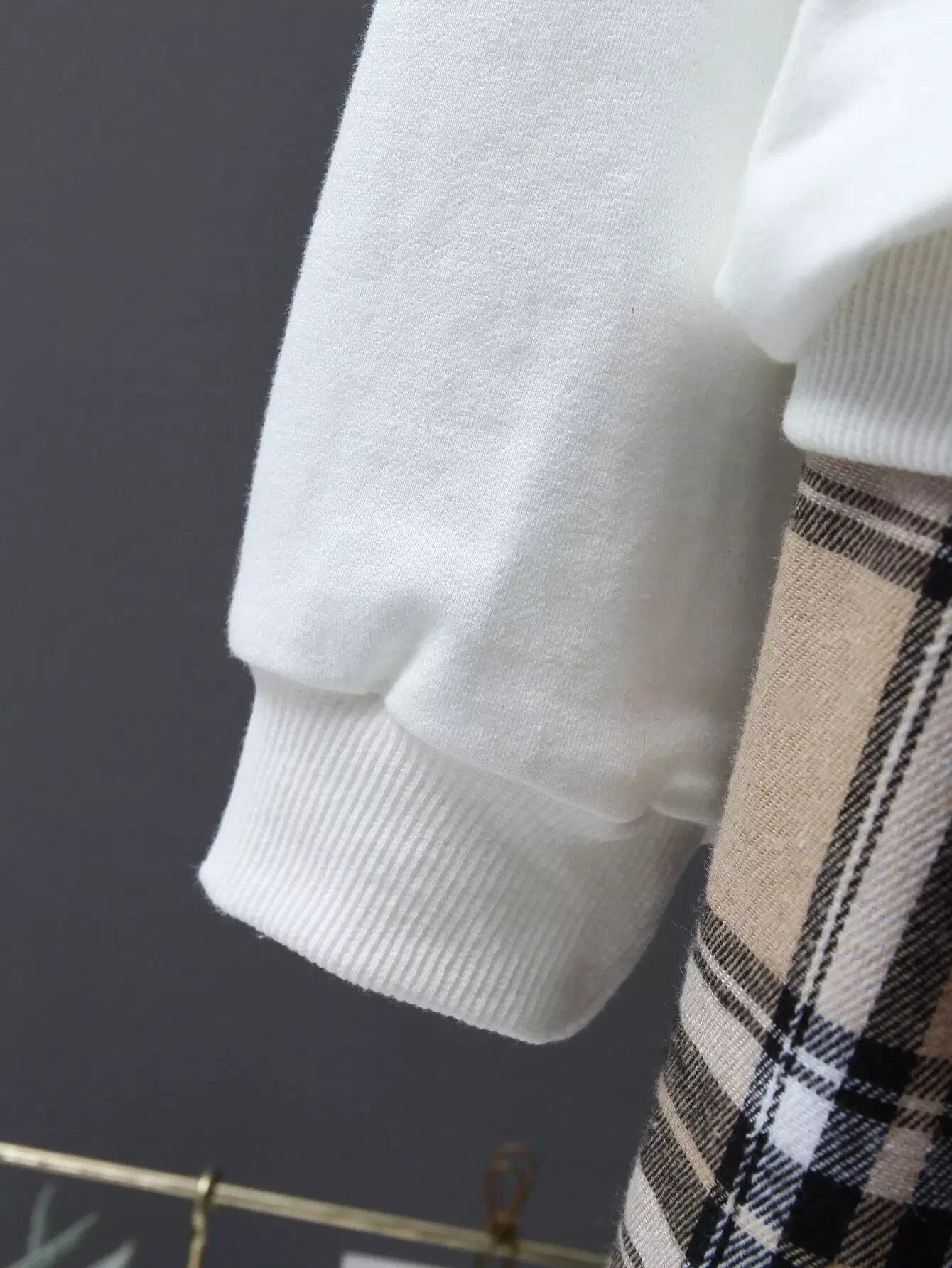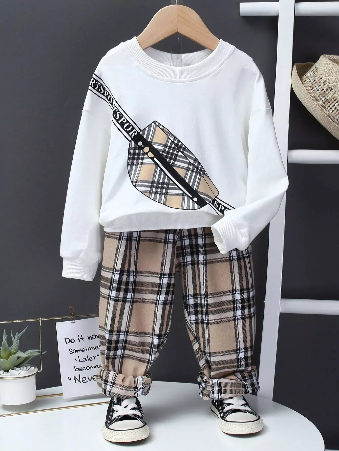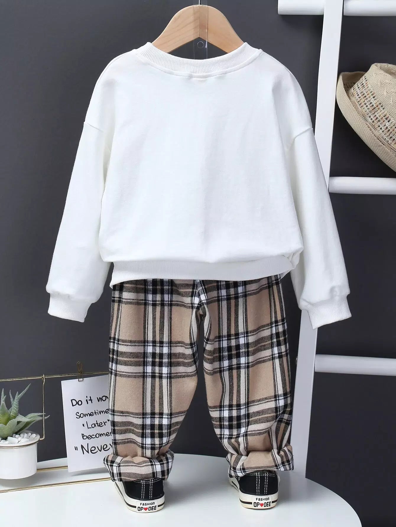 Toddler Boys Letter And Bag Print Drop Shoulder Sweatshirt & Plaid Sweatpants