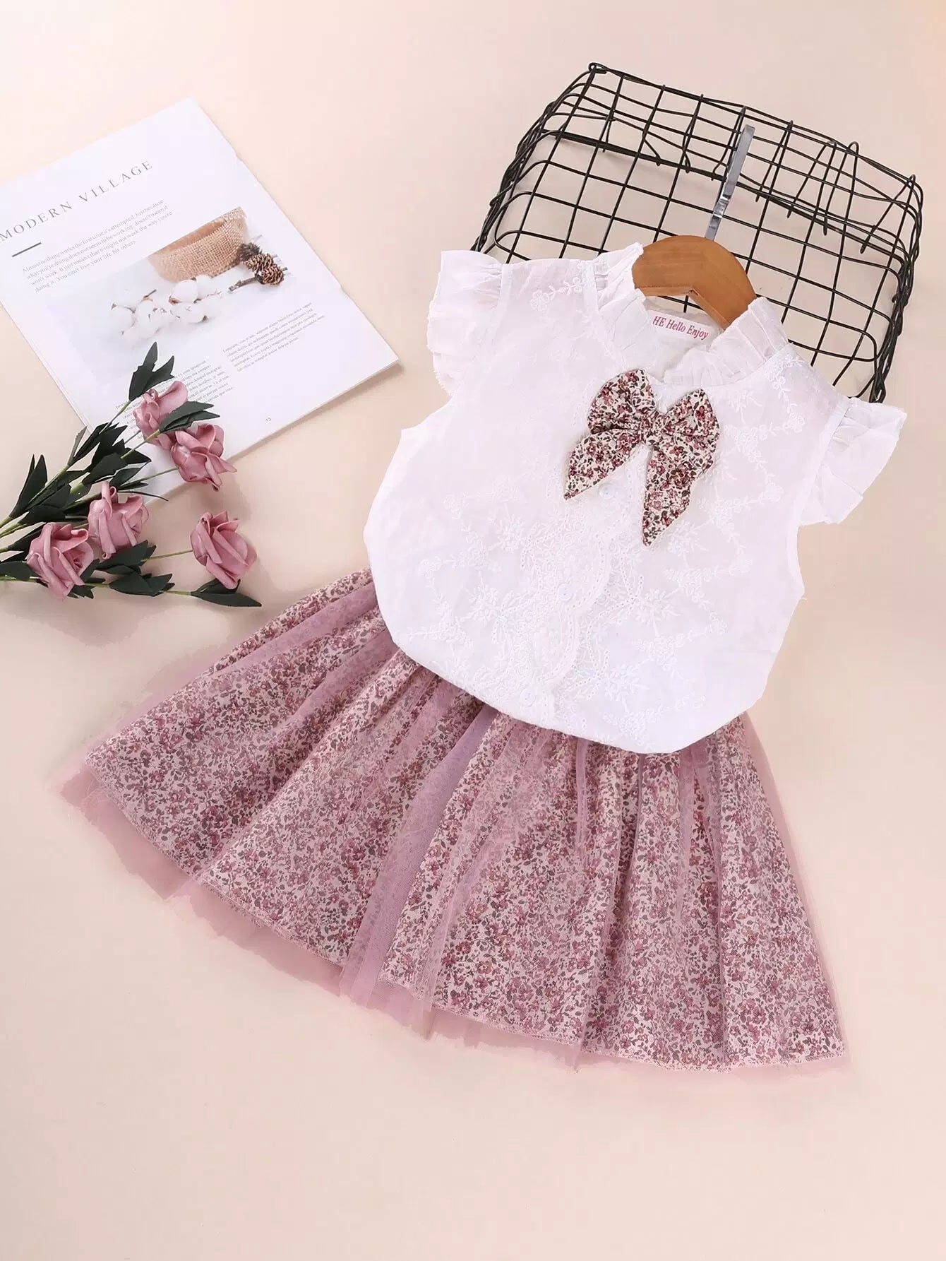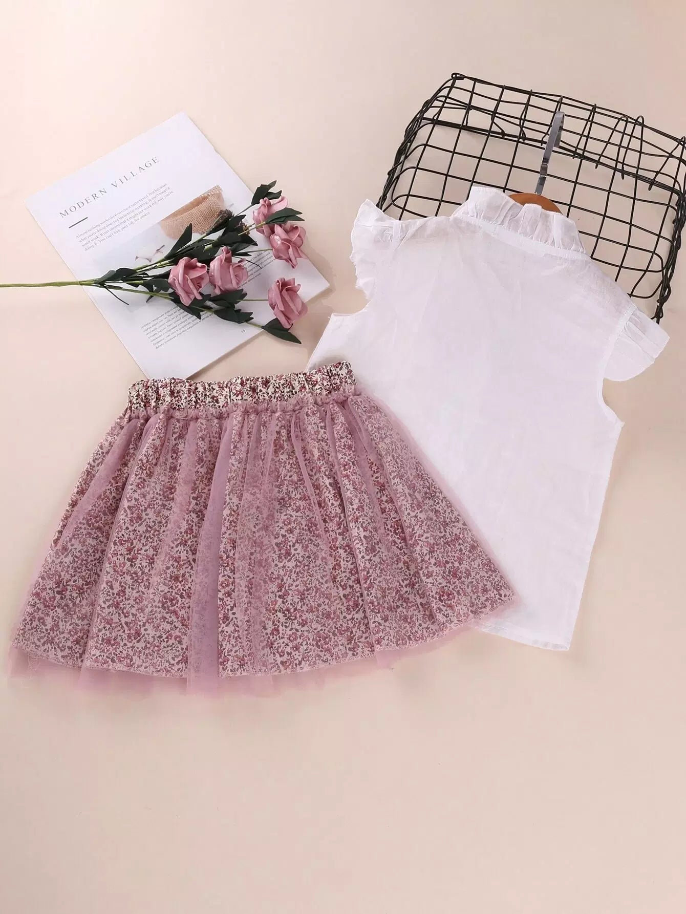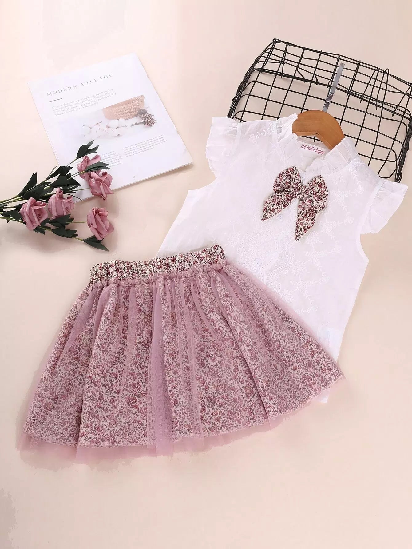 Toddler Girls Bow Front Blouse & Ditsy Floral Mesh Overlay Skirt