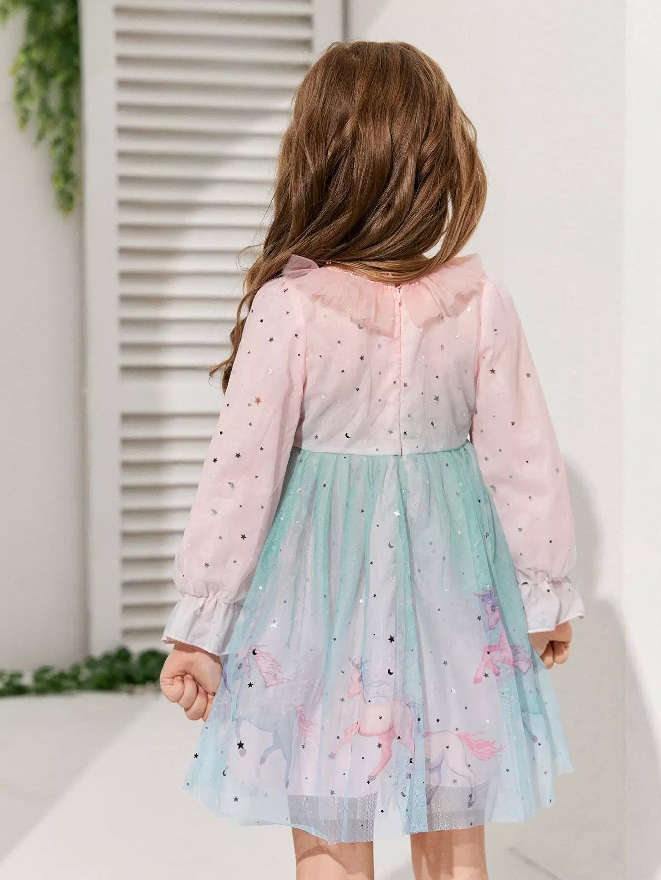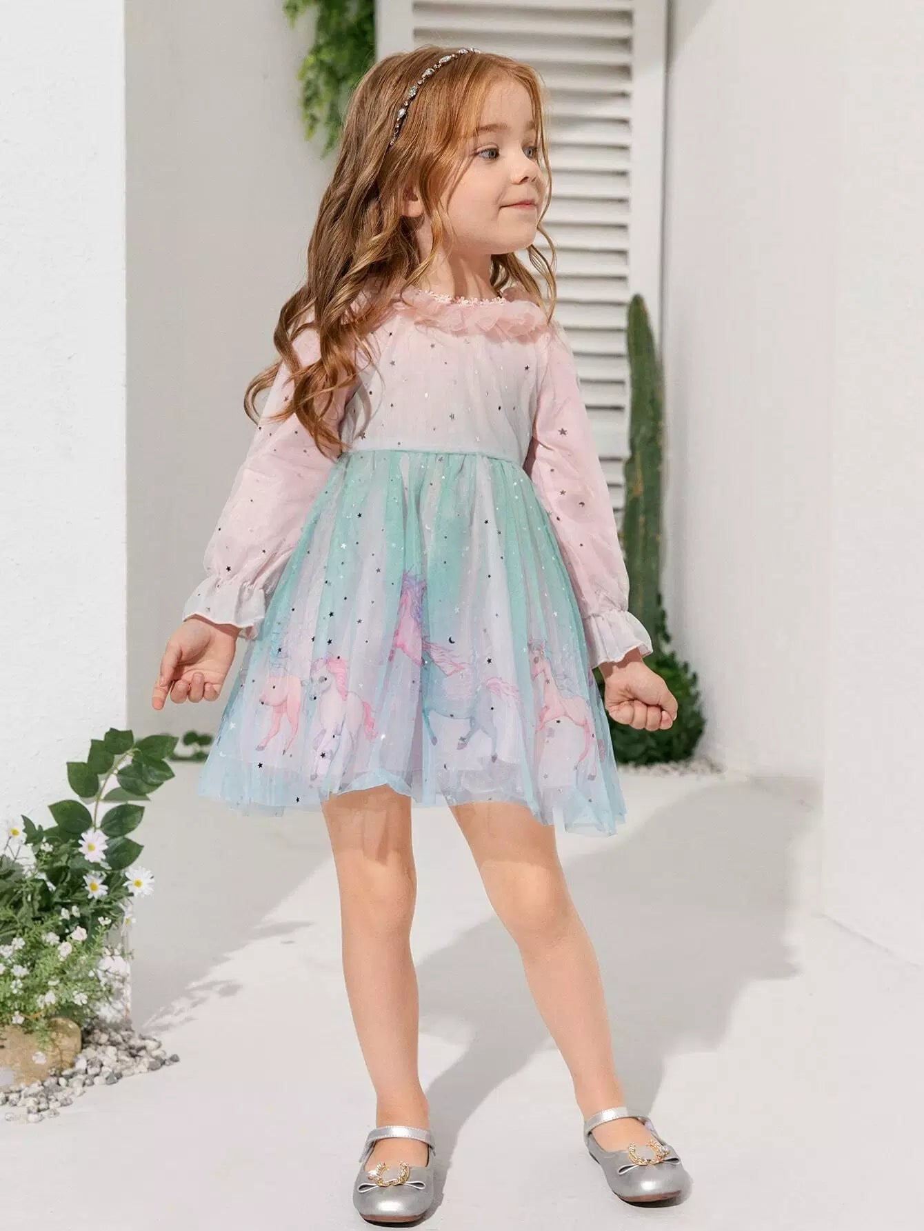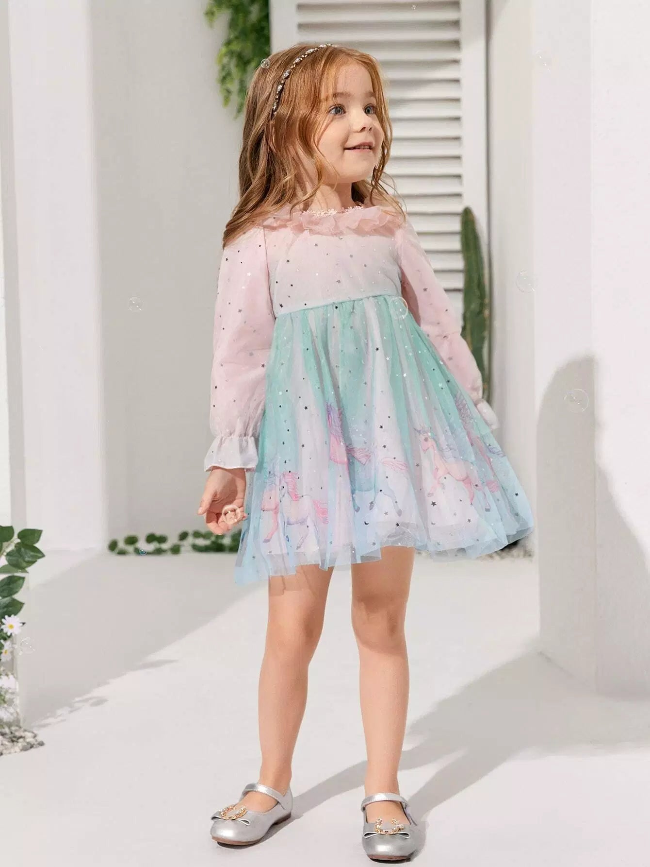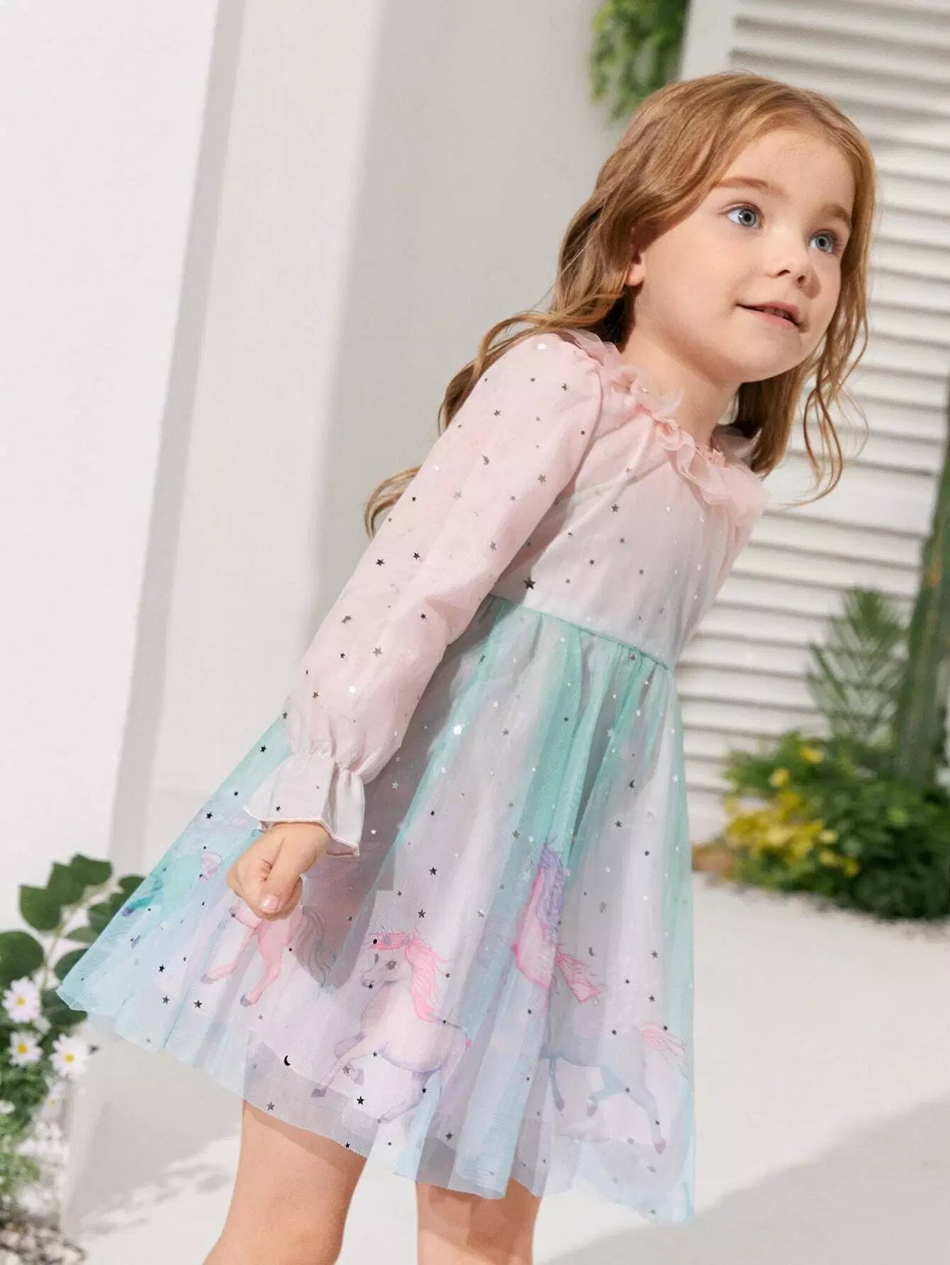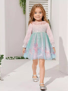 Toddler Girls Cartoon Graphic Flounce Sleeve Ruffle Trim Mesh Dress
