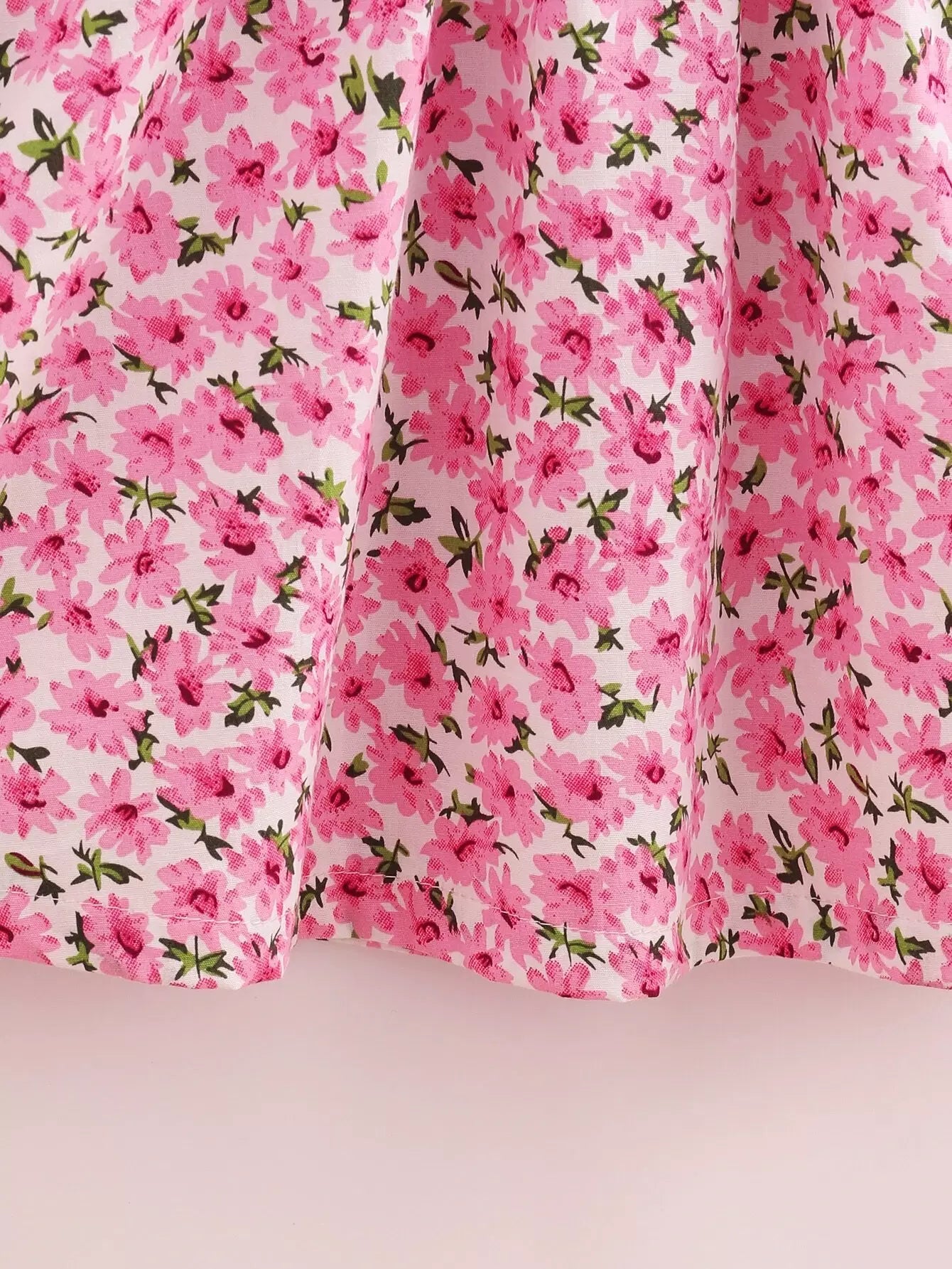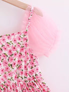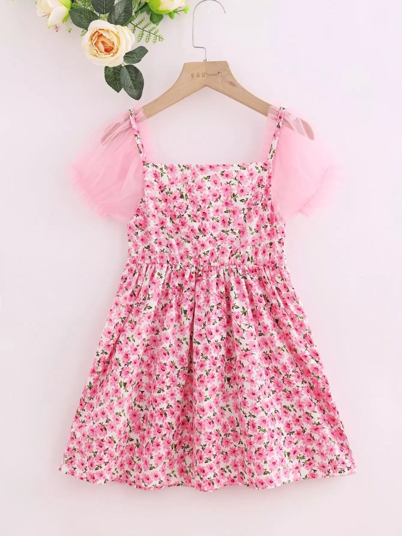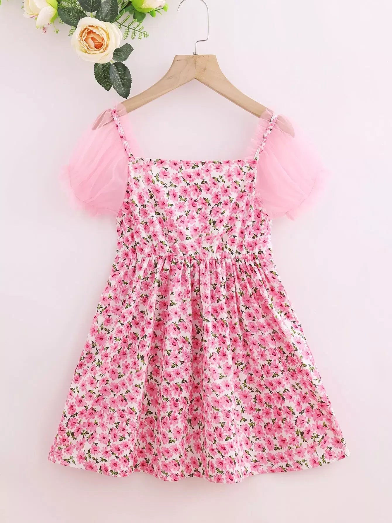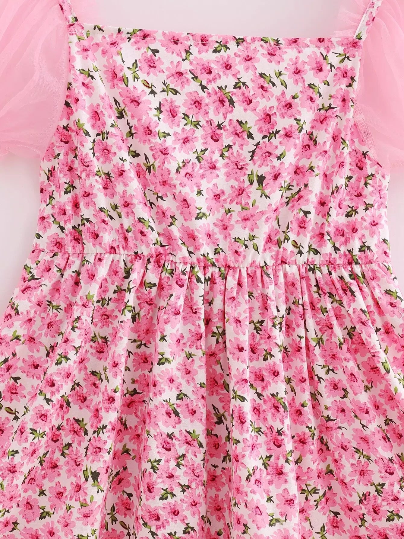 Toddler Girls Floral Contrast Mesh Puff Sleeve Swing Dress