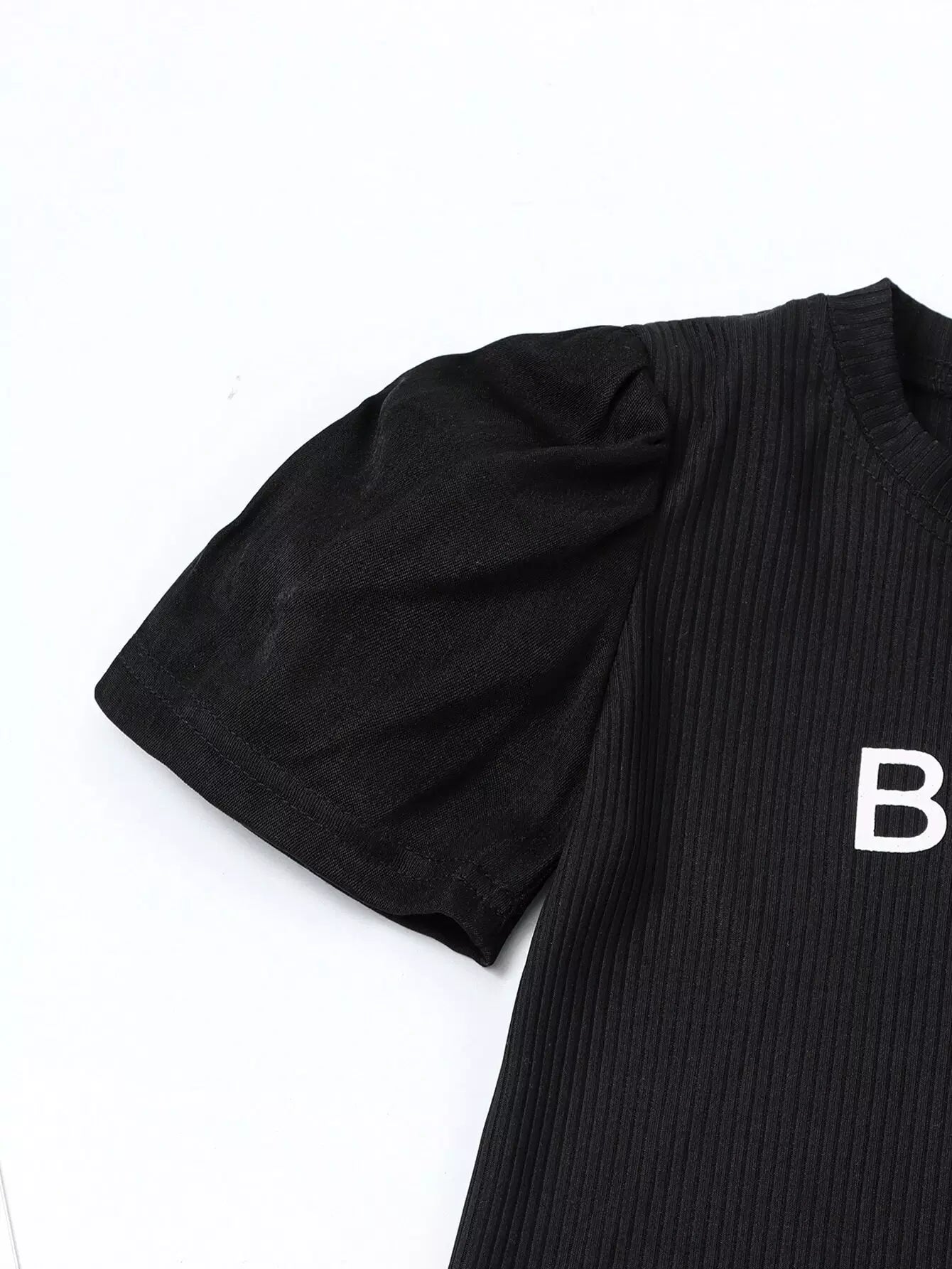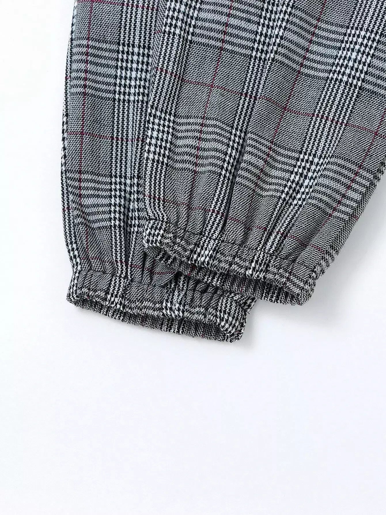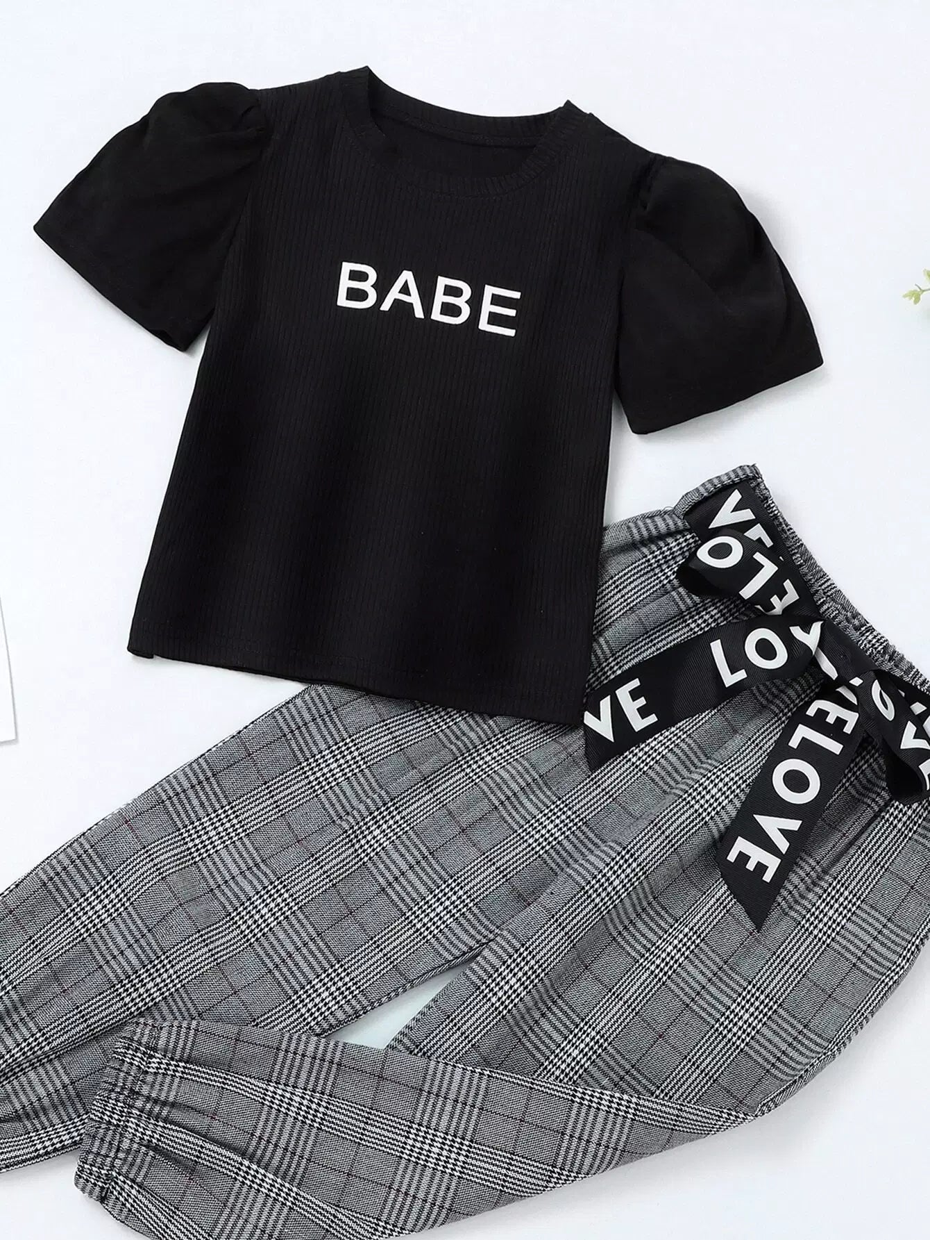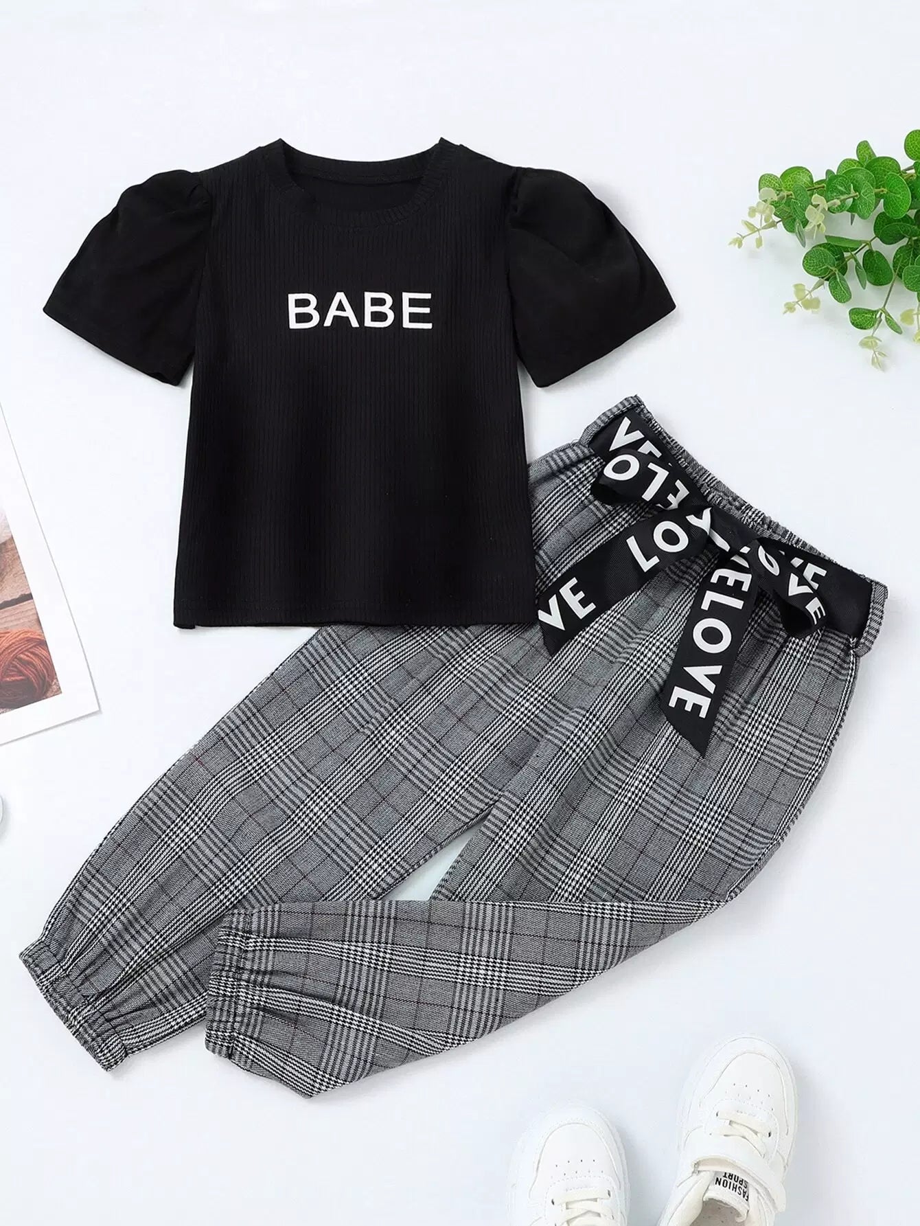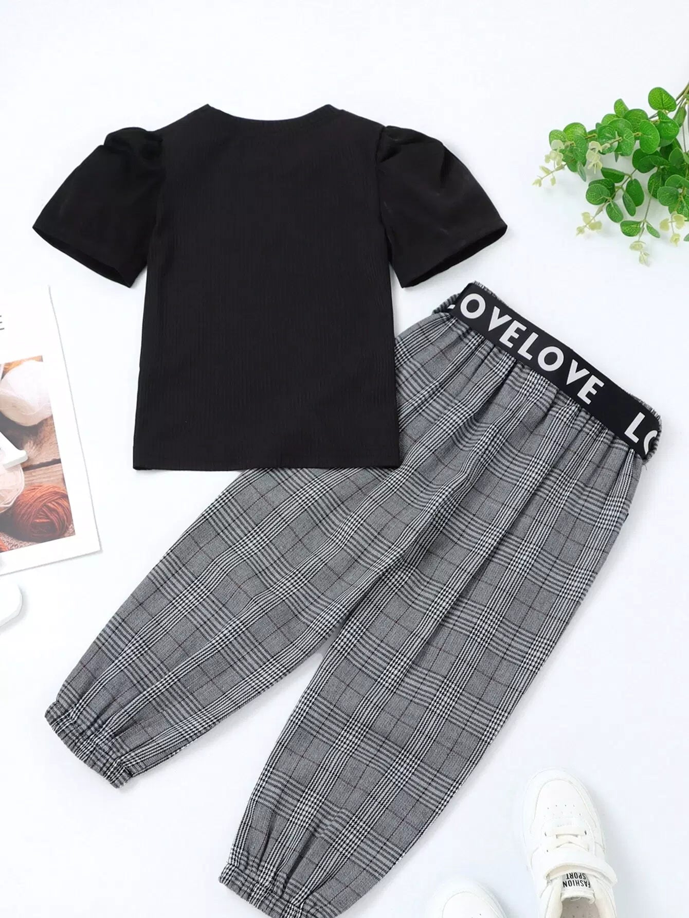 Toddler Girls Letter Graphic Puff Sleeve Tee & Plaid Pants Without Belt