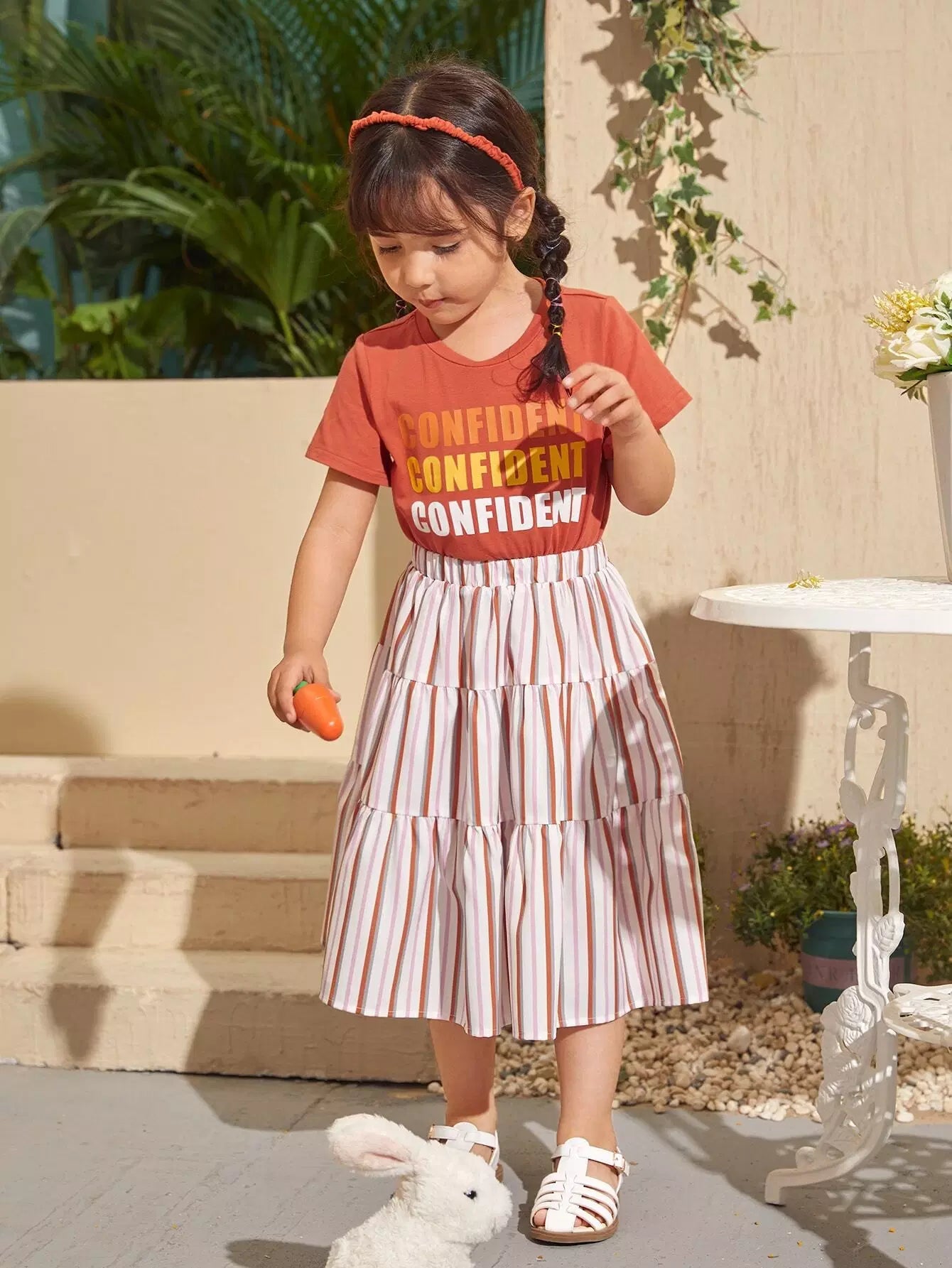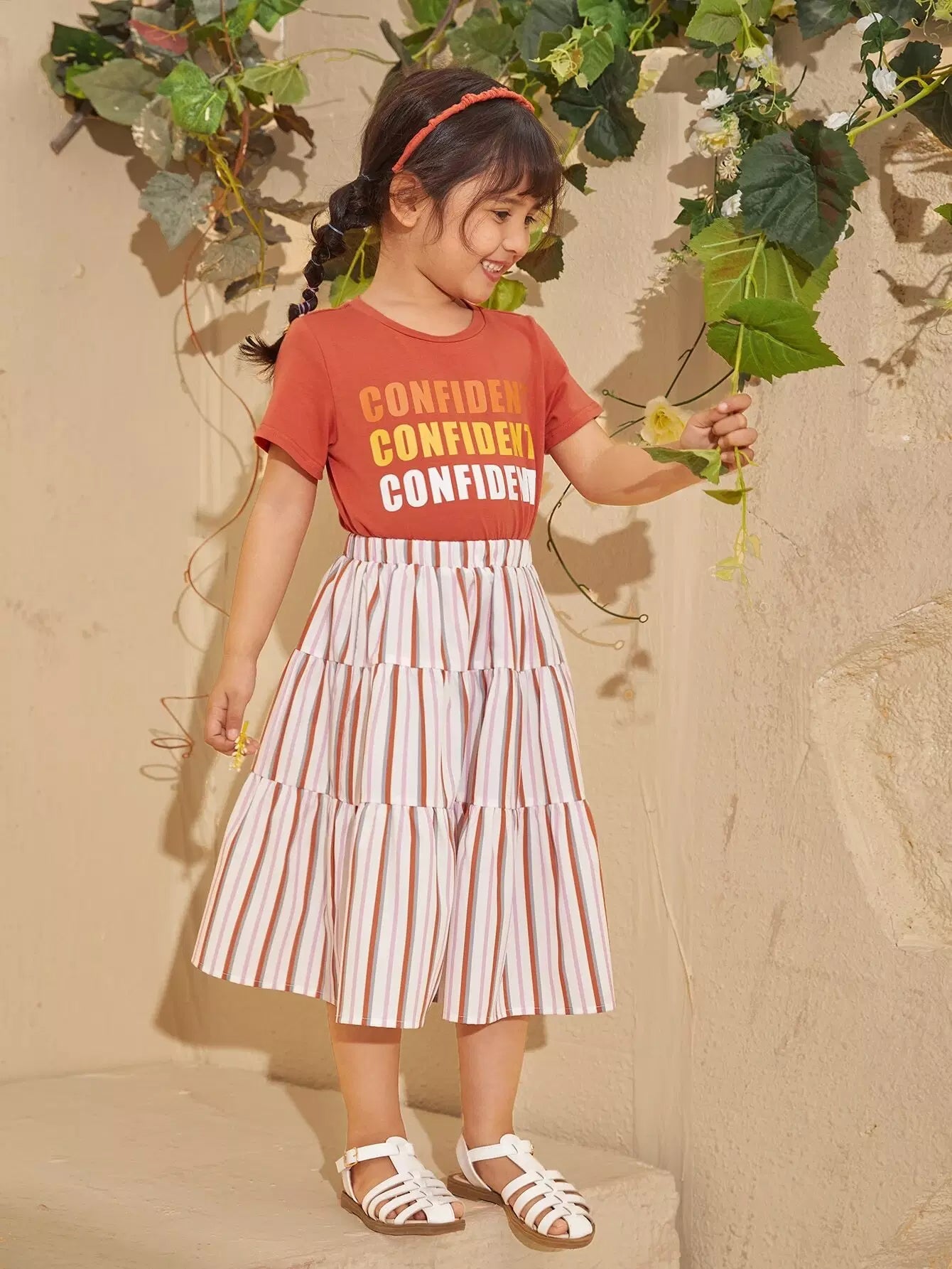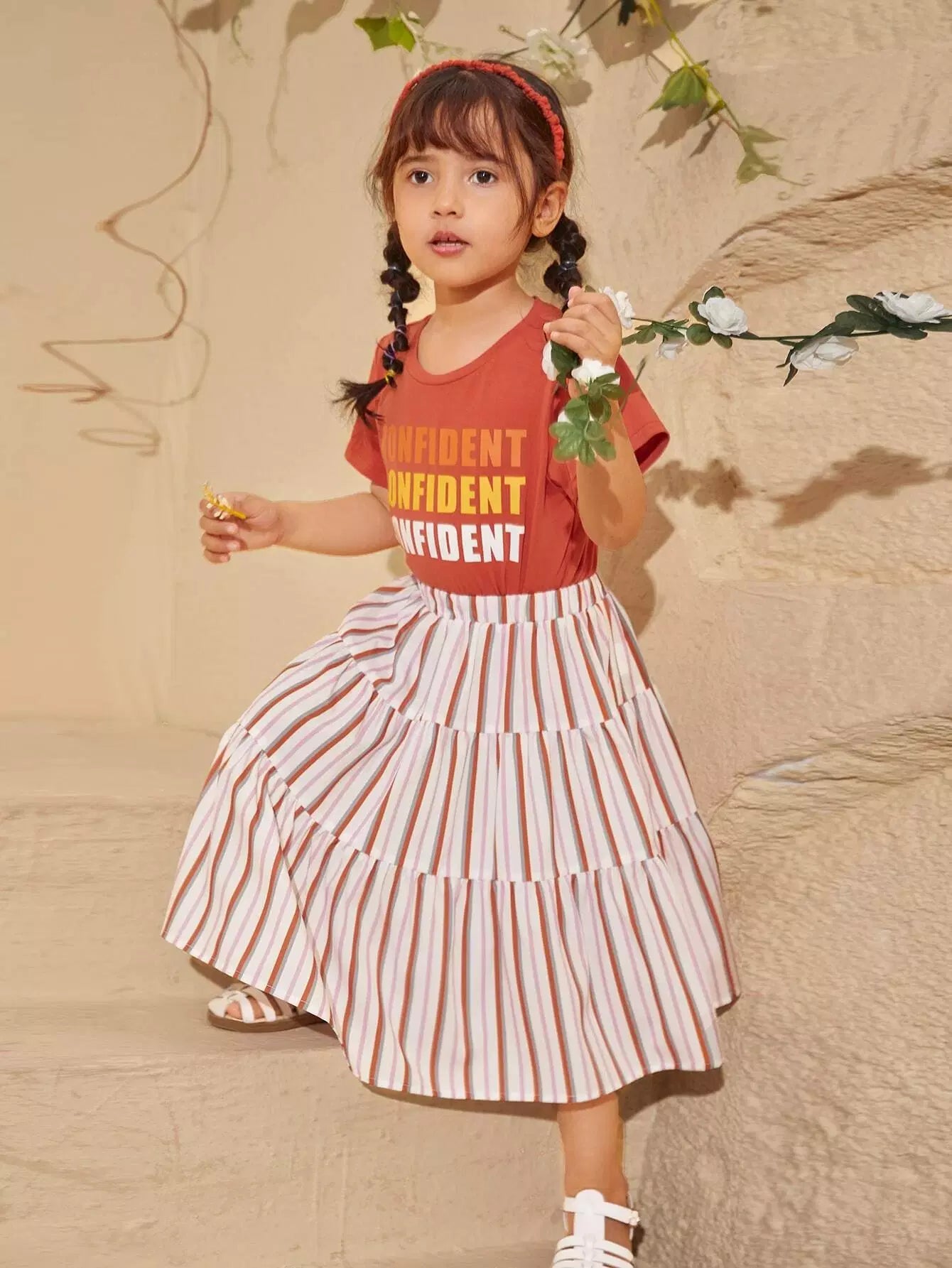 Toddler Girls Letter Graphic Top & Striped Skirt Set