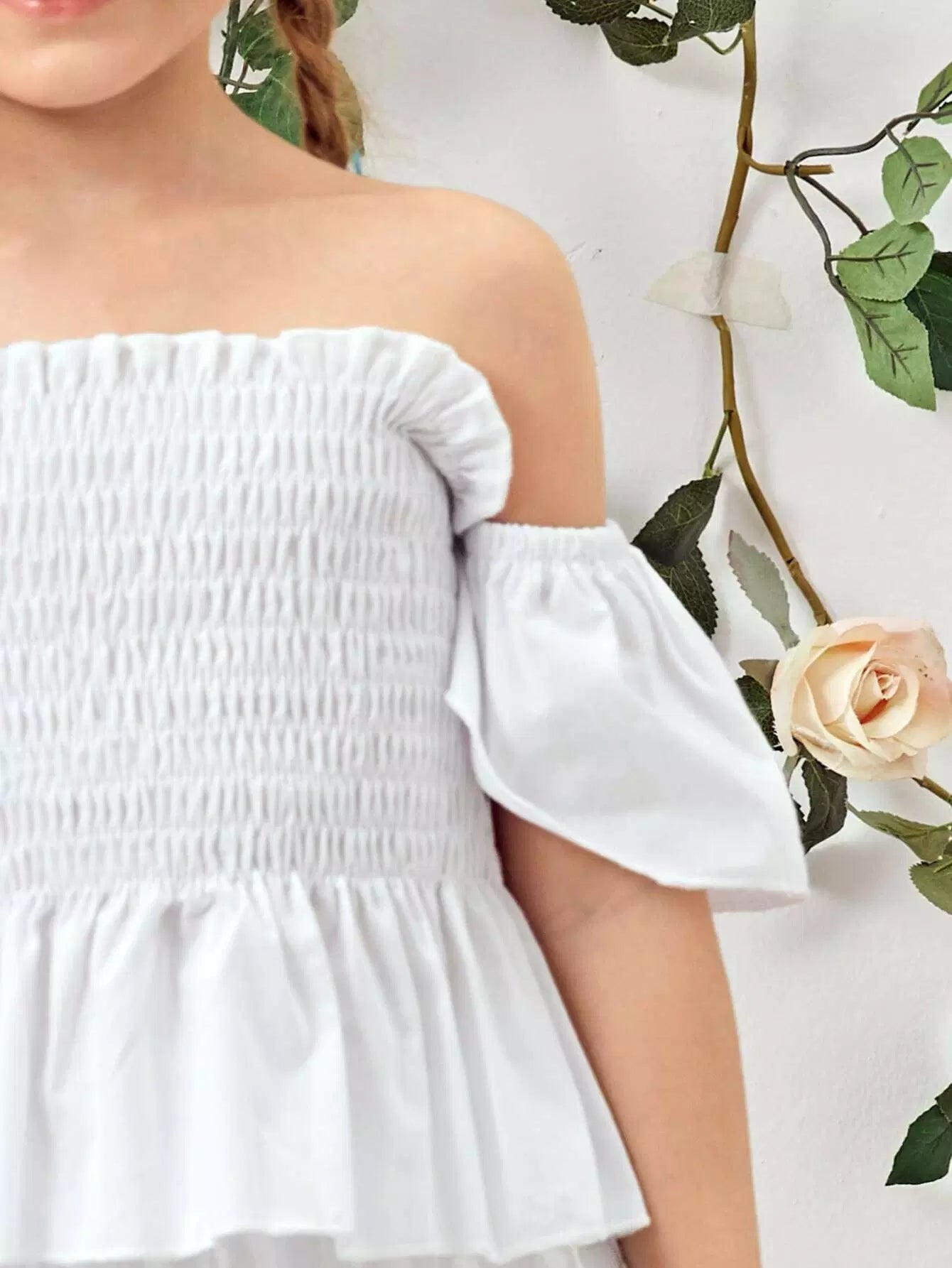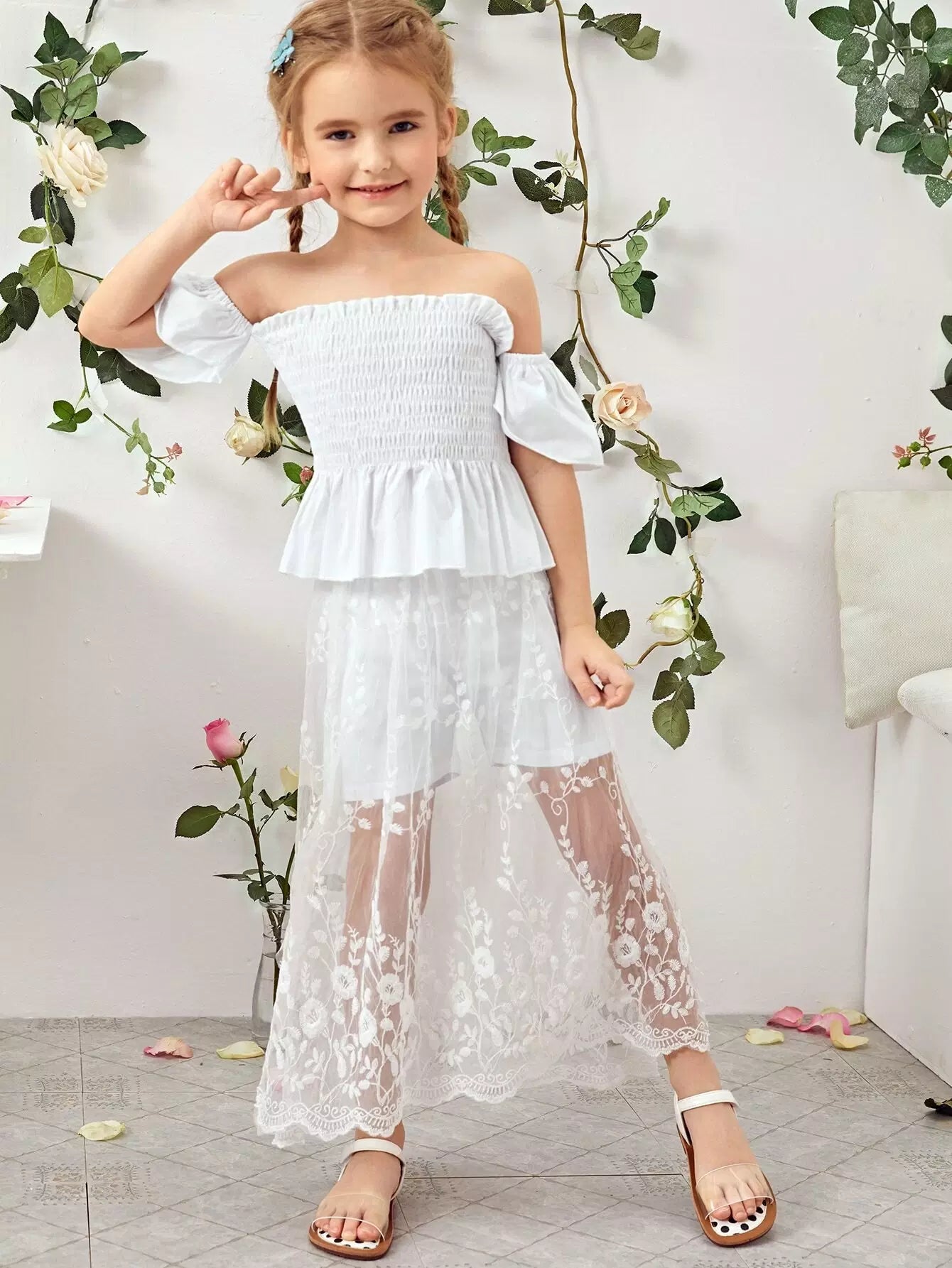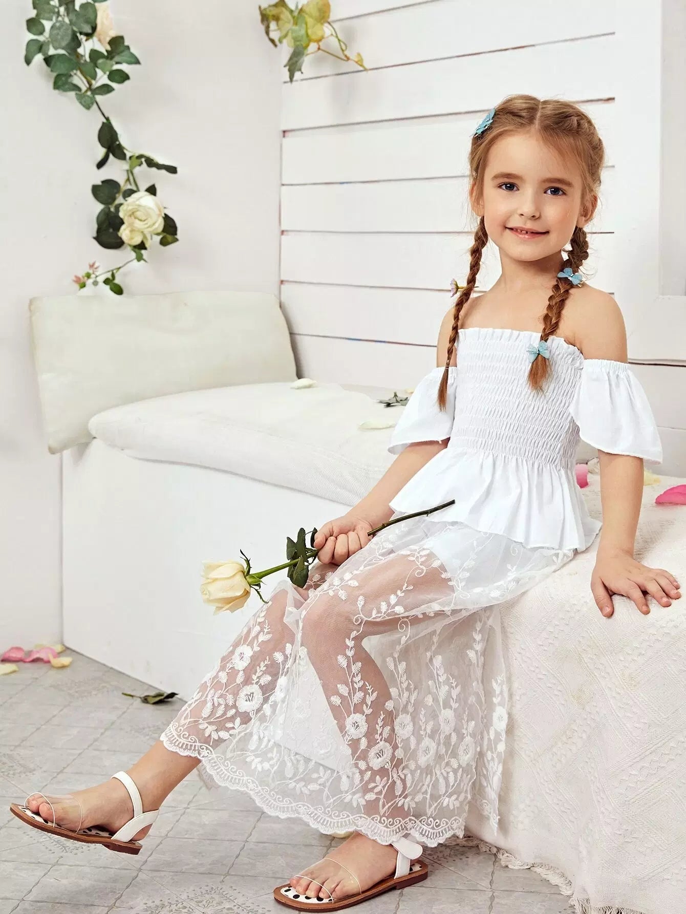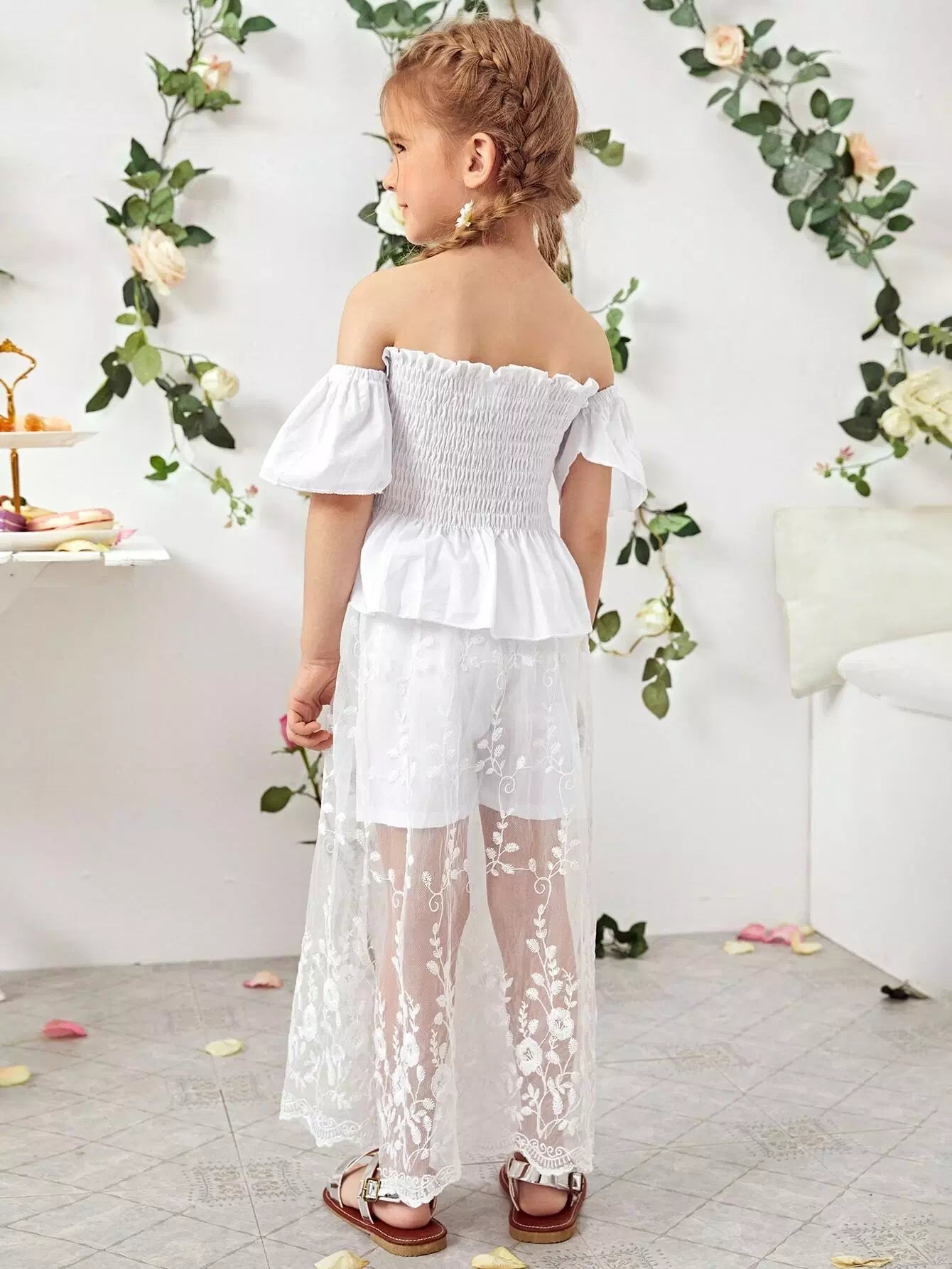 Kids - Toddler Girls Shirred Bardot Peplum Blouse & Embroidery Mesh Skorts