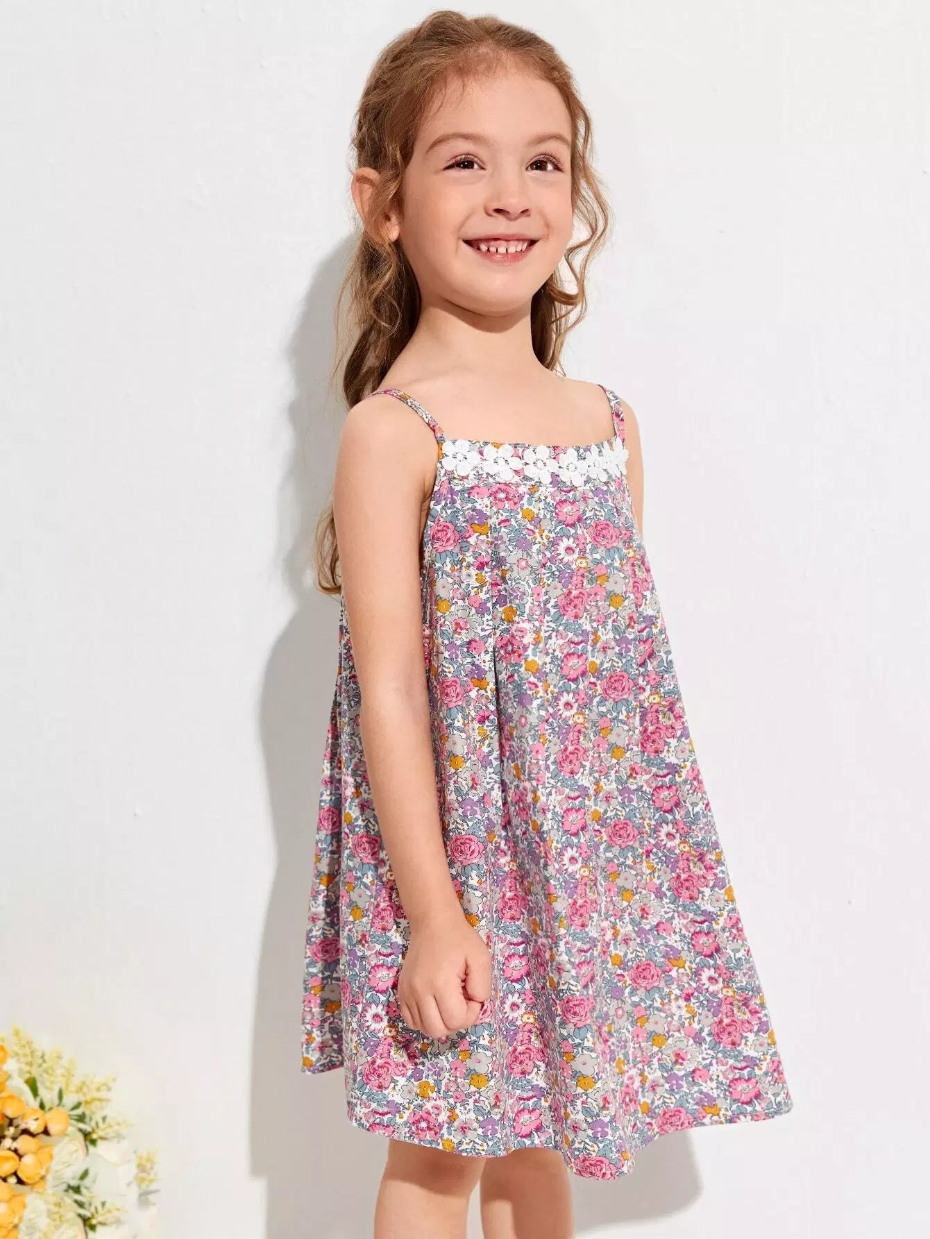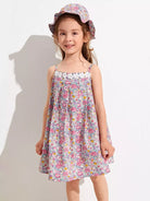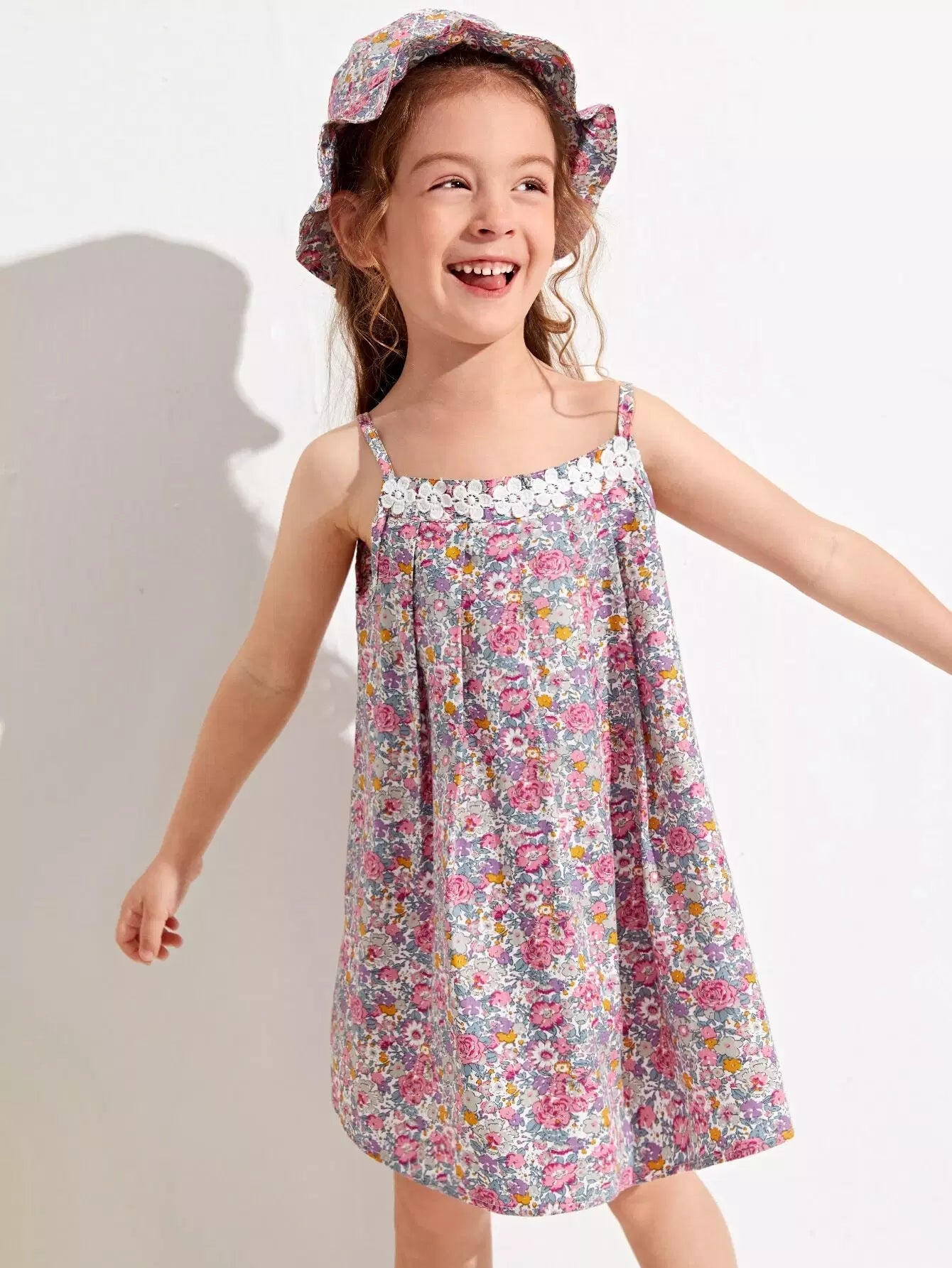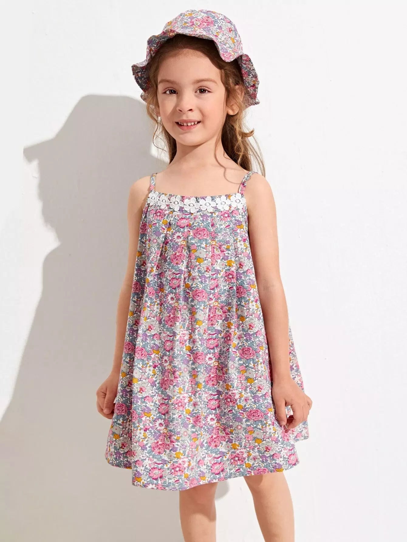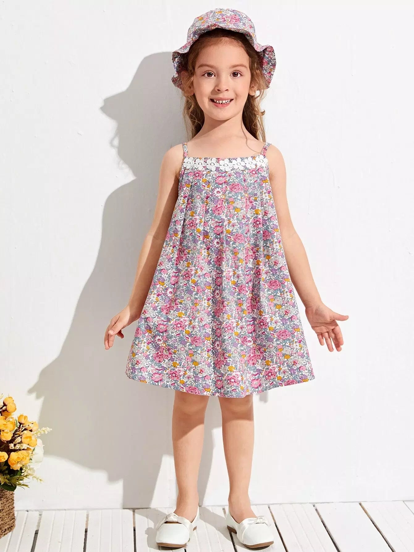Toddler Girls All Over Floral Print Contrast Guipure Lace Cami Dress With Hat