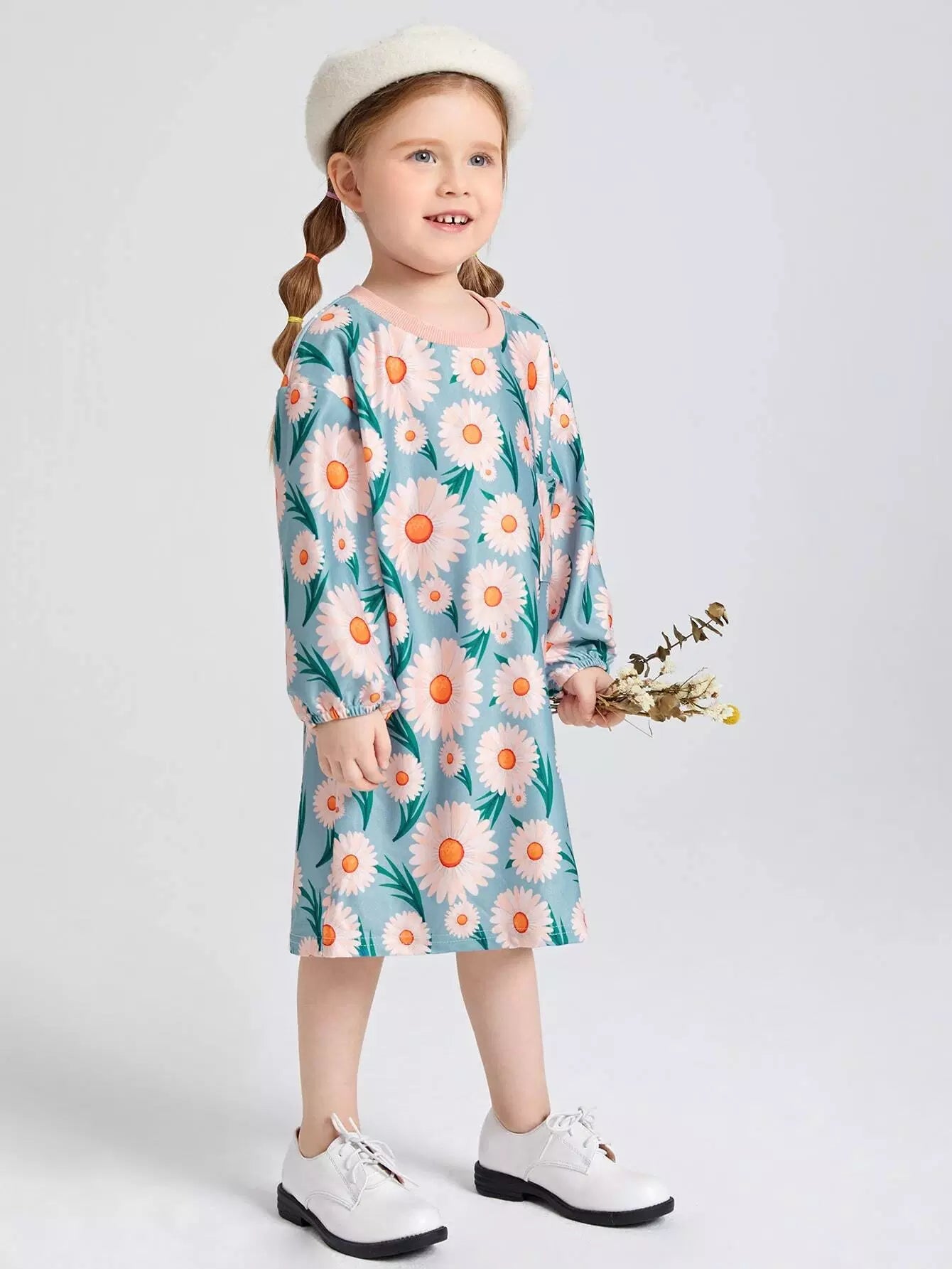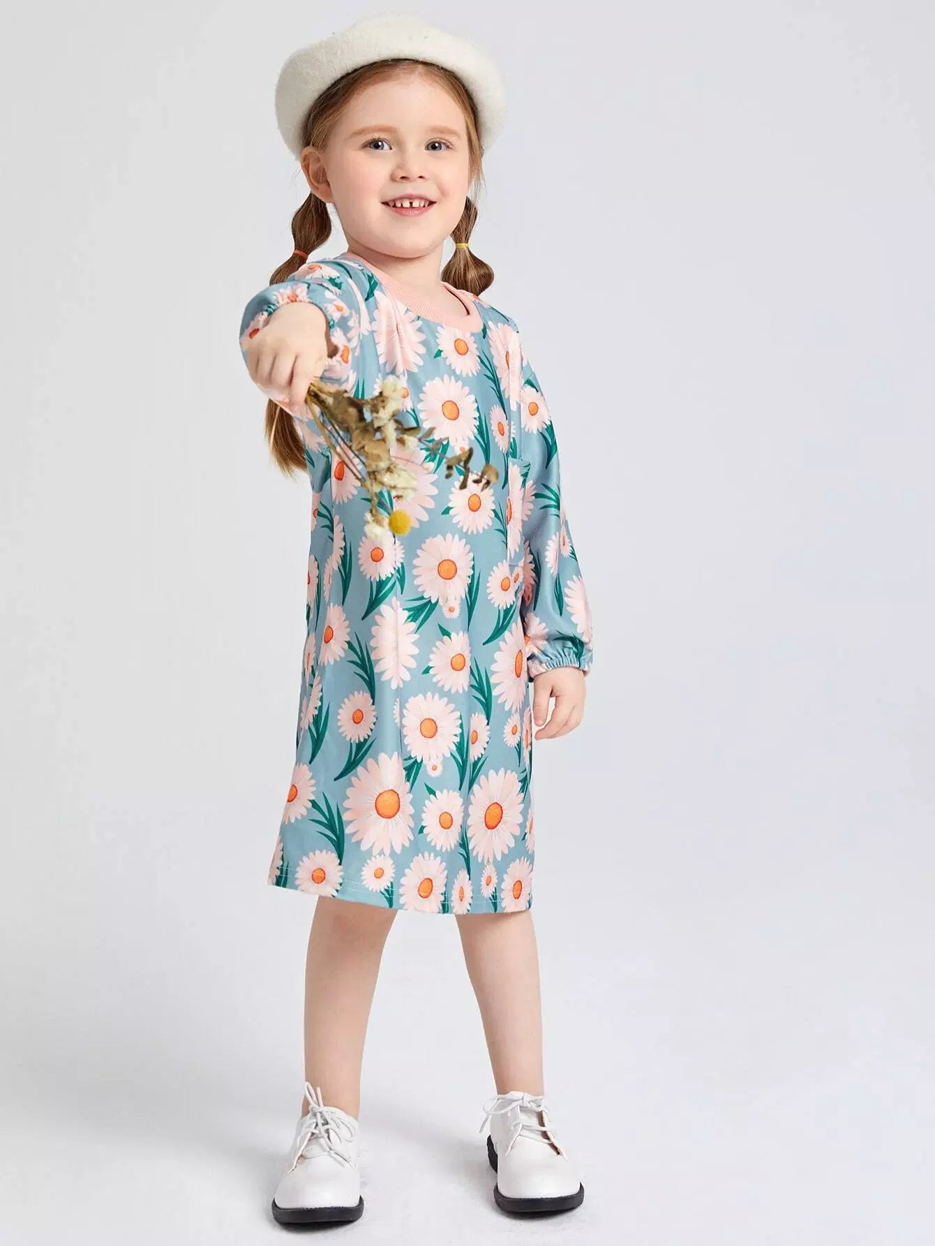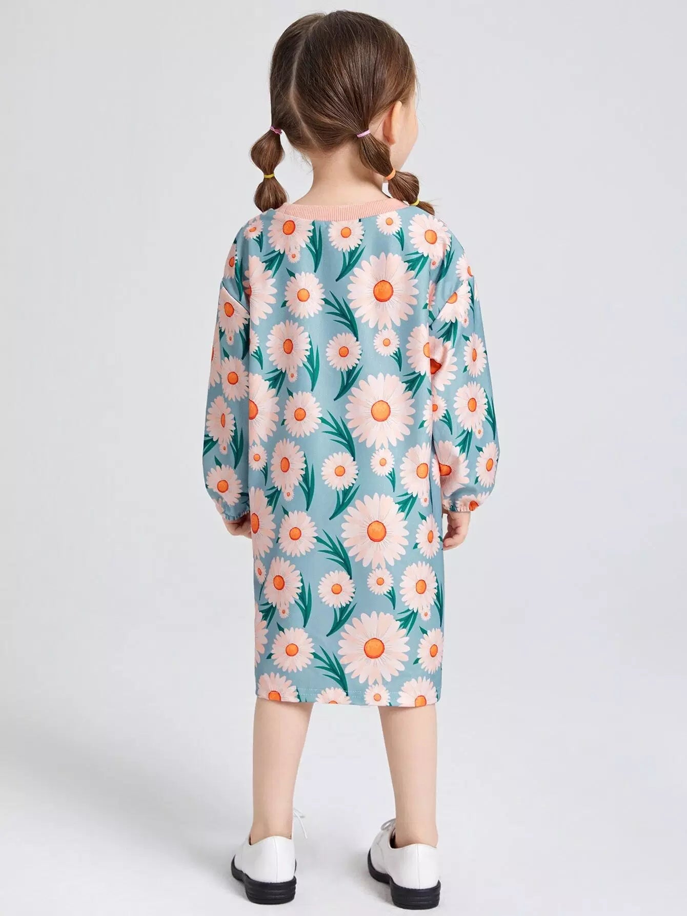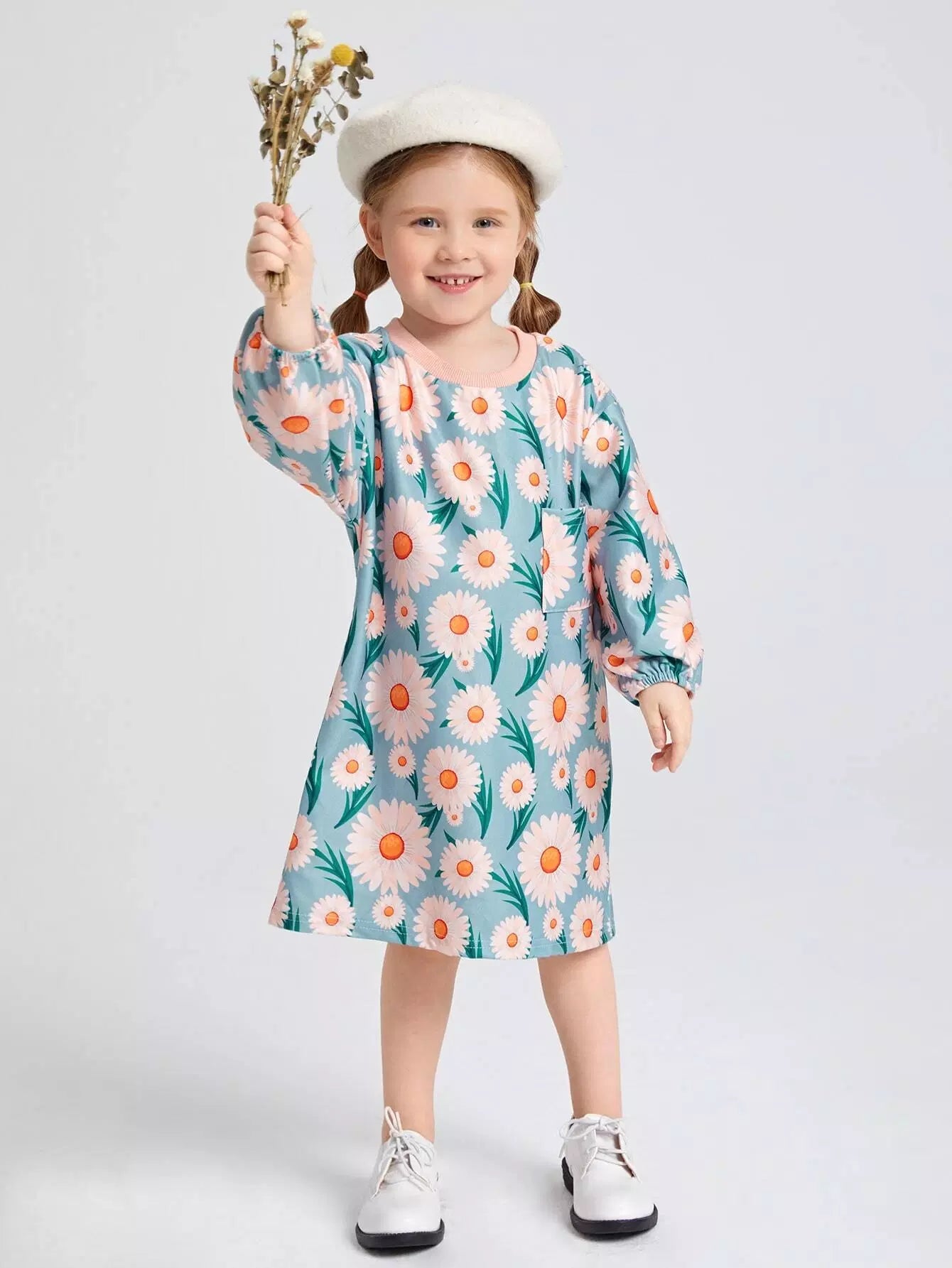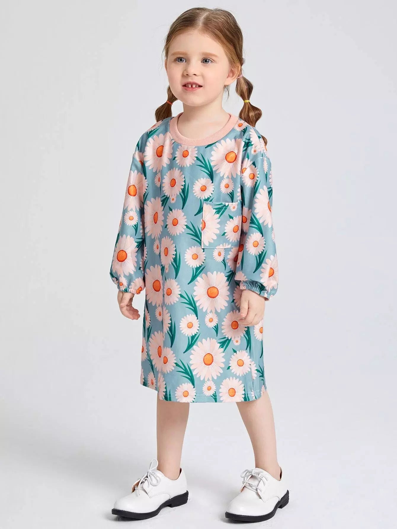 Toddler Girls Floral Print Lantern Sleeve Patched Pocket Dress