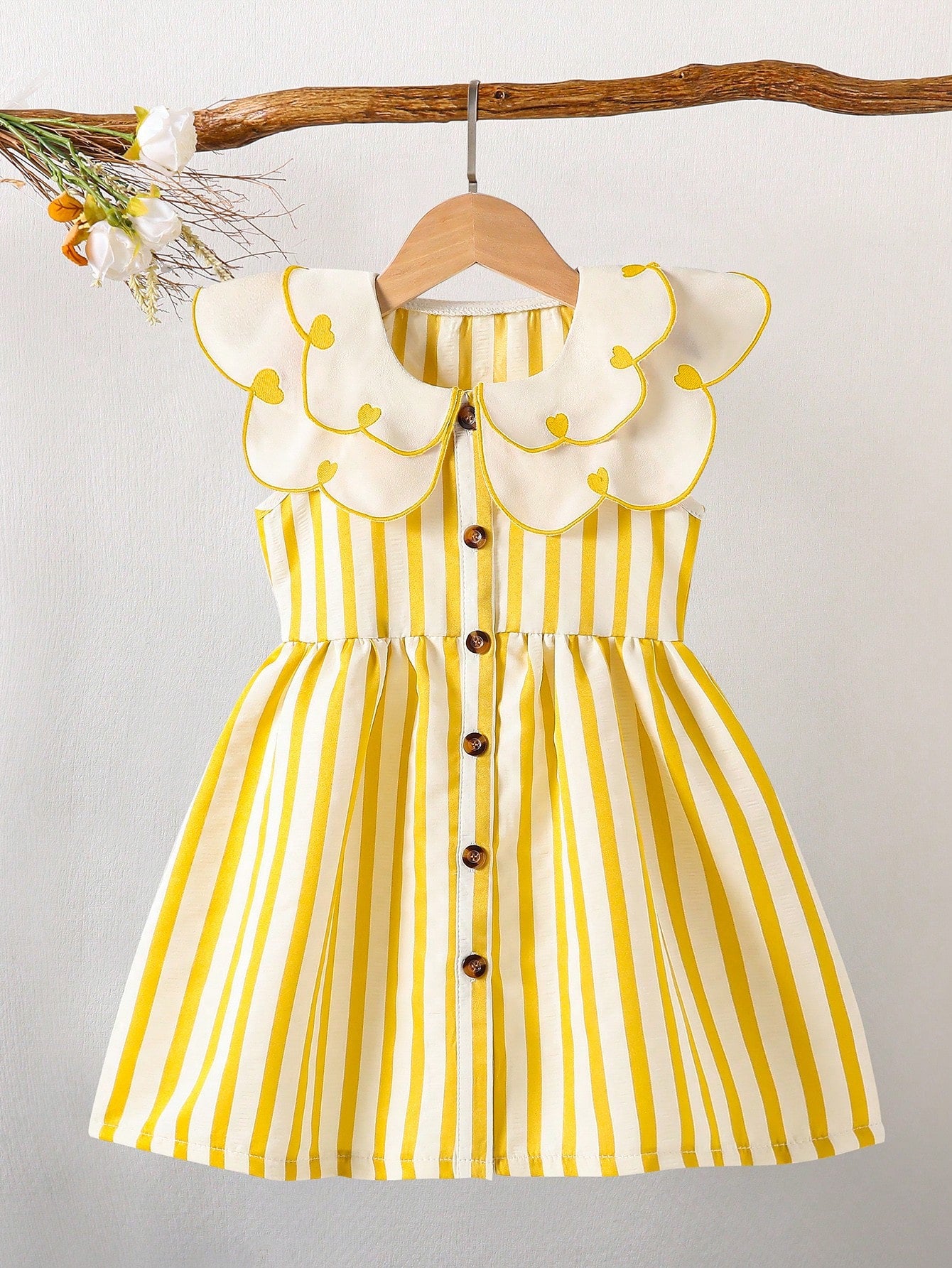 Toddler Girls' Summer Fresh & Energetic Red & White Striped Peter Pan Collar Bow Embroidered Dress