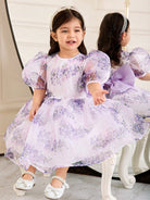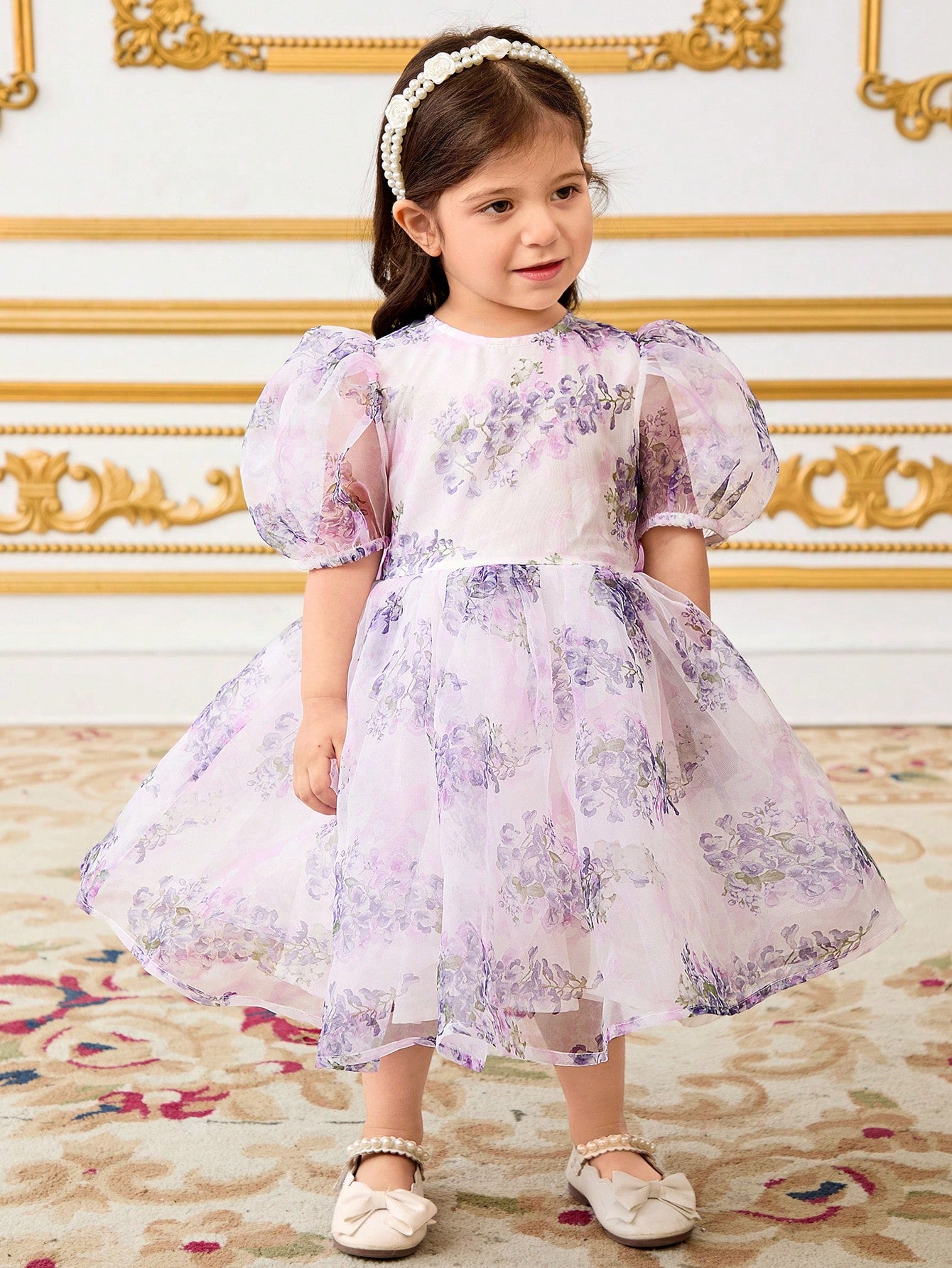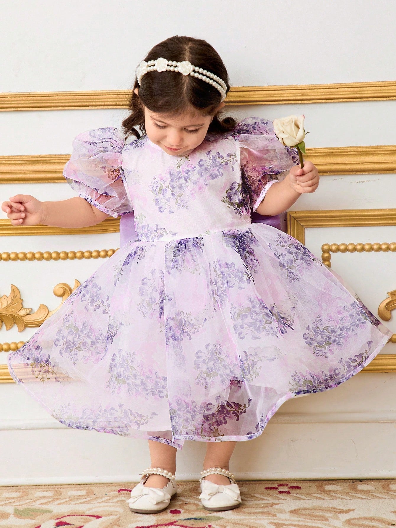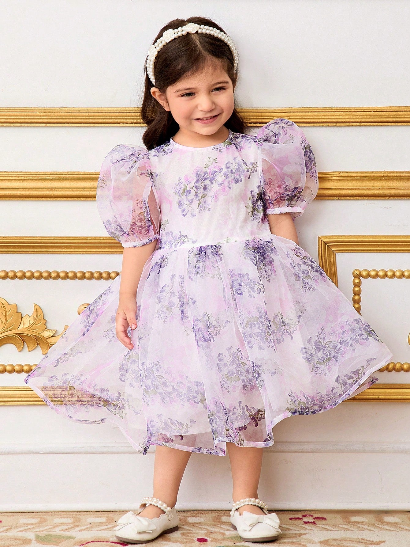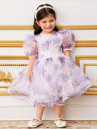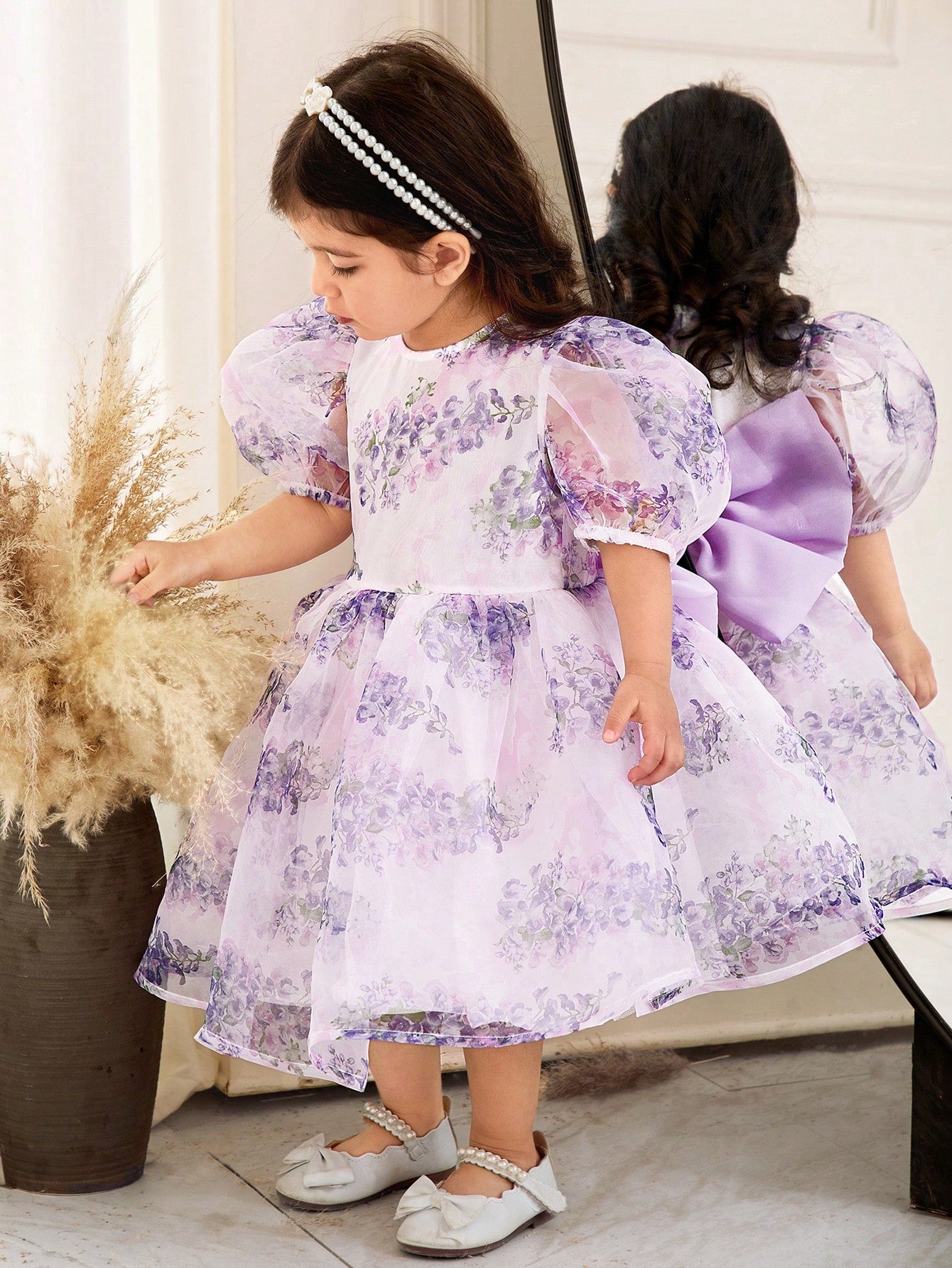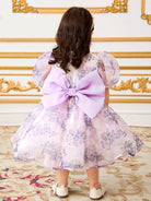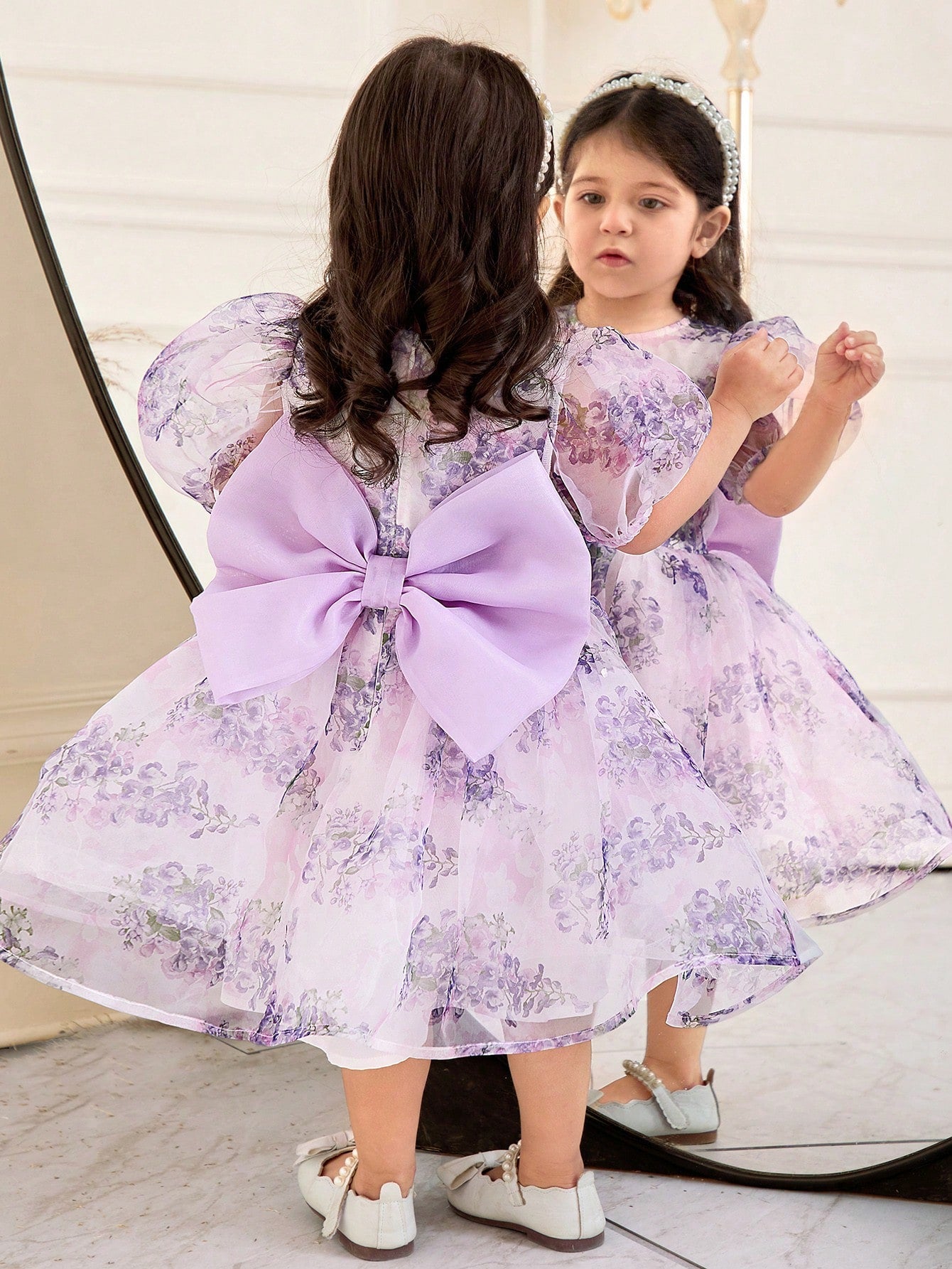 Young Girl Elegant Round Neck Puff Sleeve Detachable Bowknot Dress