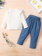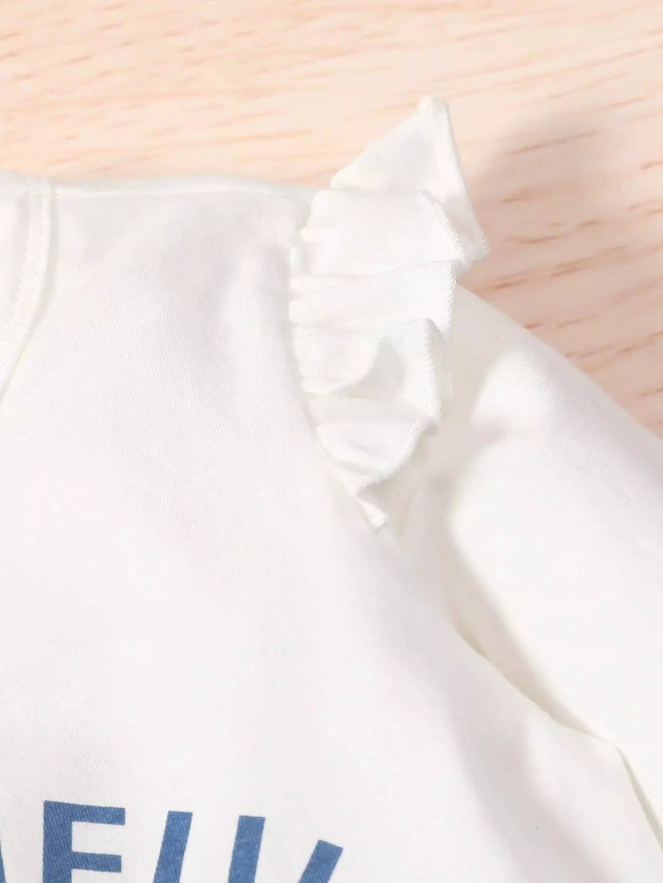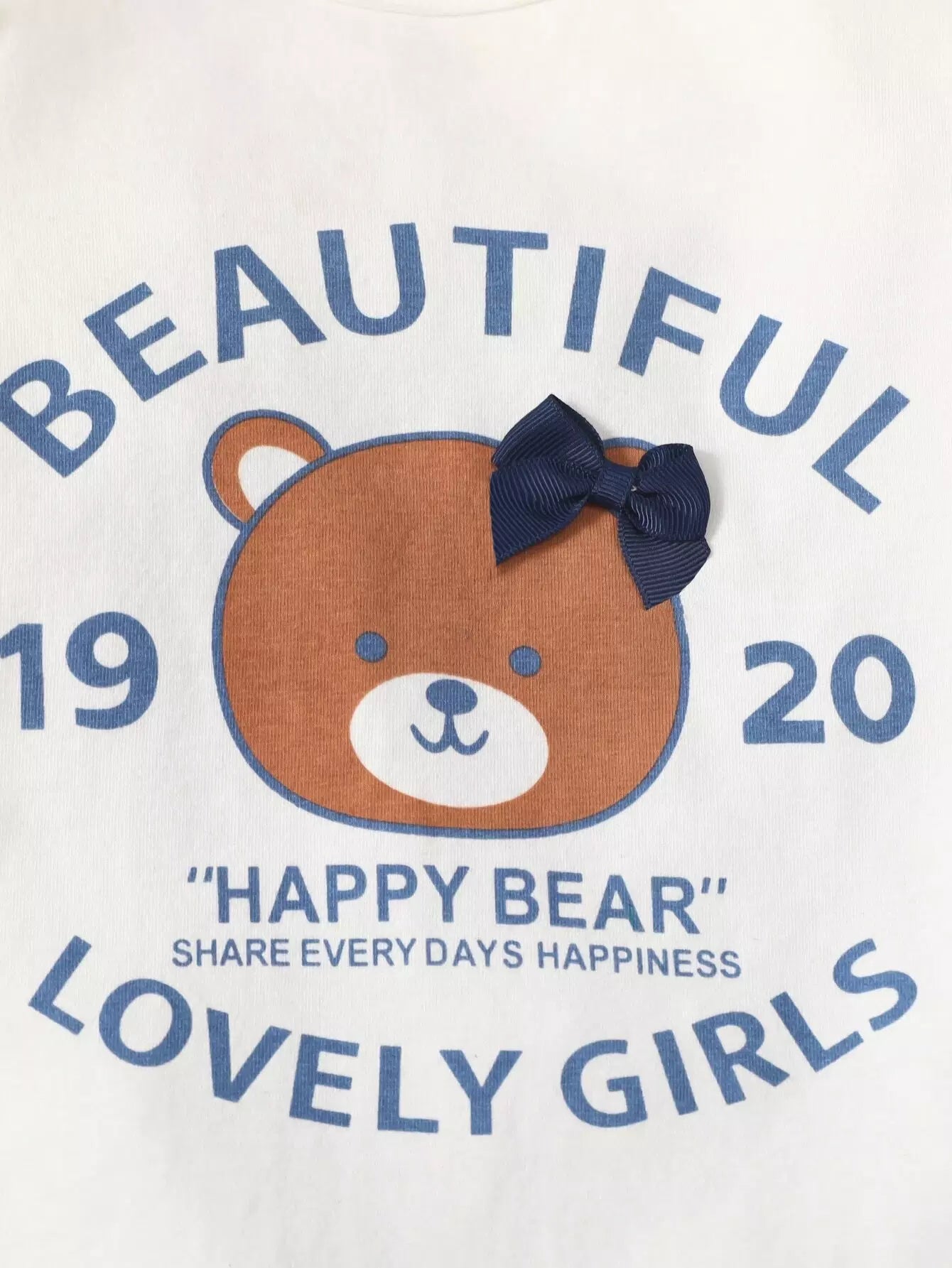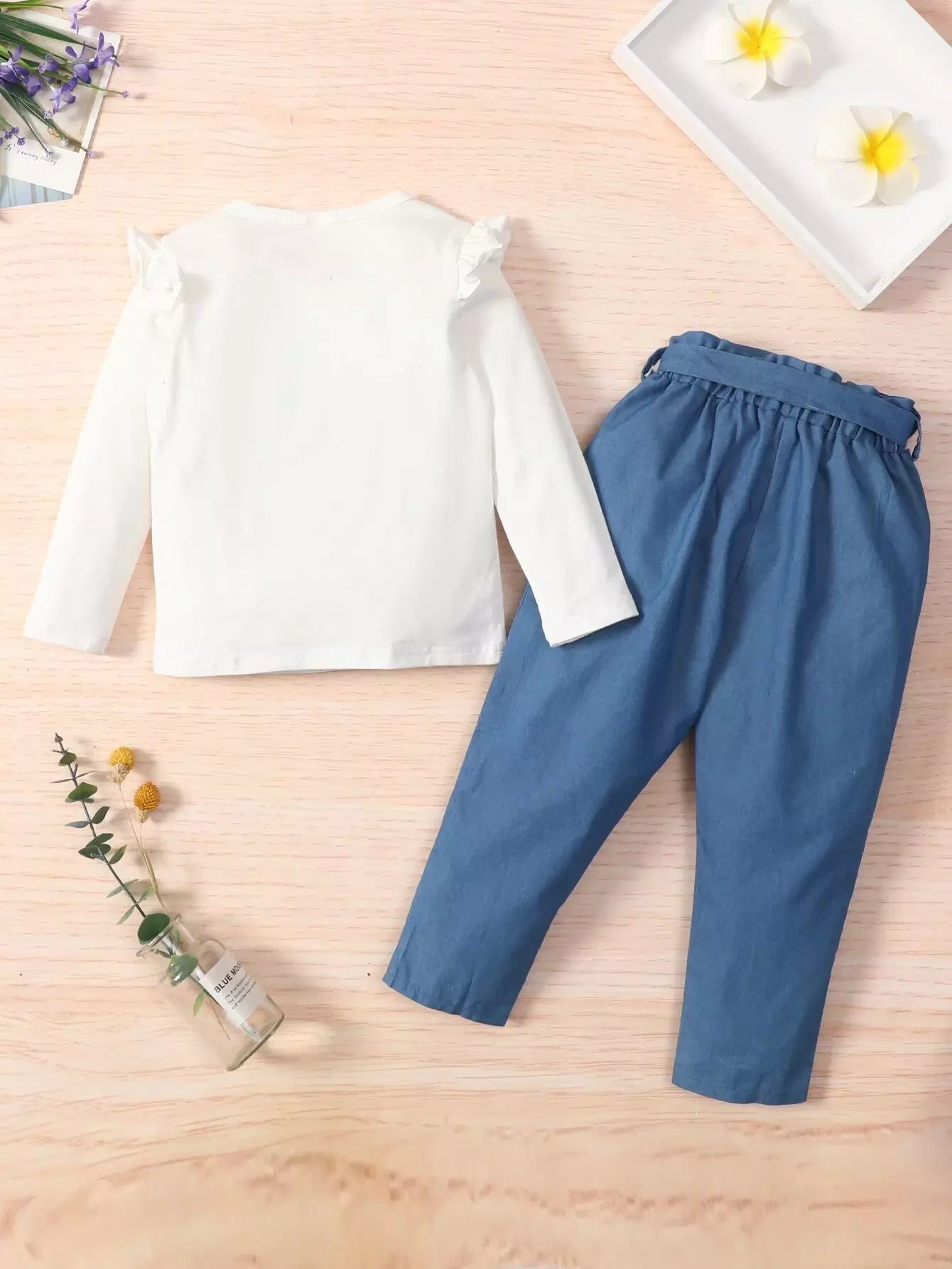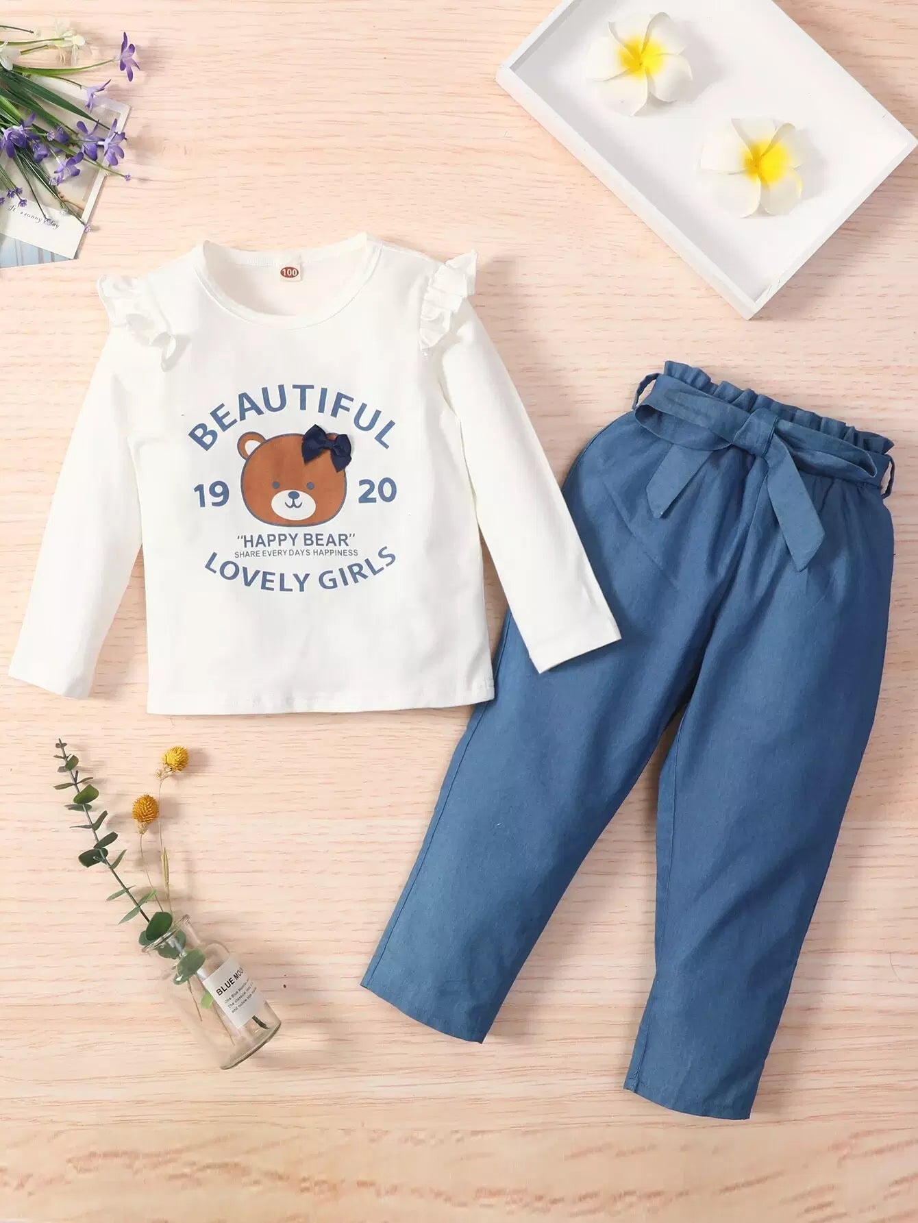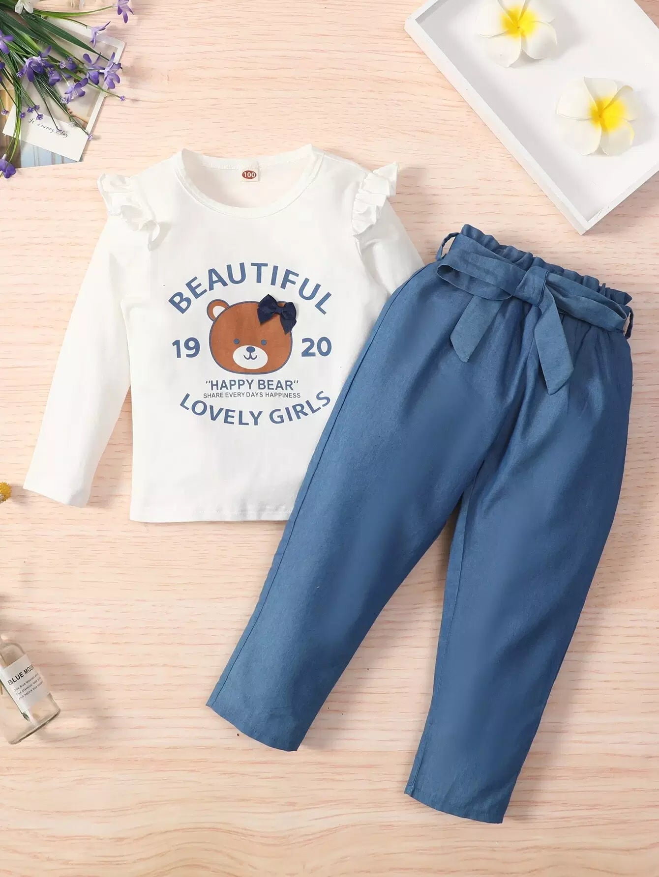 Toddler Girls Bear And Slogan Graphic Ruffle Trim Tee & Pants Without Belt
