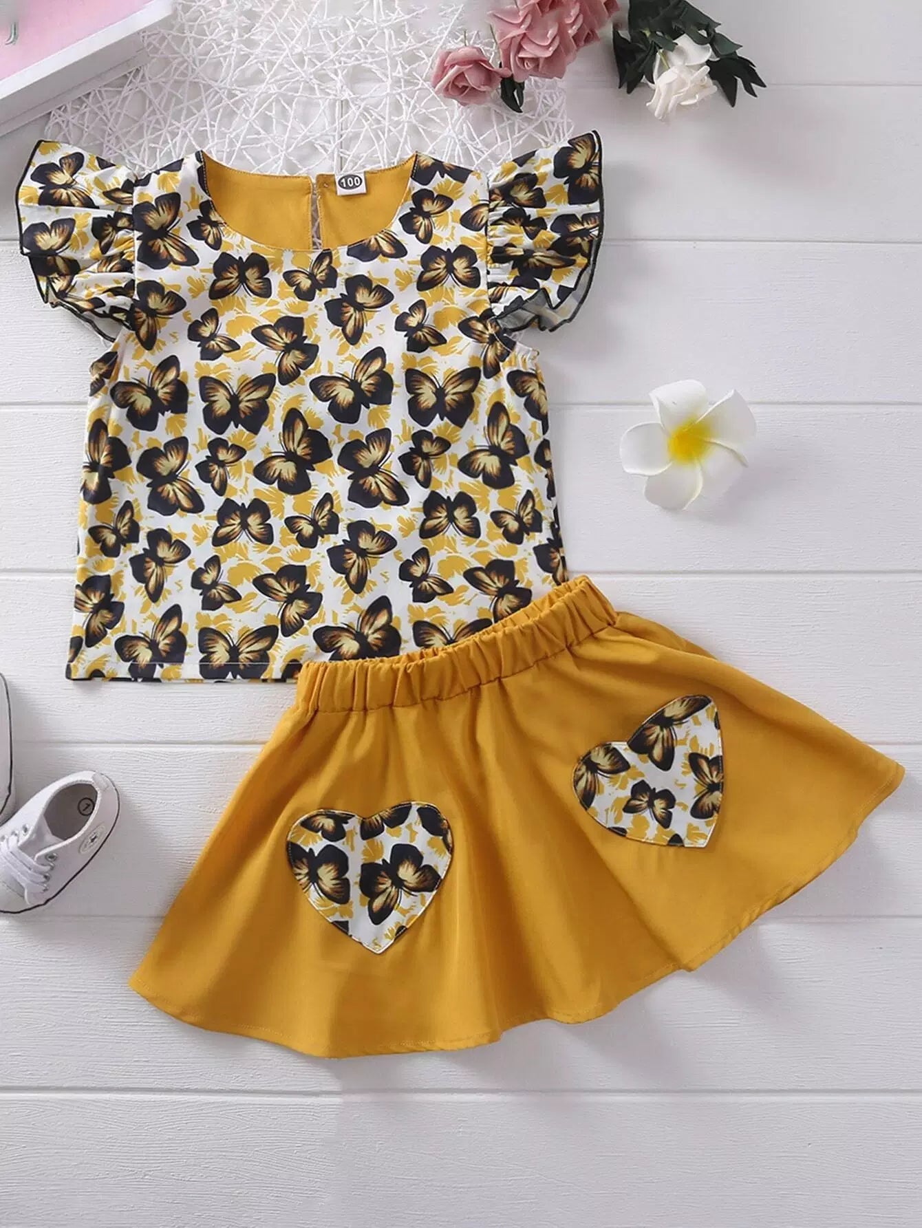 Toddler Girls Butterfly Print Top & Heart Patched Skirt