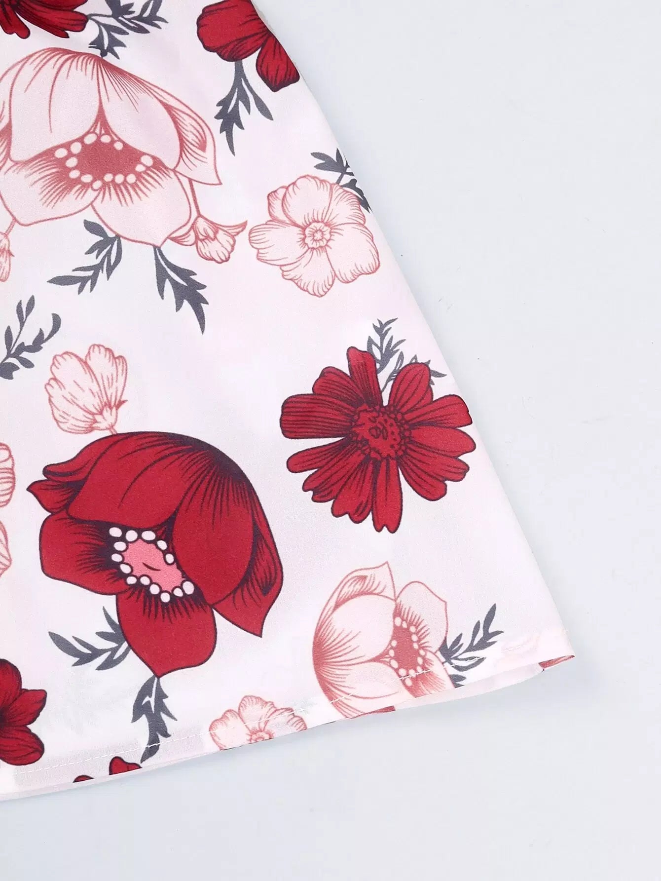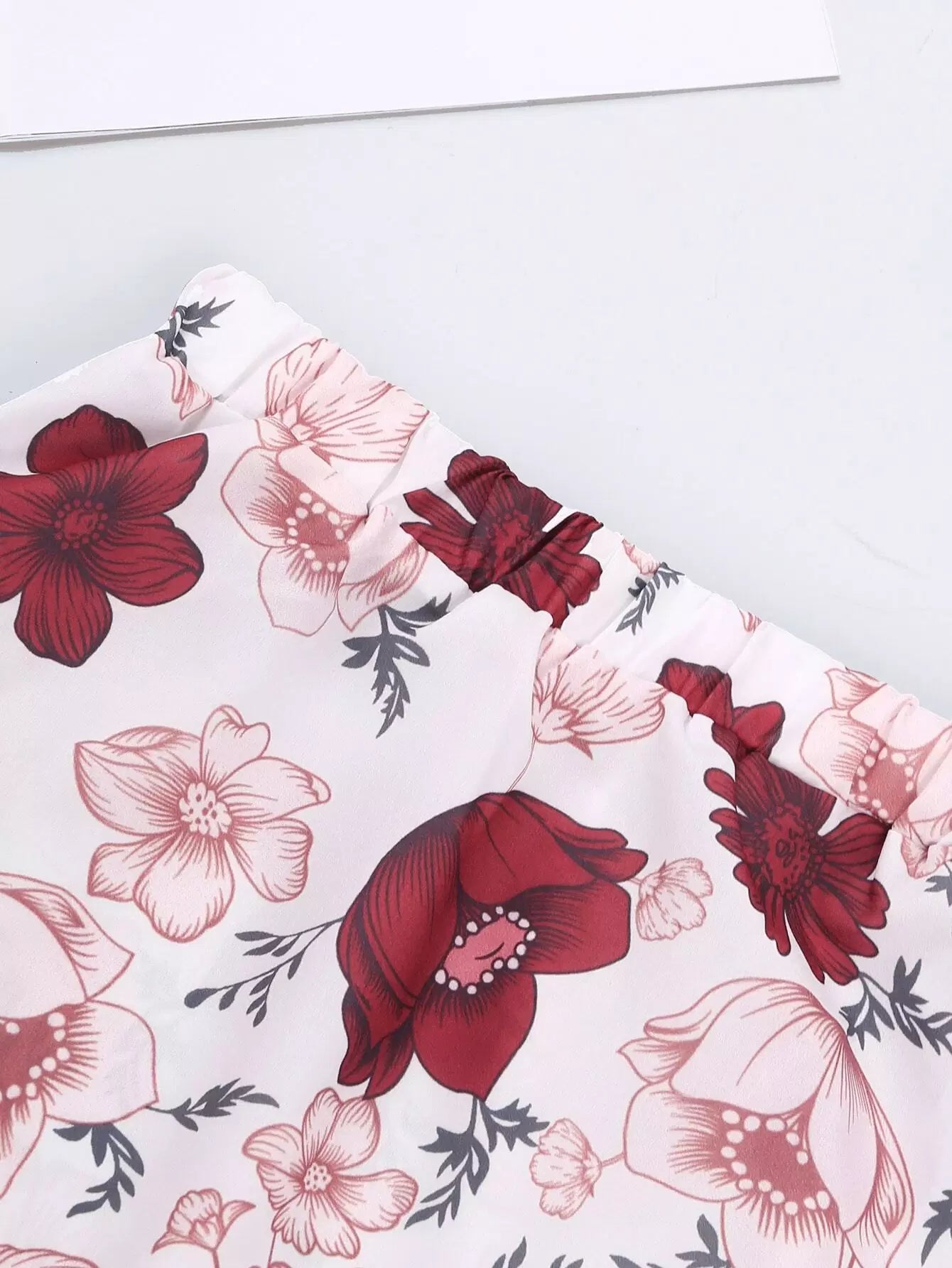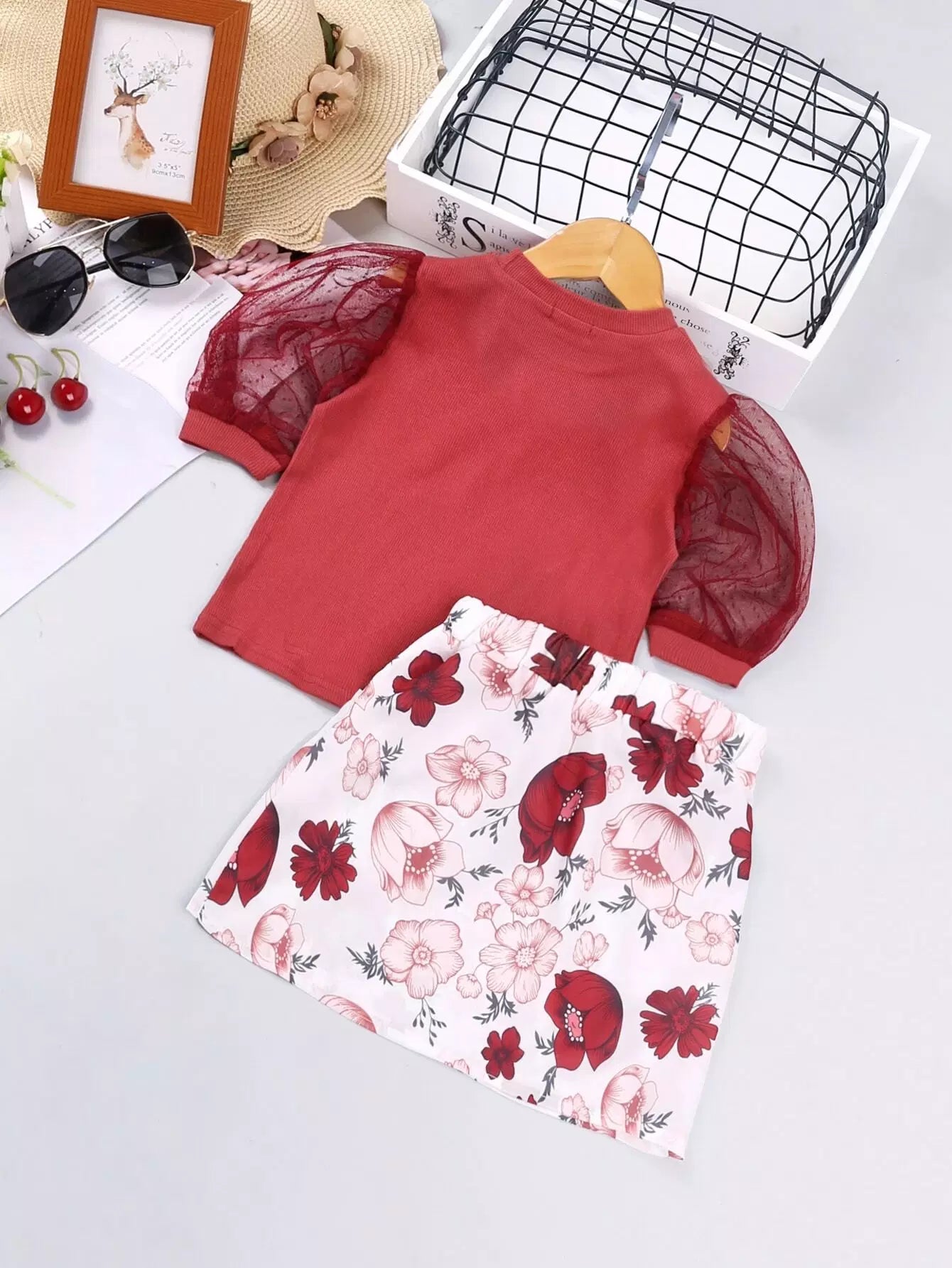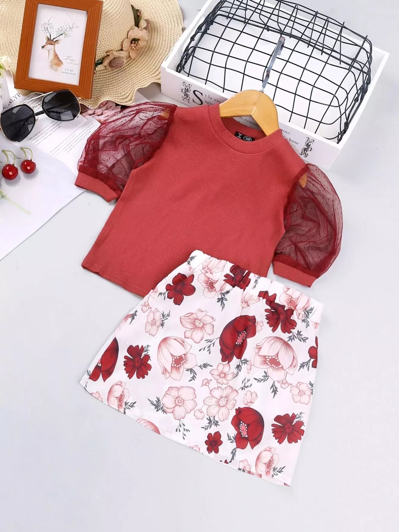 Toddler Girls Contrast Dobby Mesh Sleeve Tee & Floral Skirt