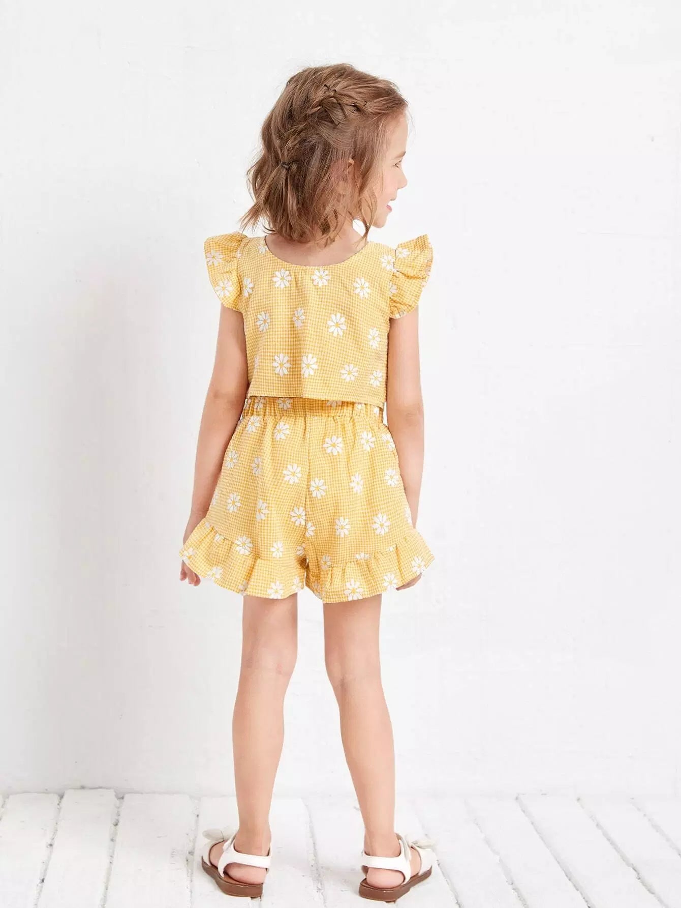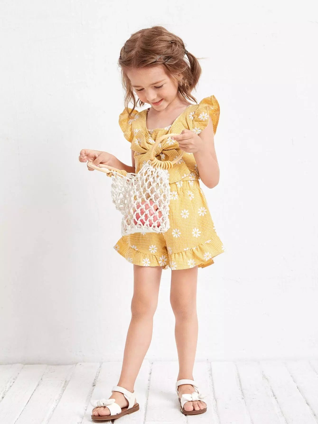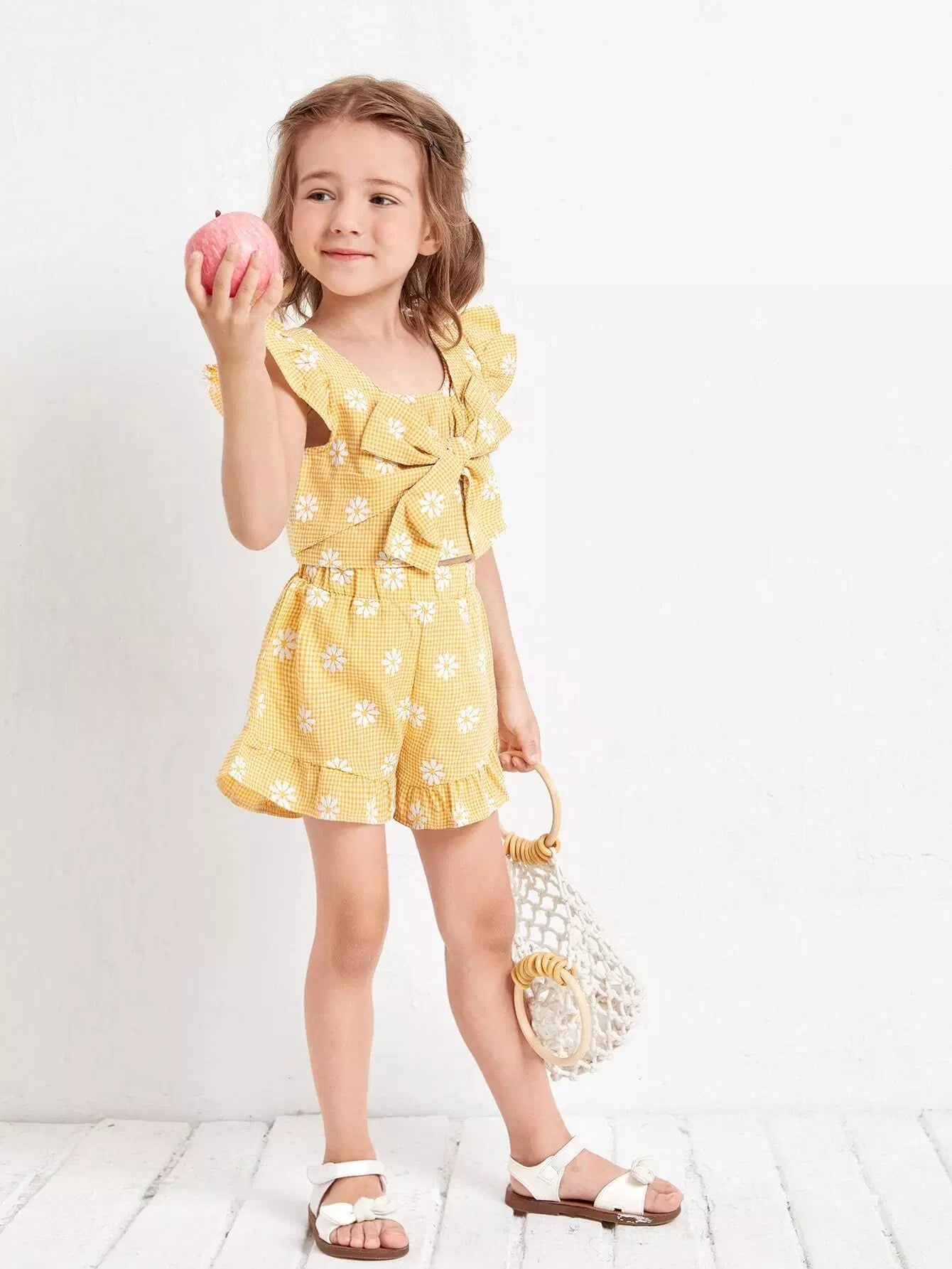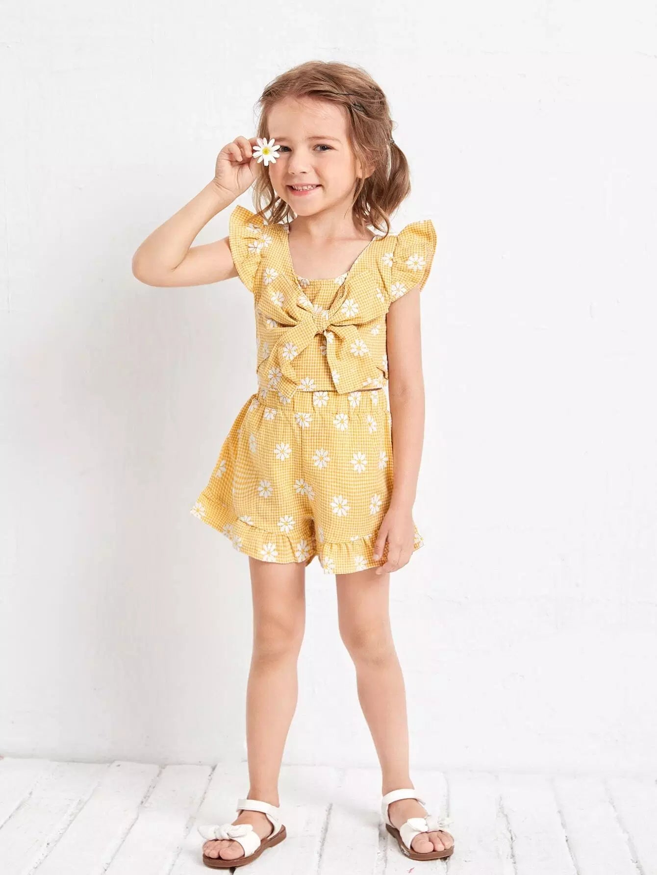 Toddler Girls Floral Bow Front Top With Ruffle Hem Shorts