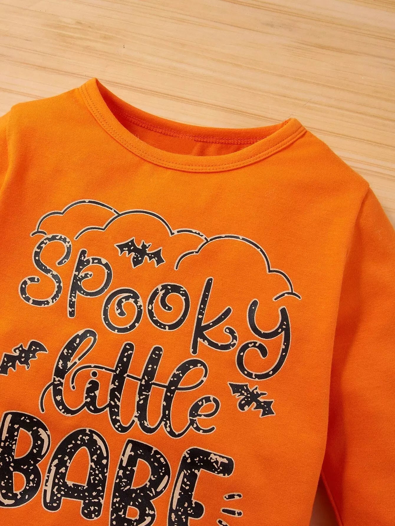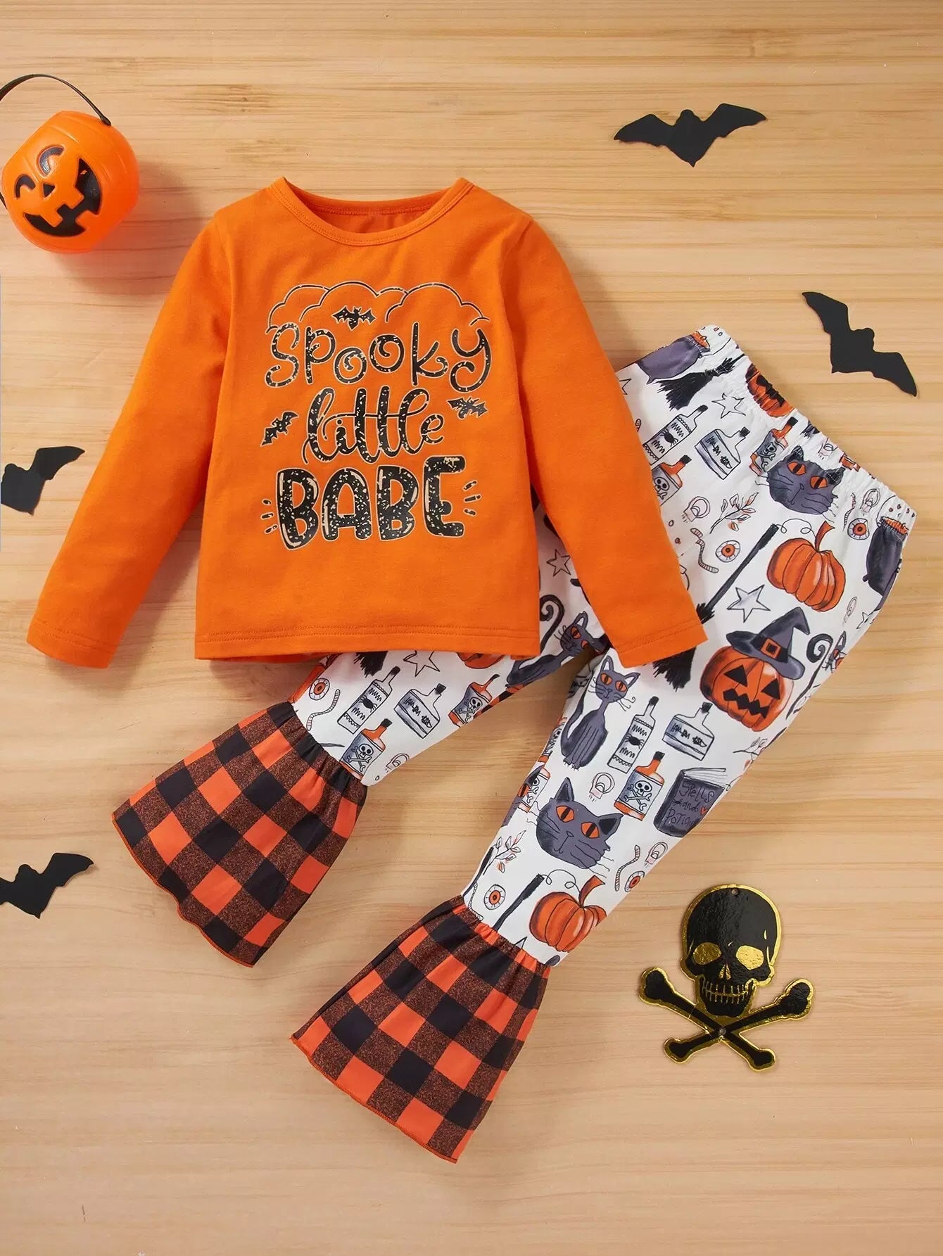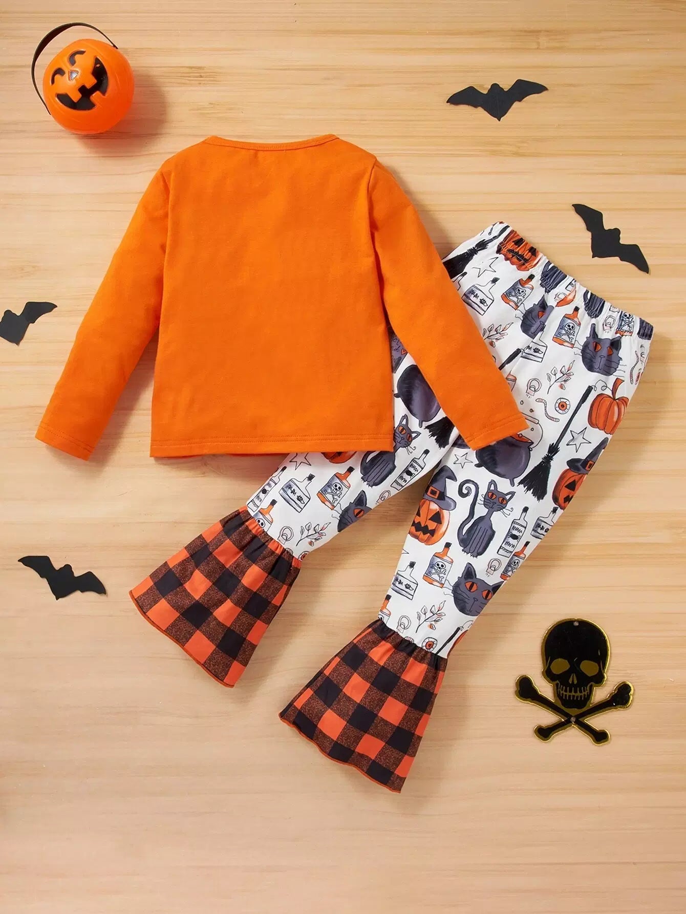 Toddler Girls Letter Graphic Tee & Halloween Pumpkin Print Flare Leg Pants