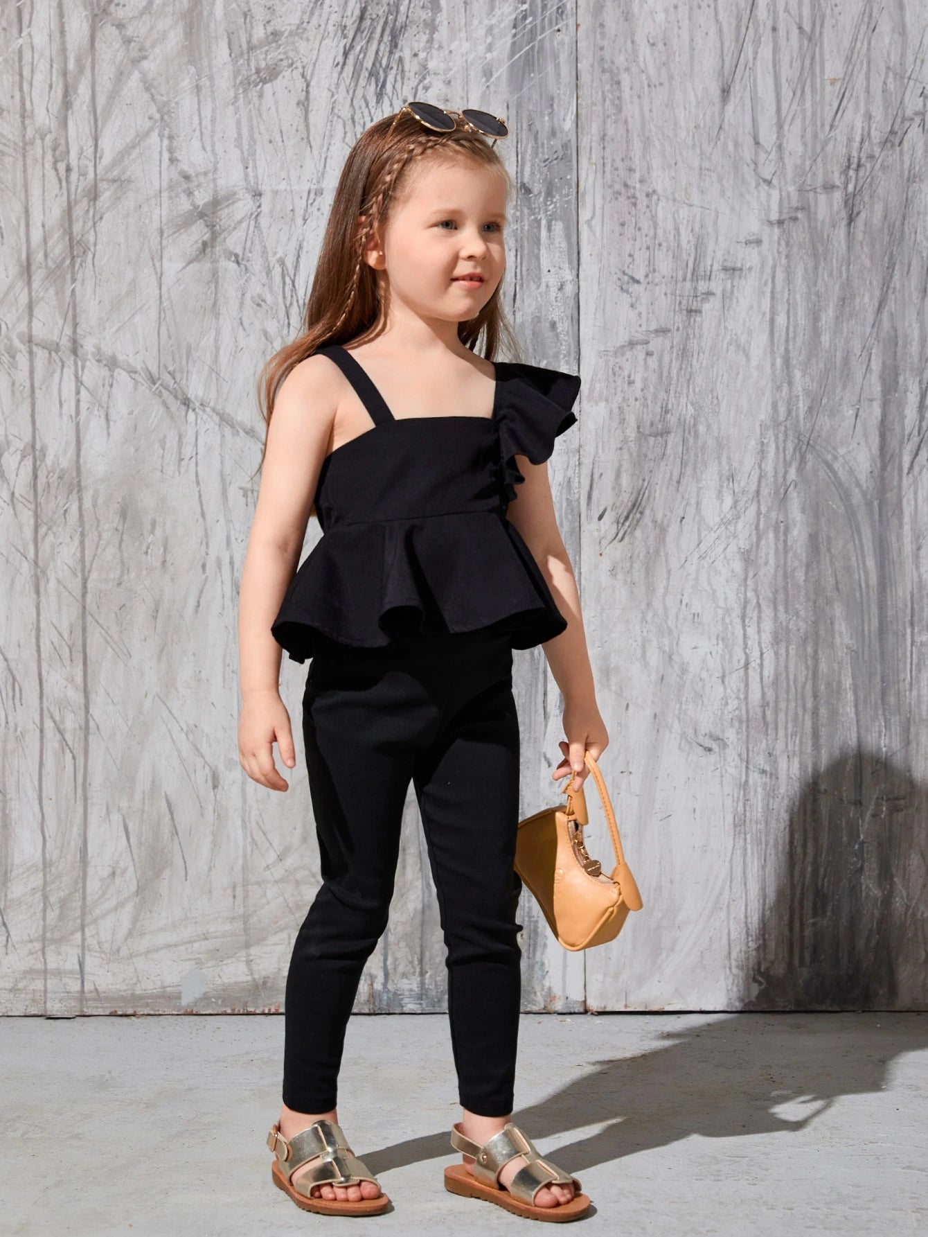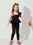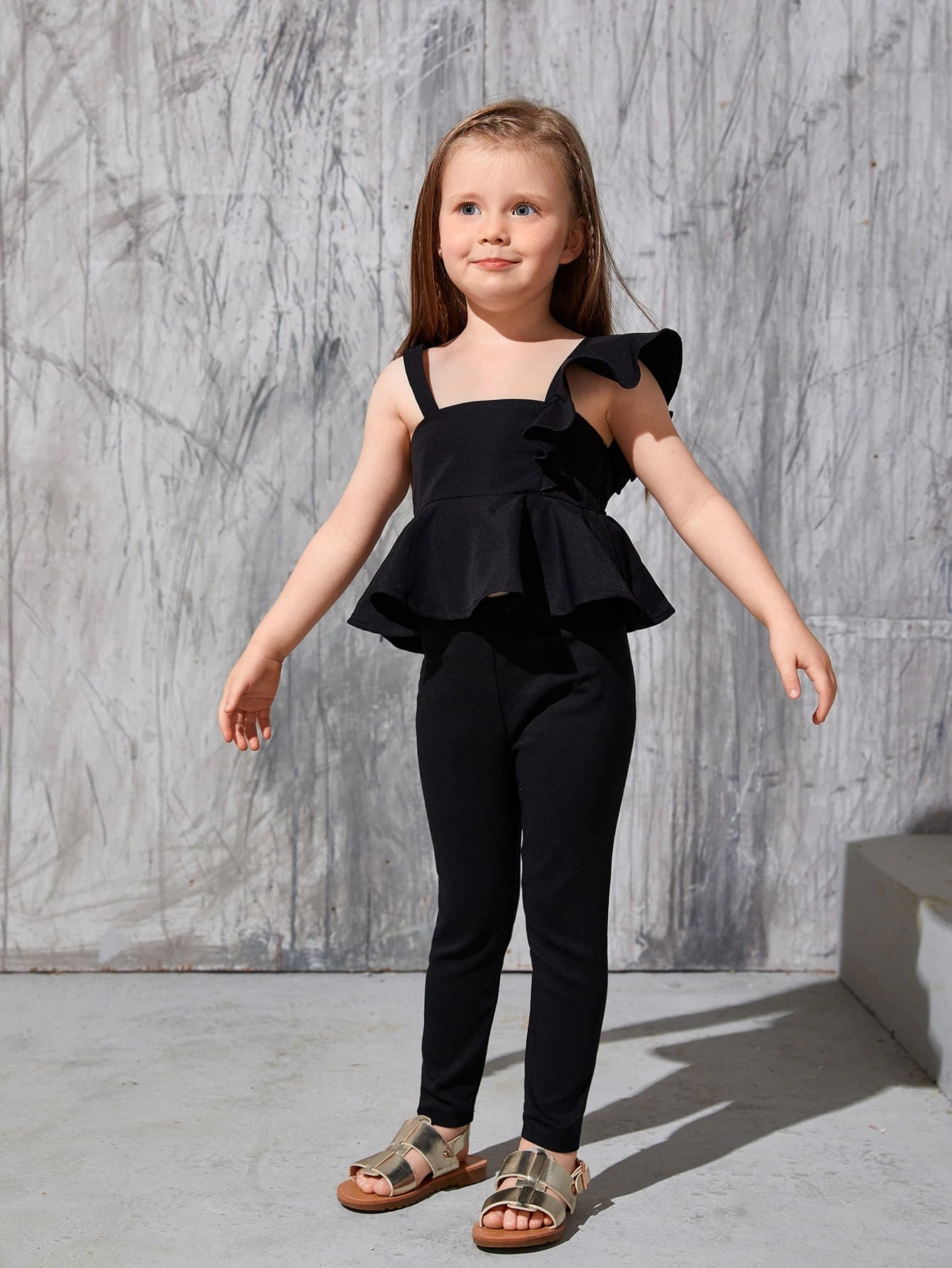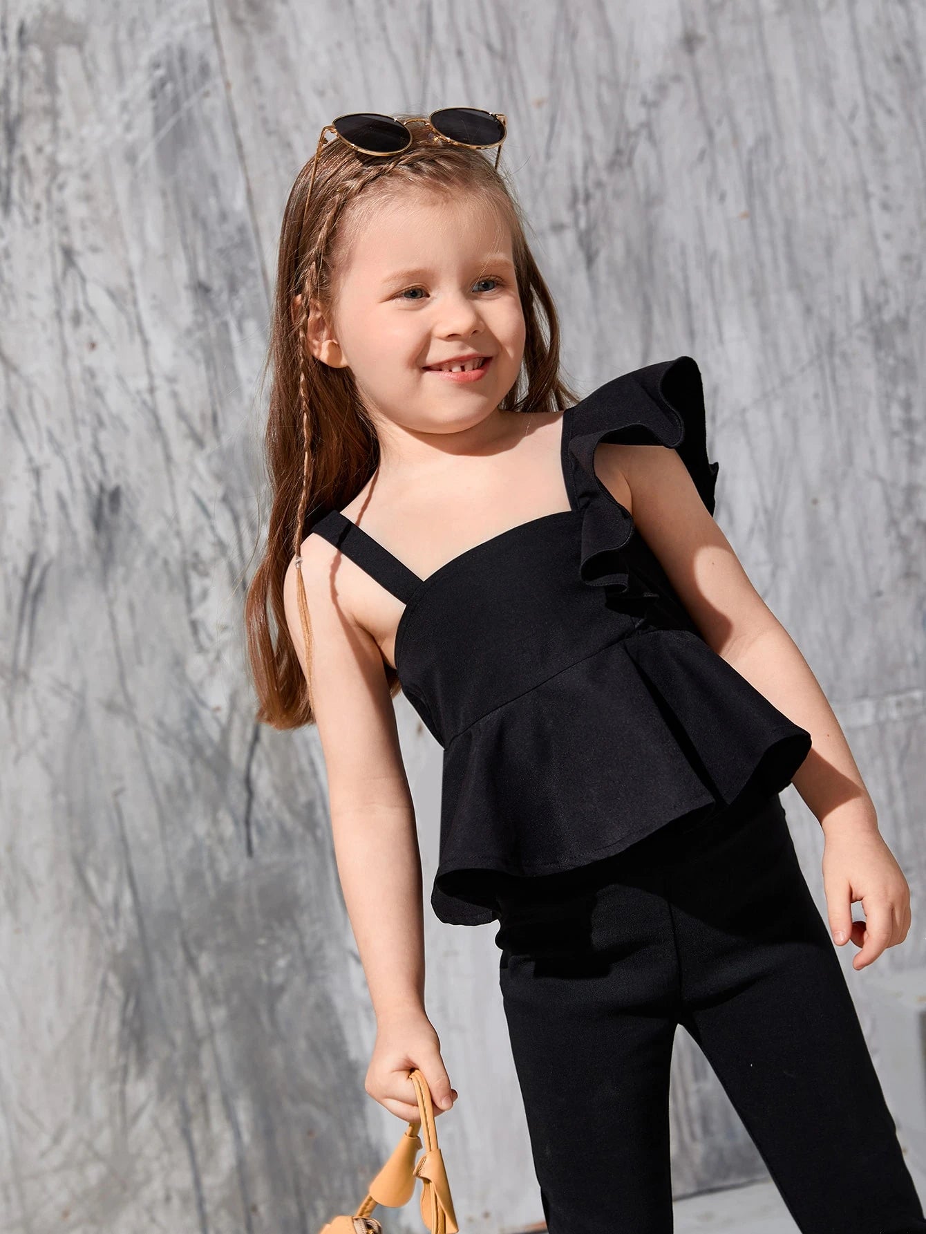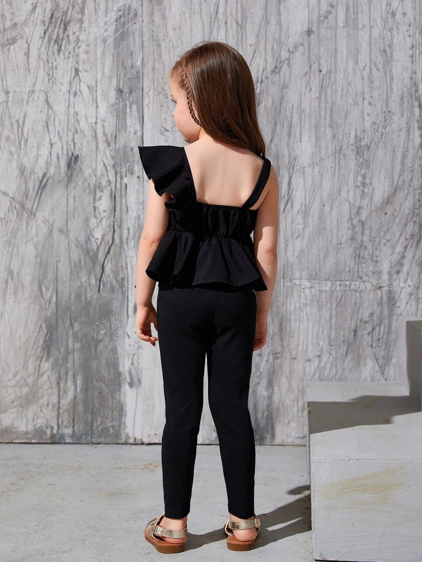 Young Girl Ruffle Trim Asymmetrical Neck Peplum Top & Pants
