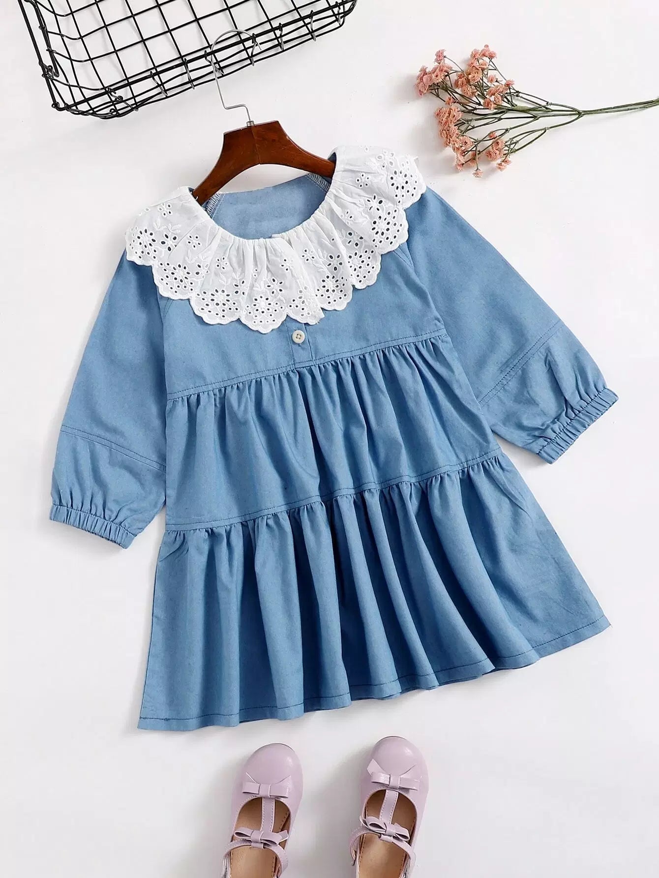 Toddler Girls Eyelet Embroidery Contrast Collar Denim Dress