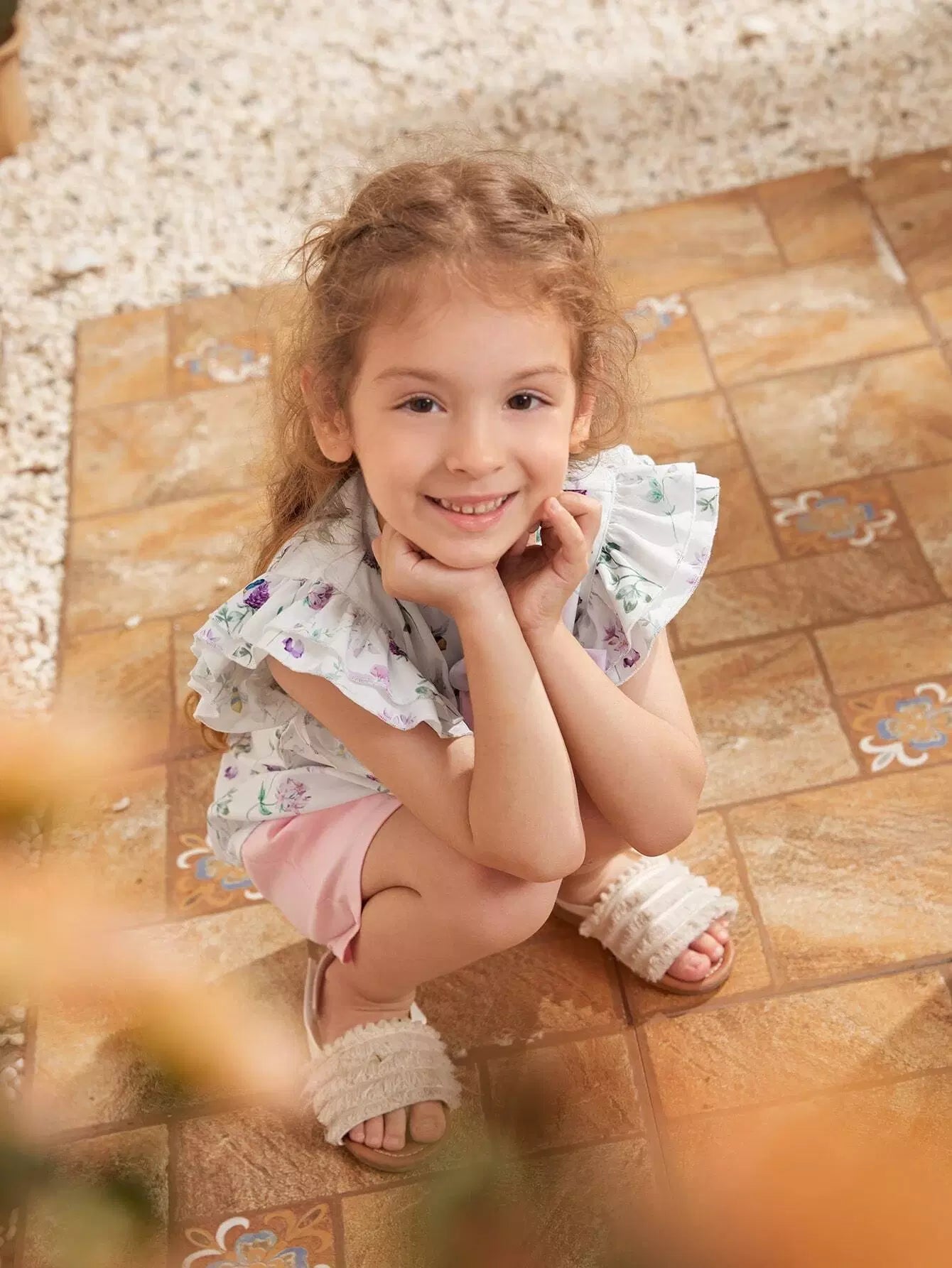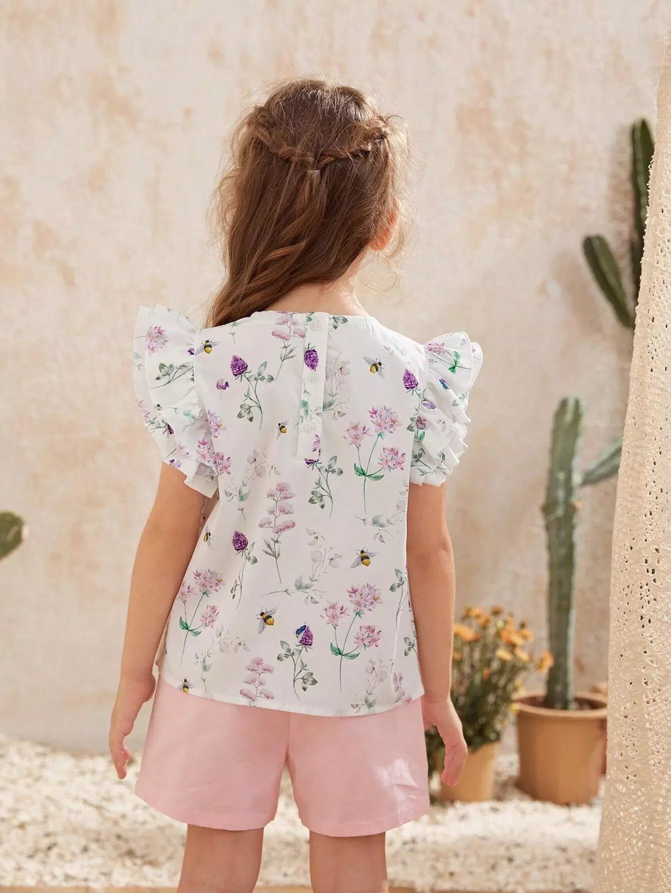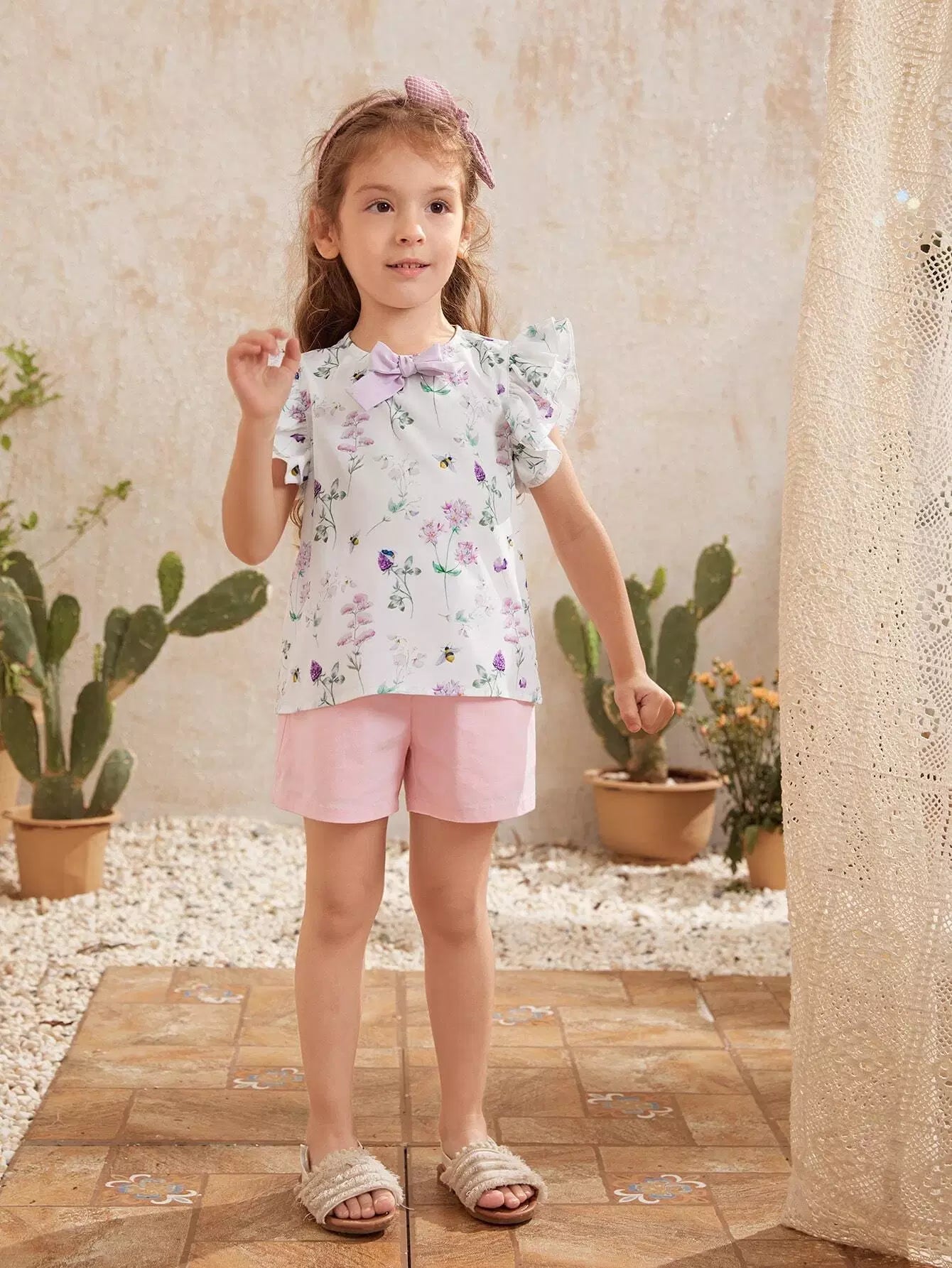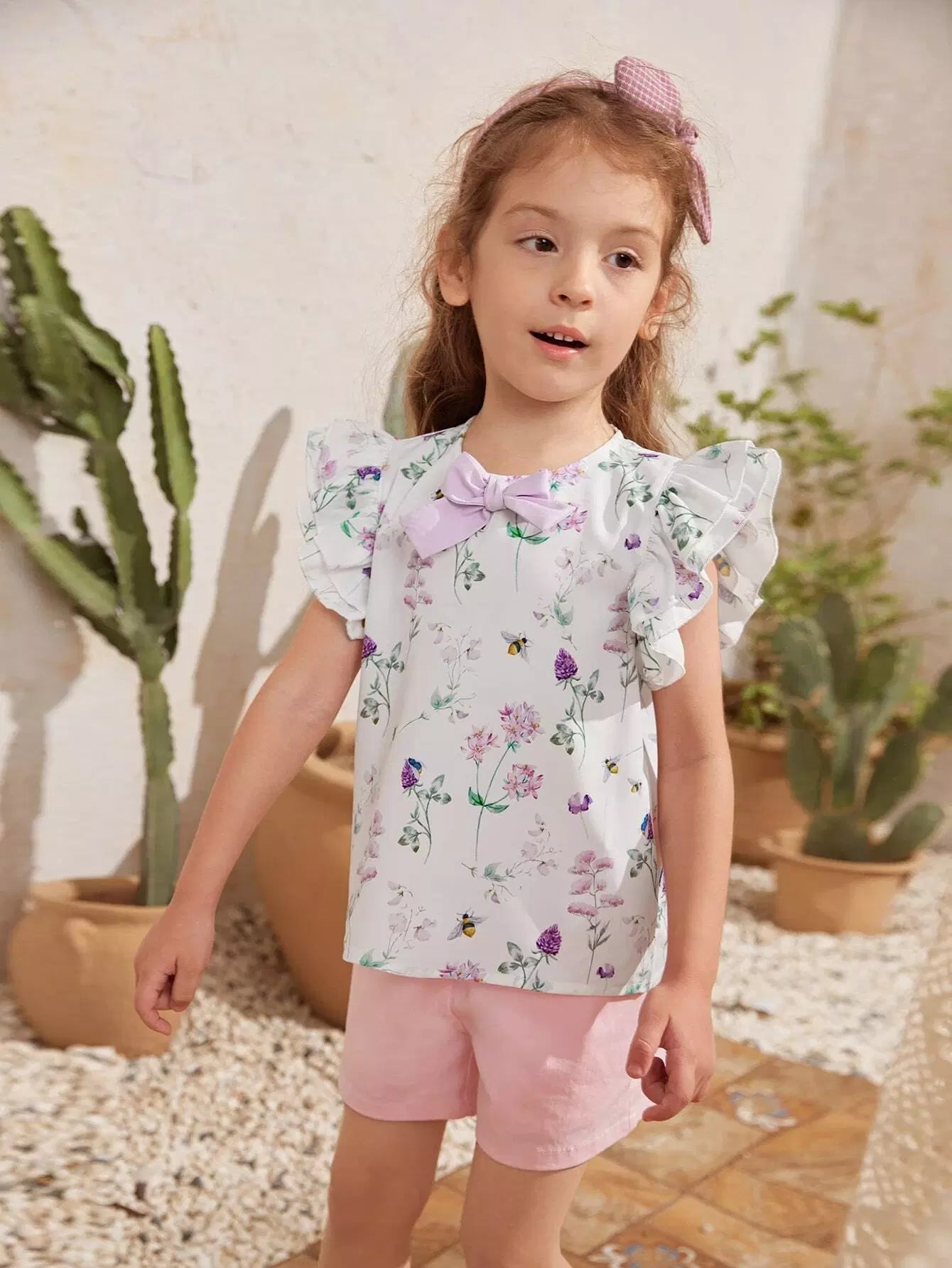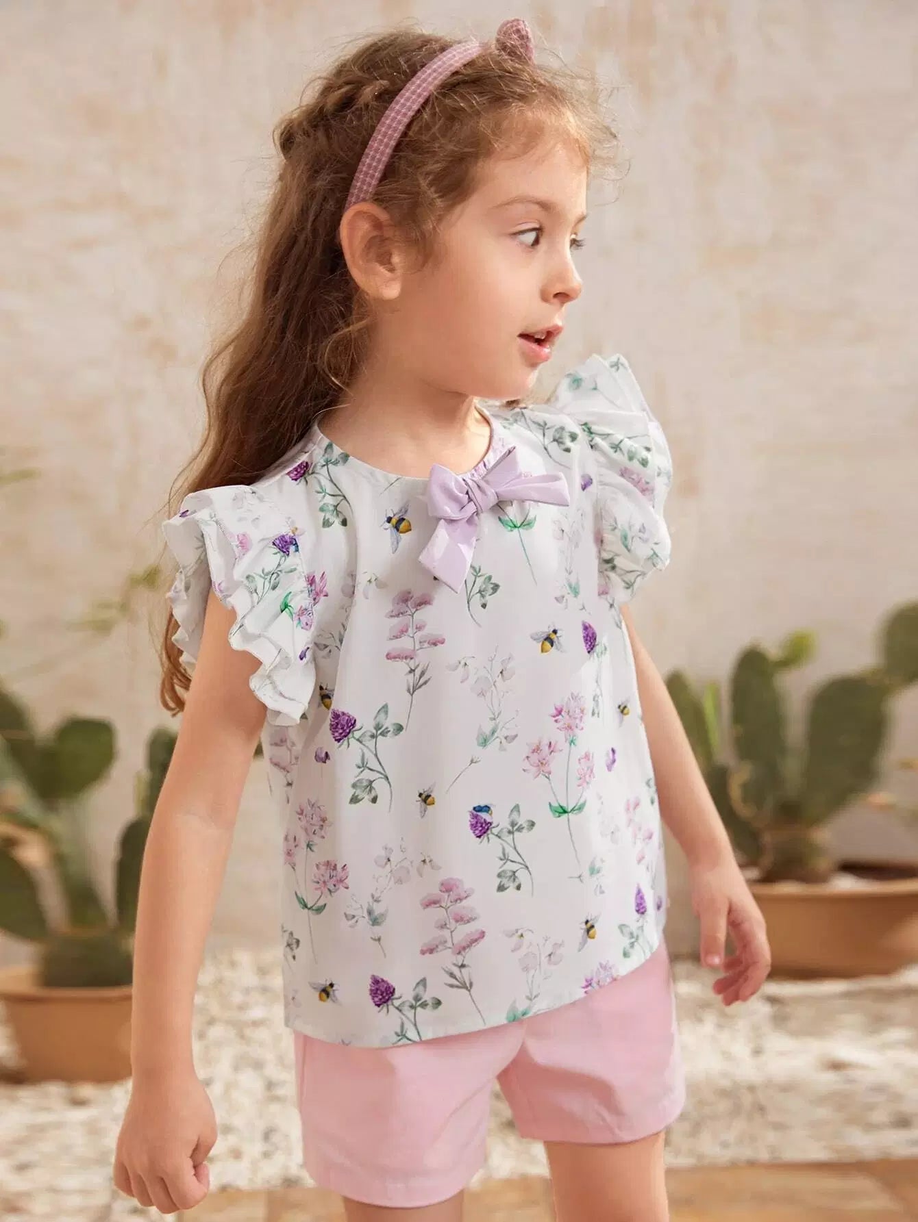 Toddler Girls Bow Front Ruffle Trim Floral Top