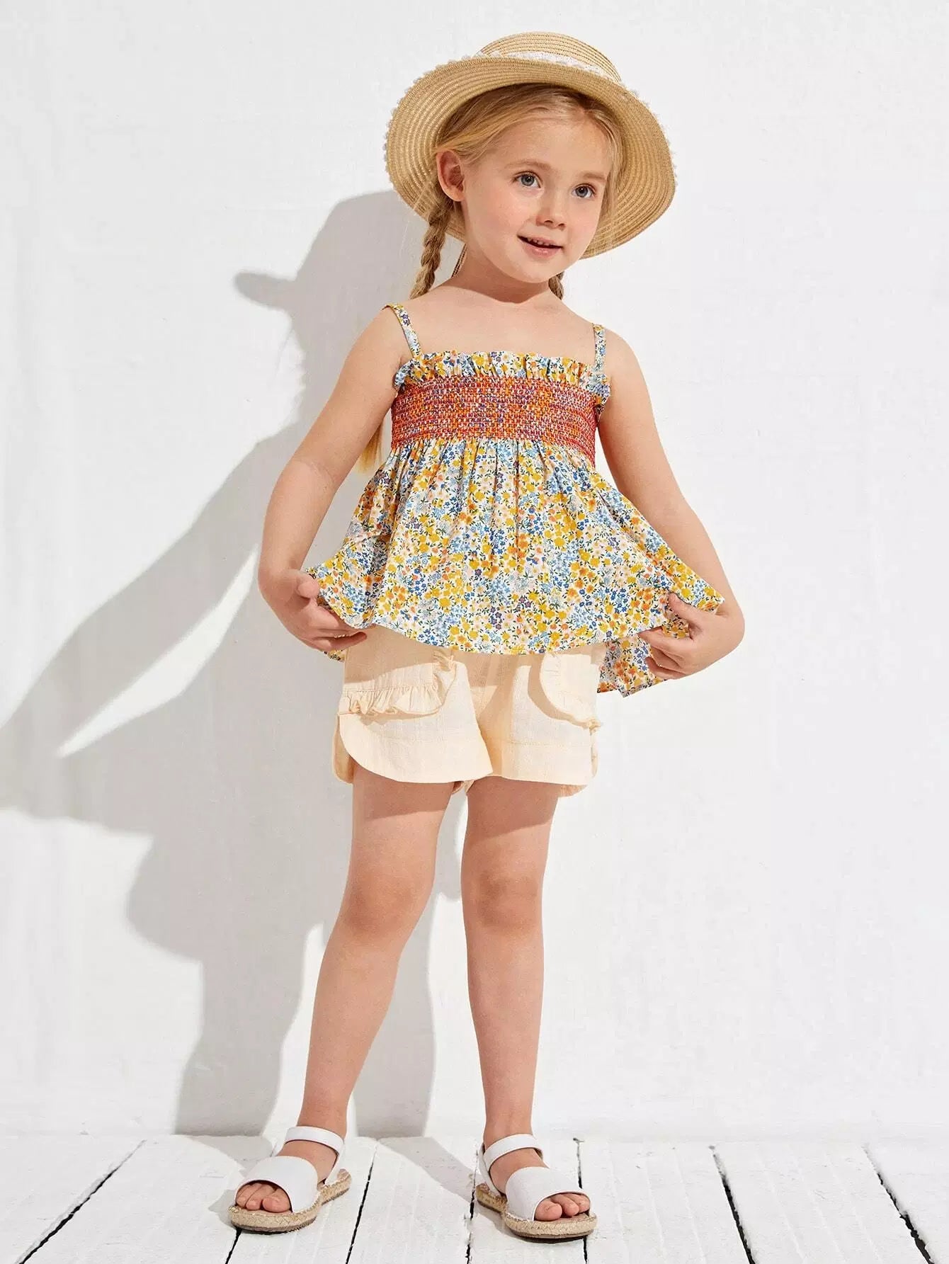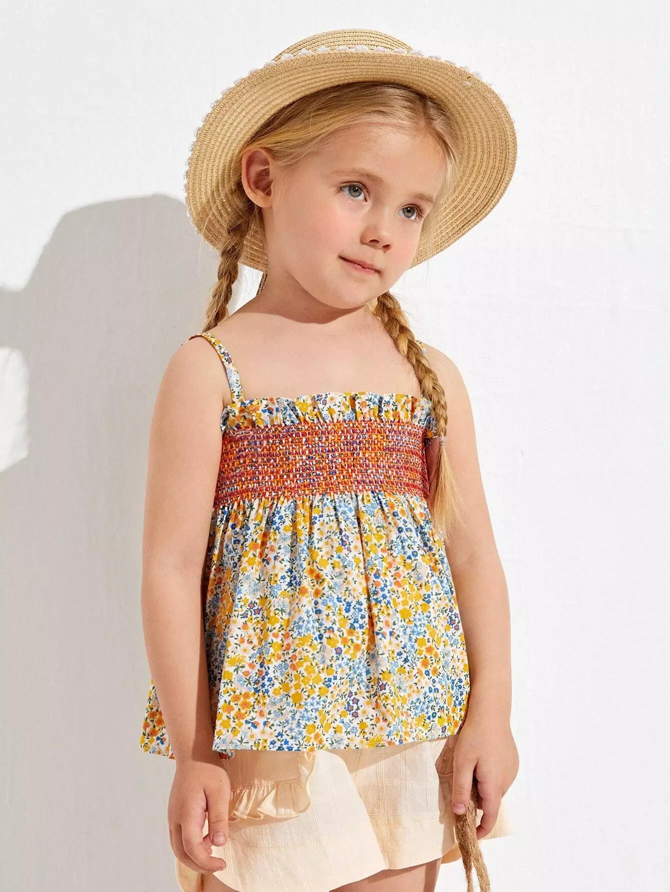 Toddler Girls Ruffle Trim Shirred Panel Ditsy Floral Cami Top