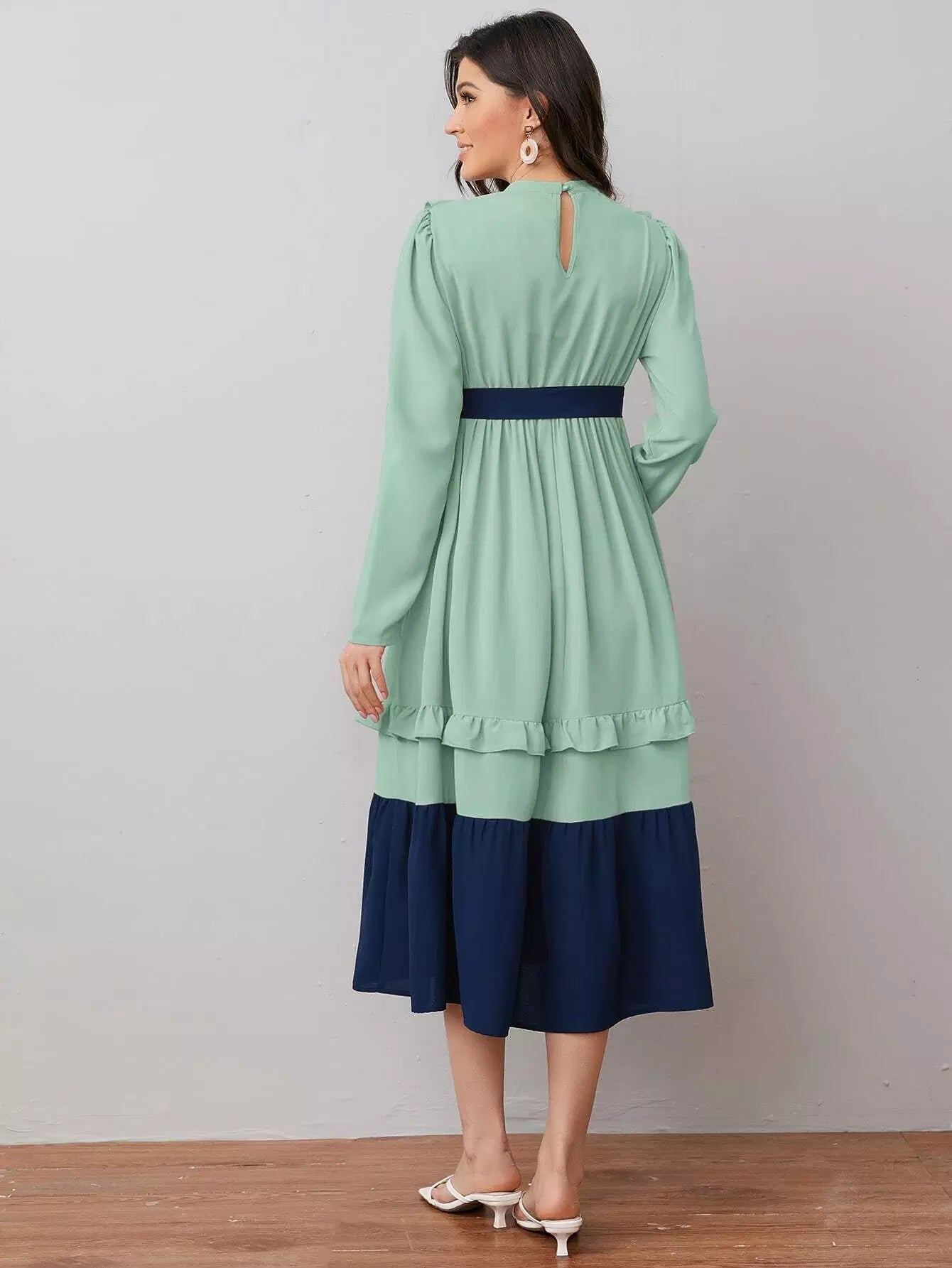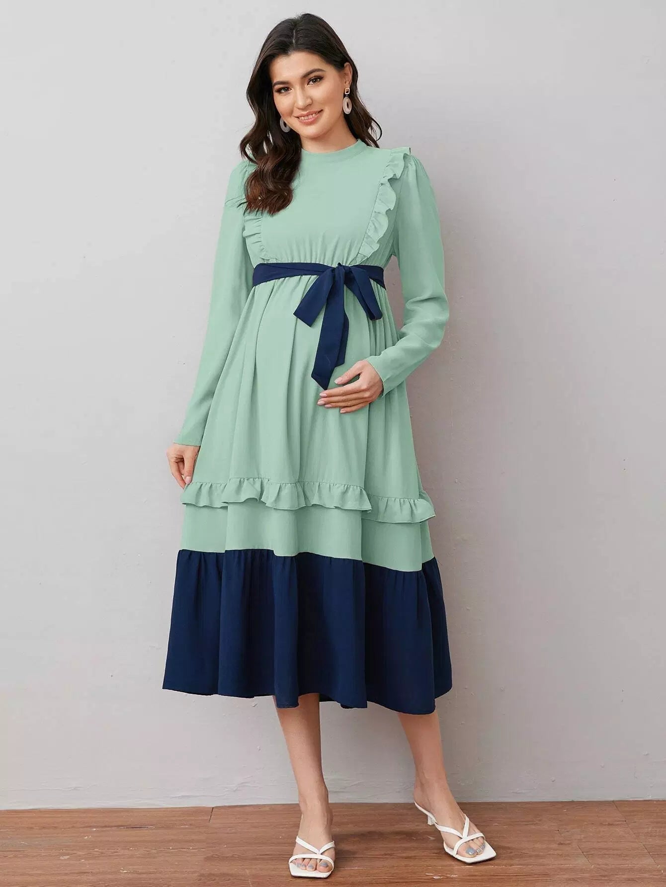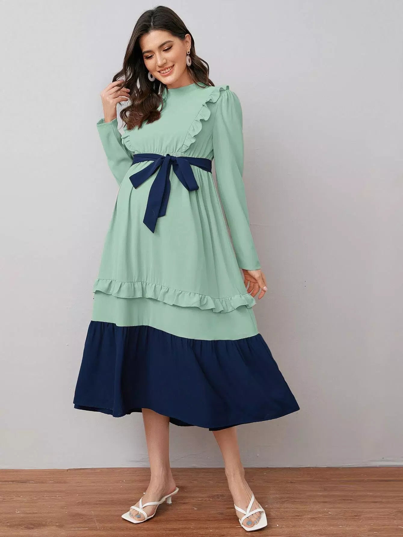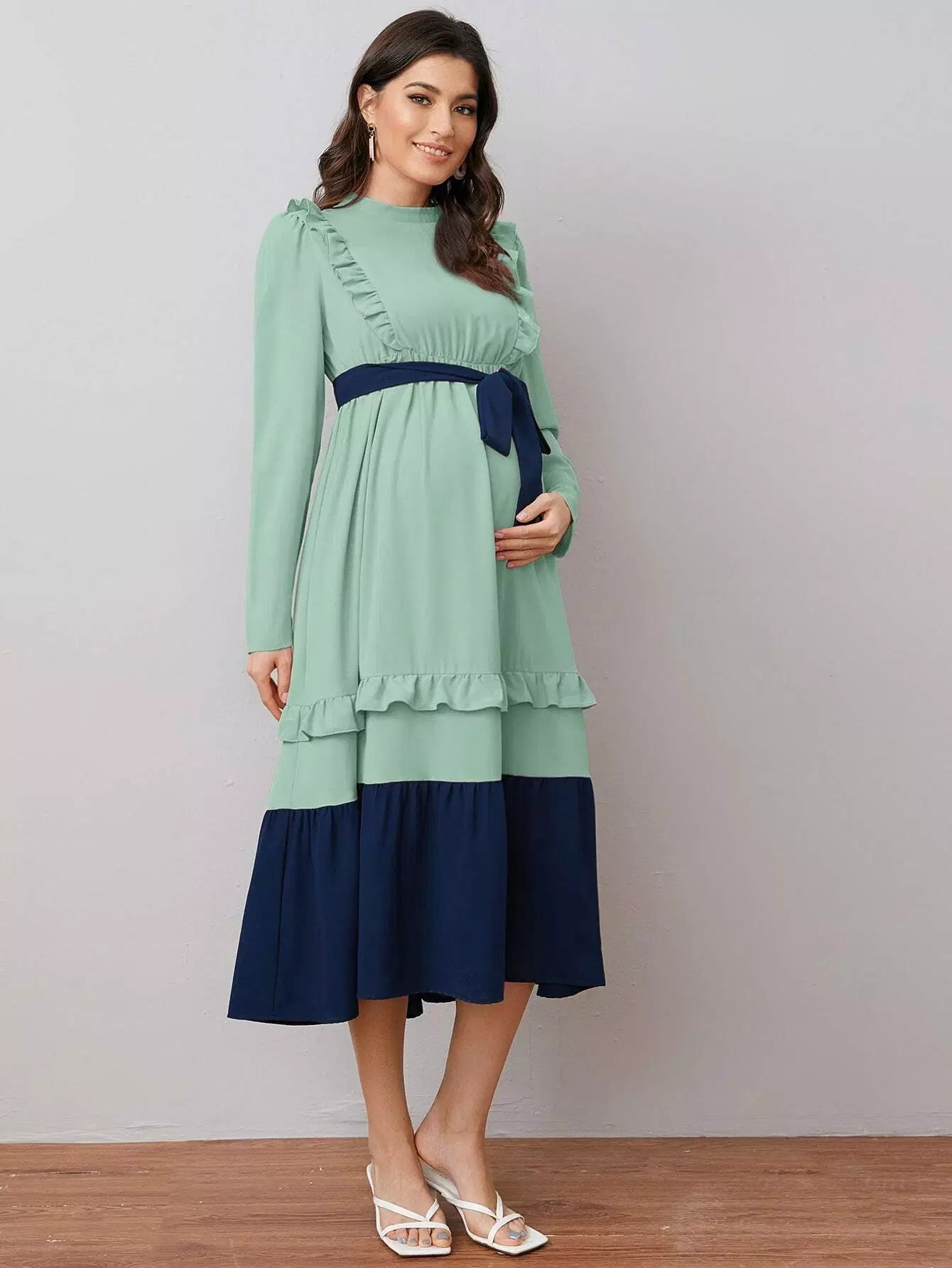 Maternity Ruffle Trim Colorblock Dress Without Belt