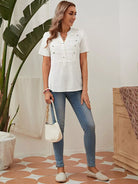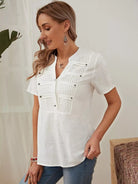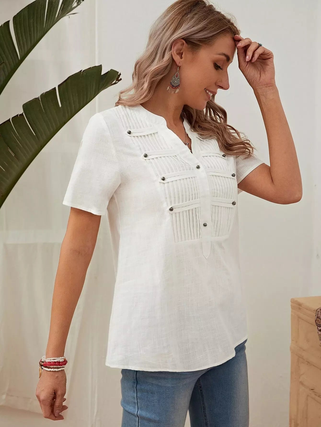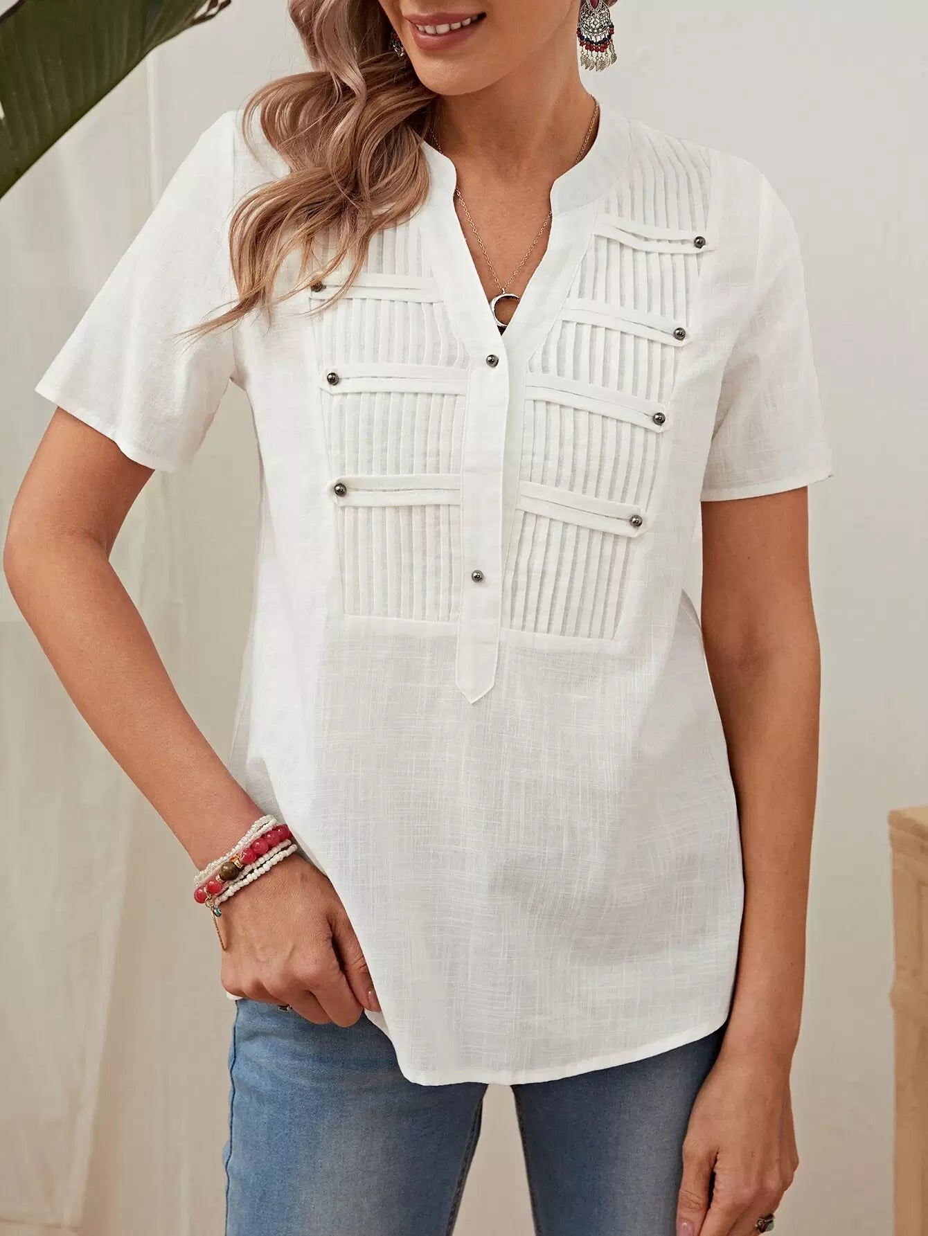 Beaded Pleated Detail Notched Blouse