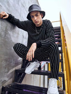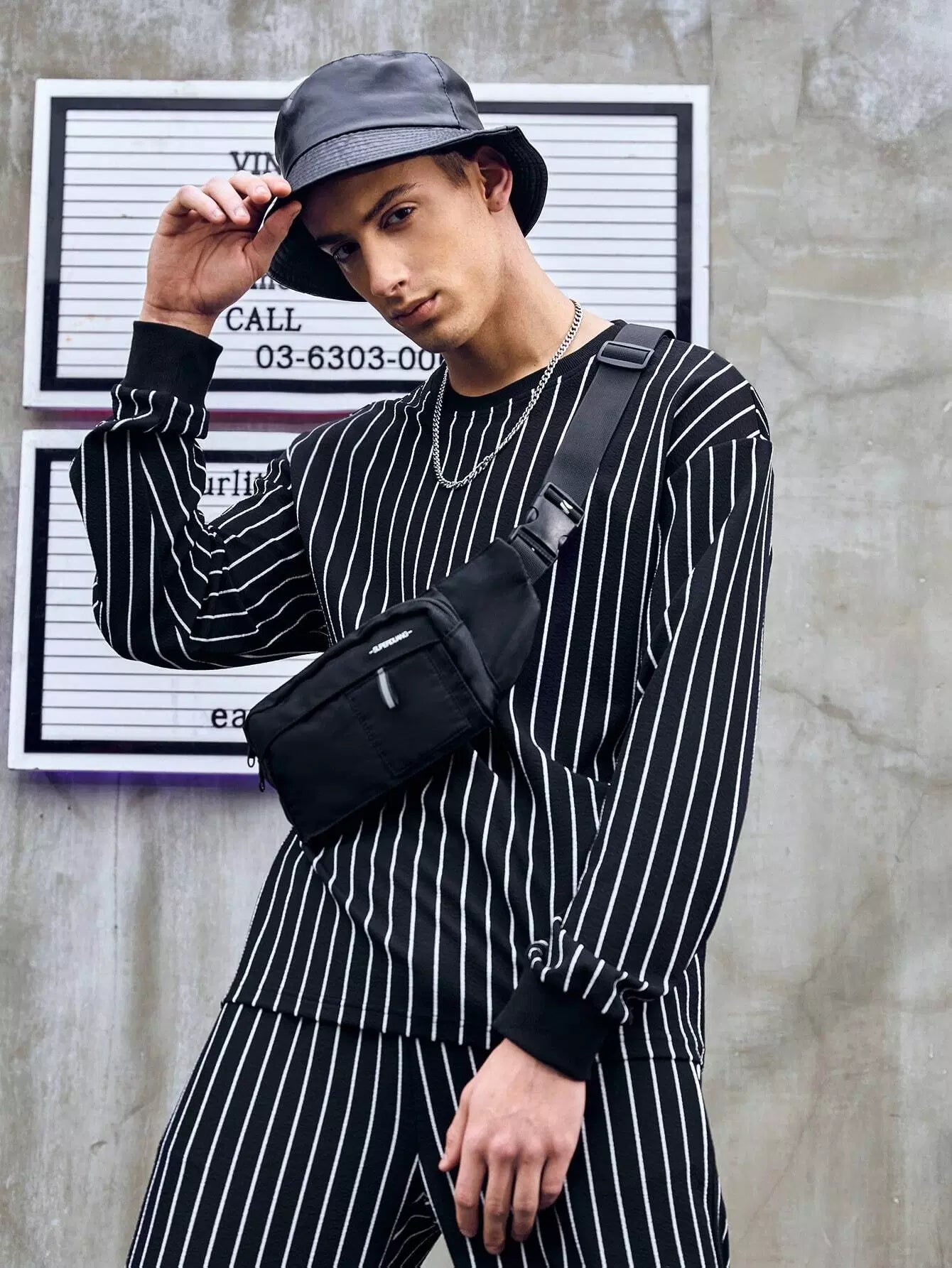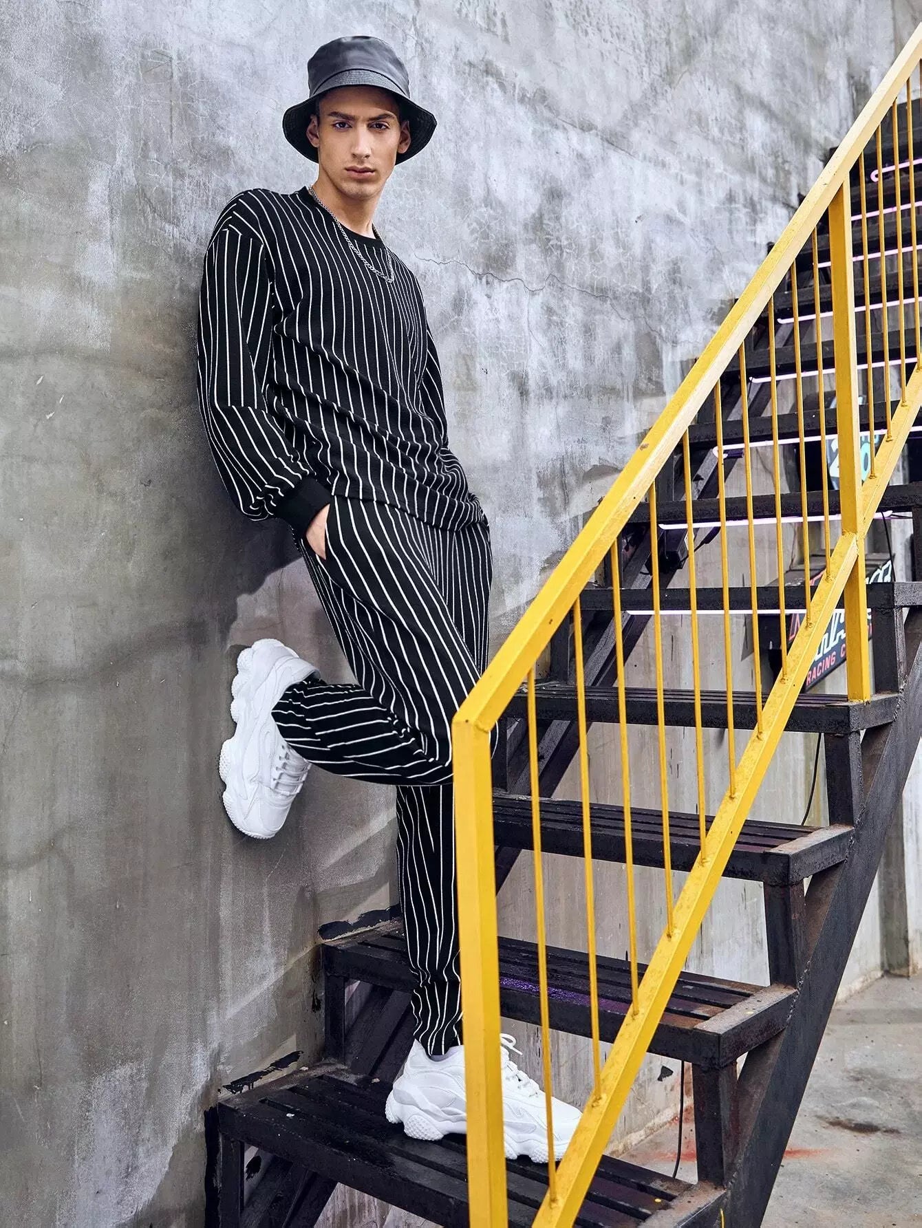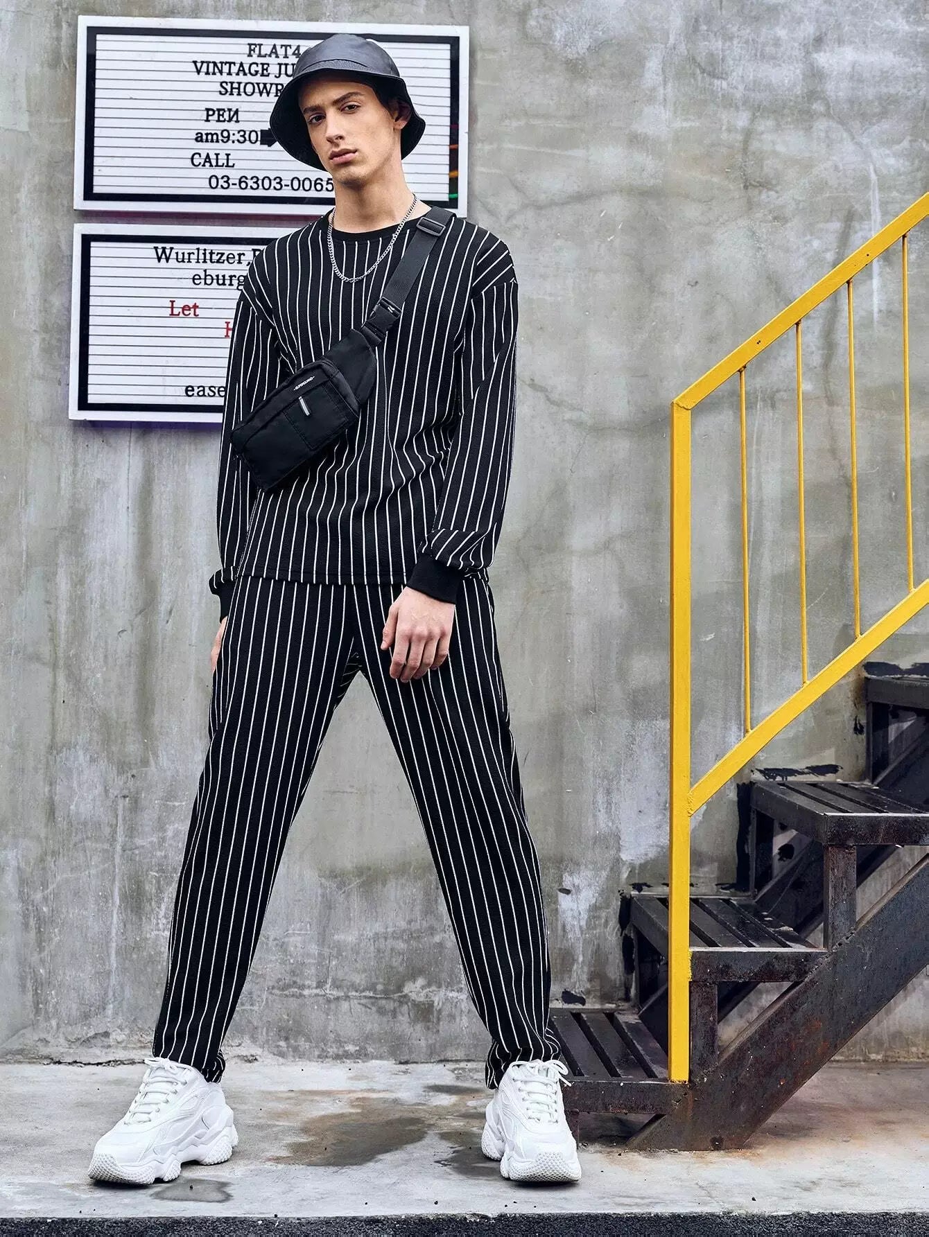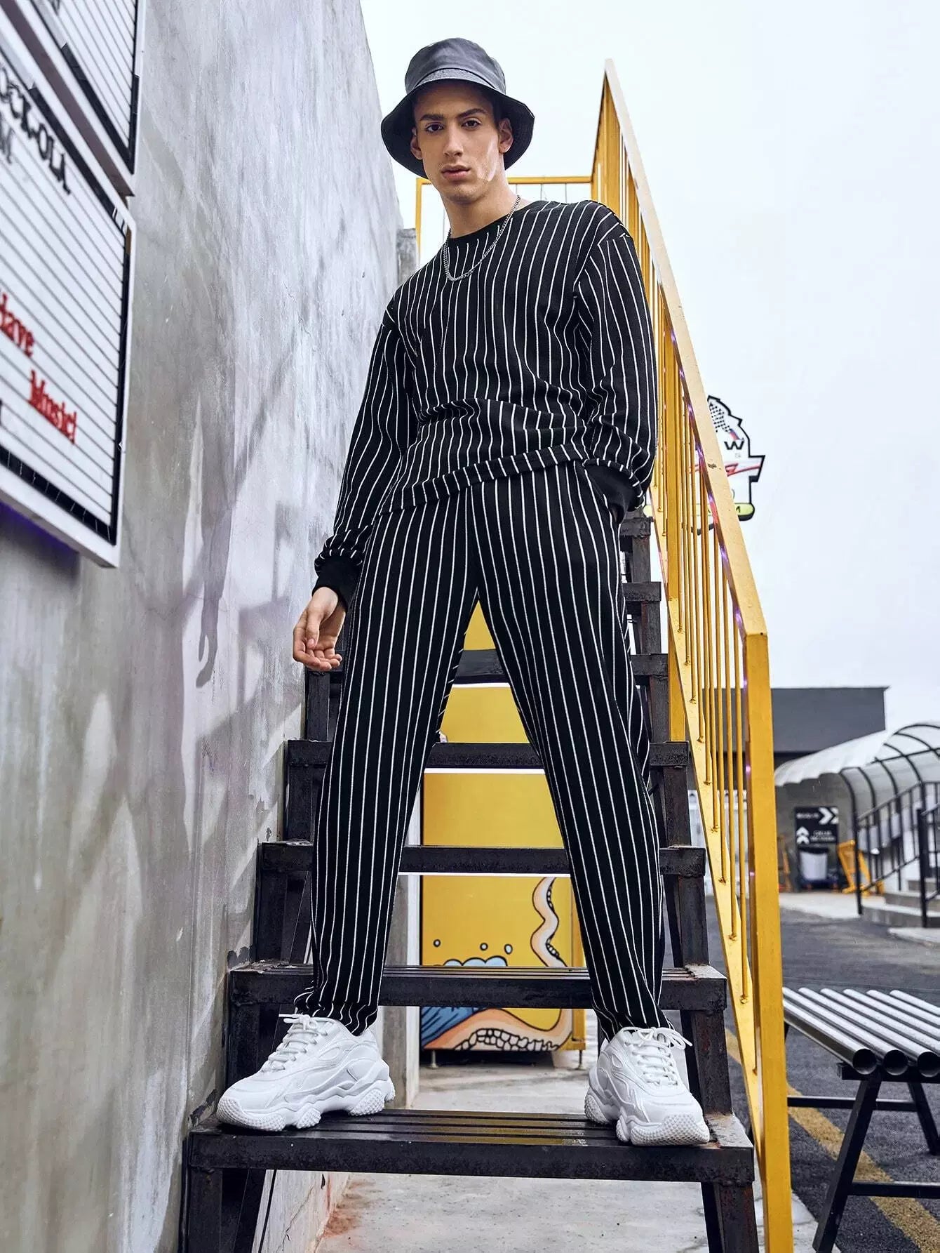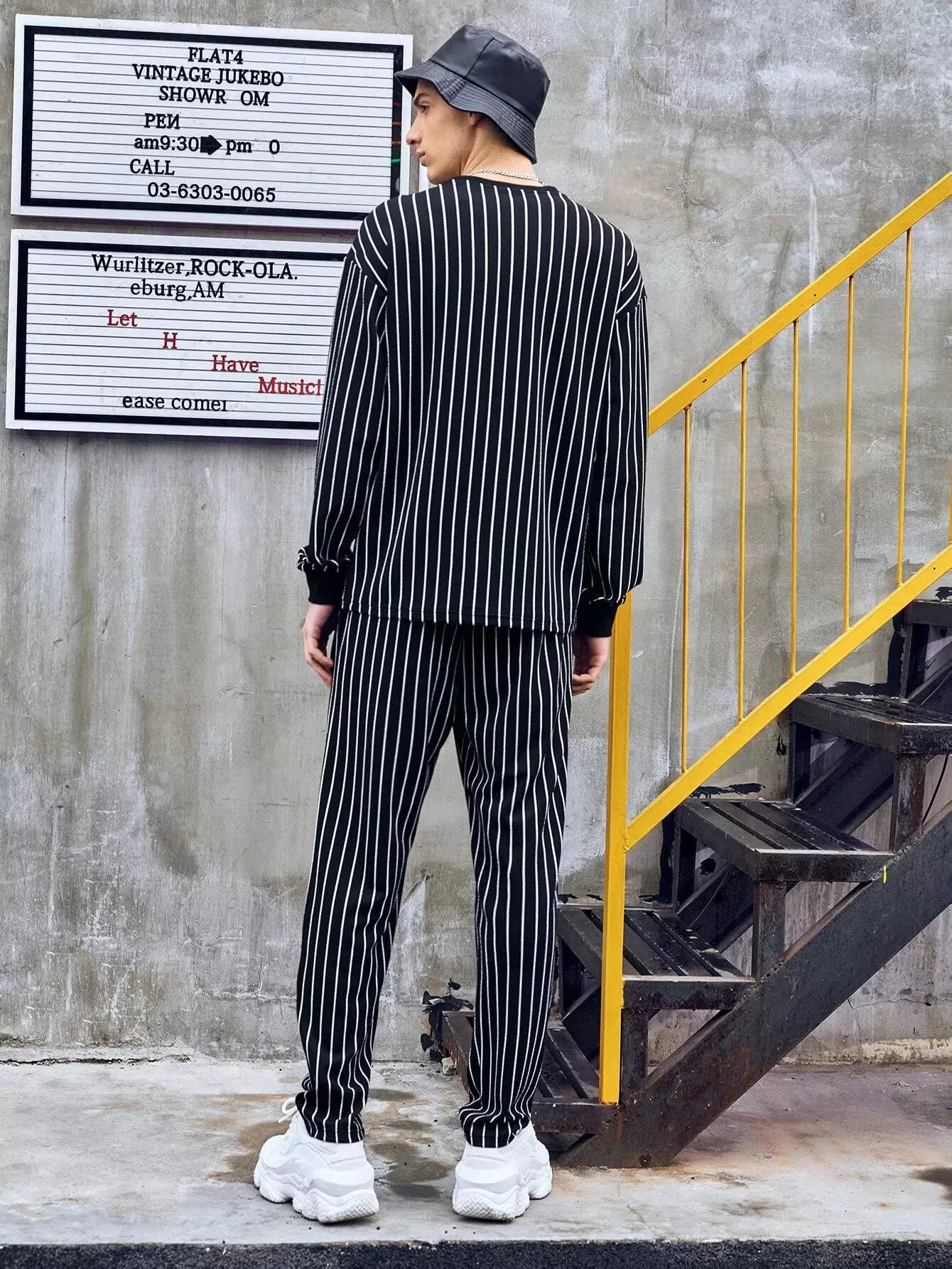 Men Drop Shoulder Striped Pullover & Sweatpants Set