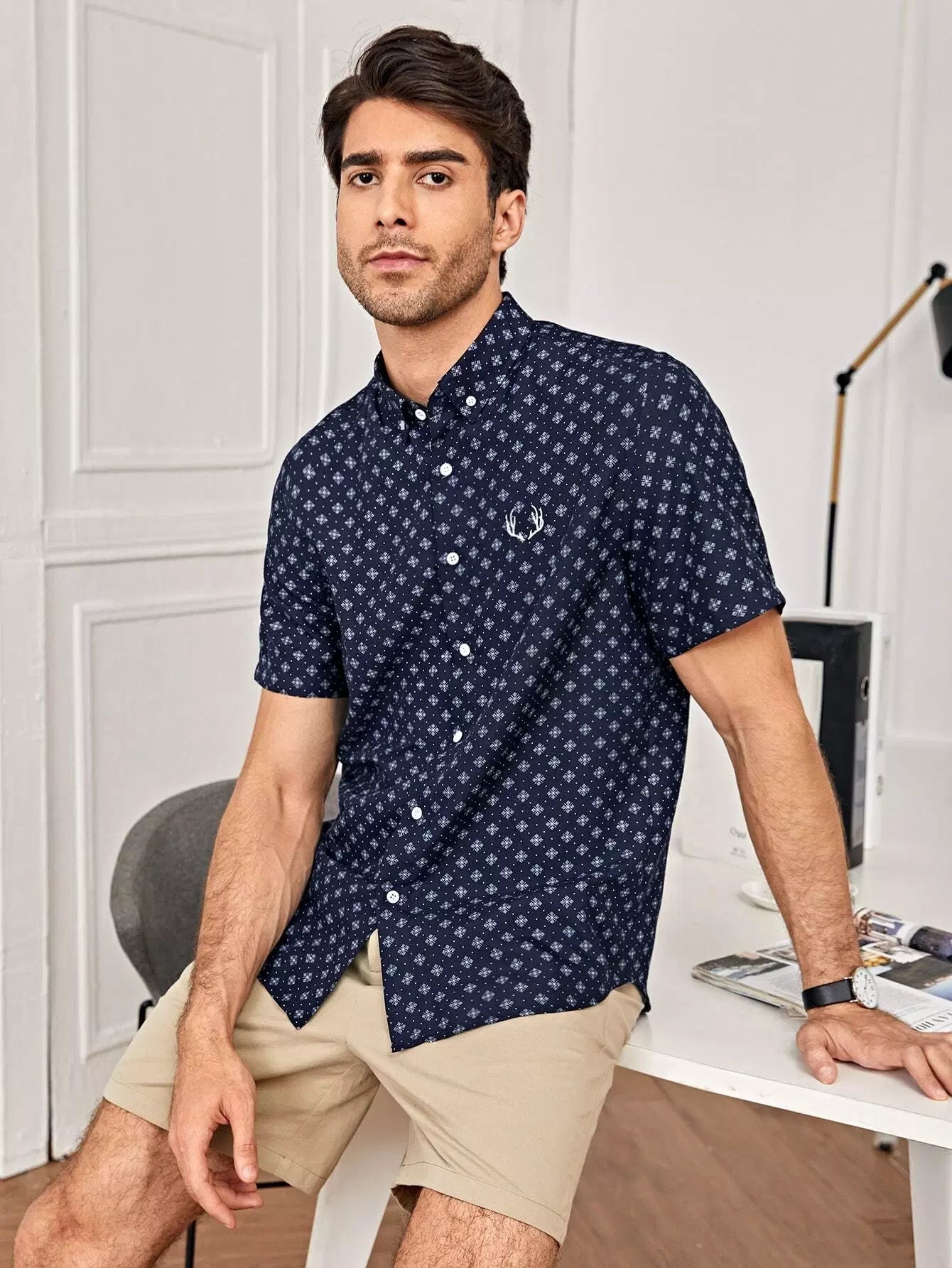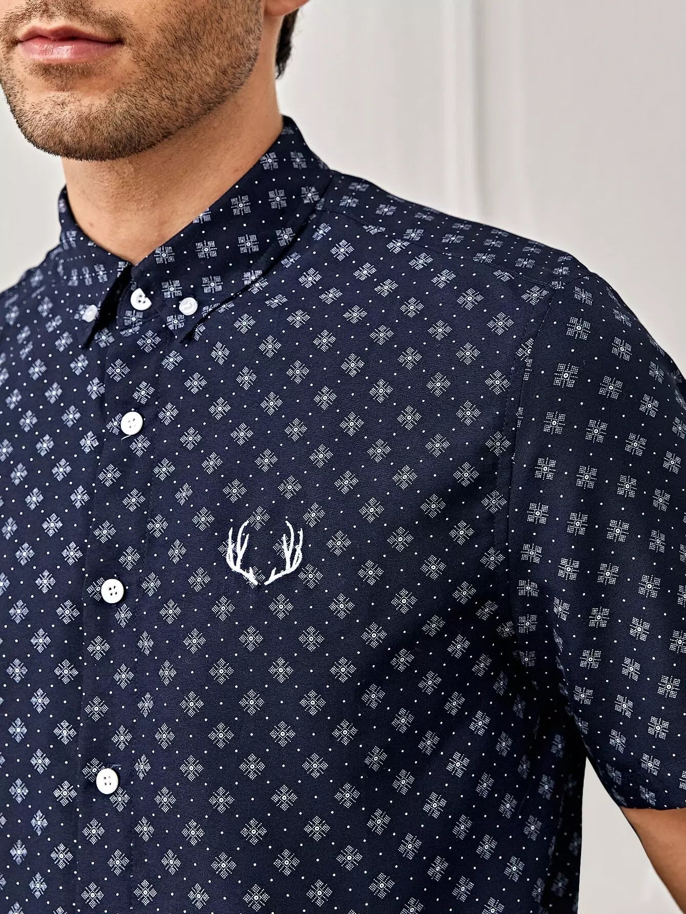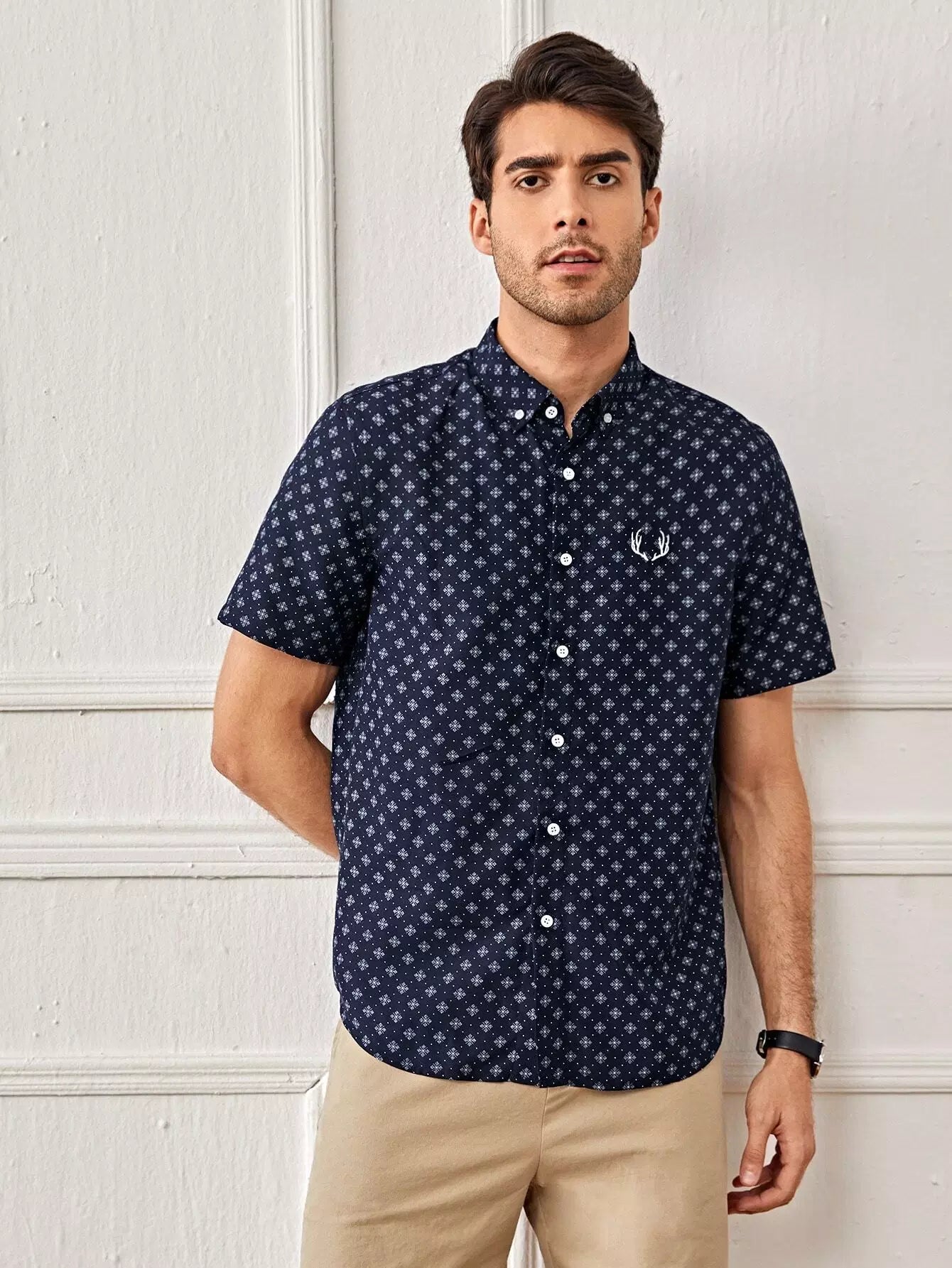 Men Embroidery Detail Allover Print Shirt