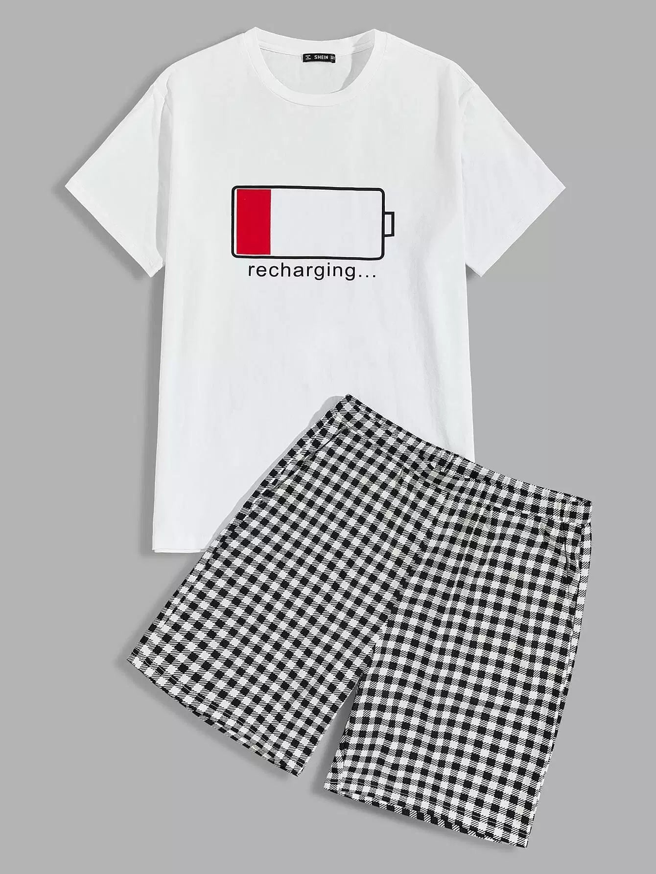 Men - Men Letter Graphic Top & Gingham Shorts PJ Set