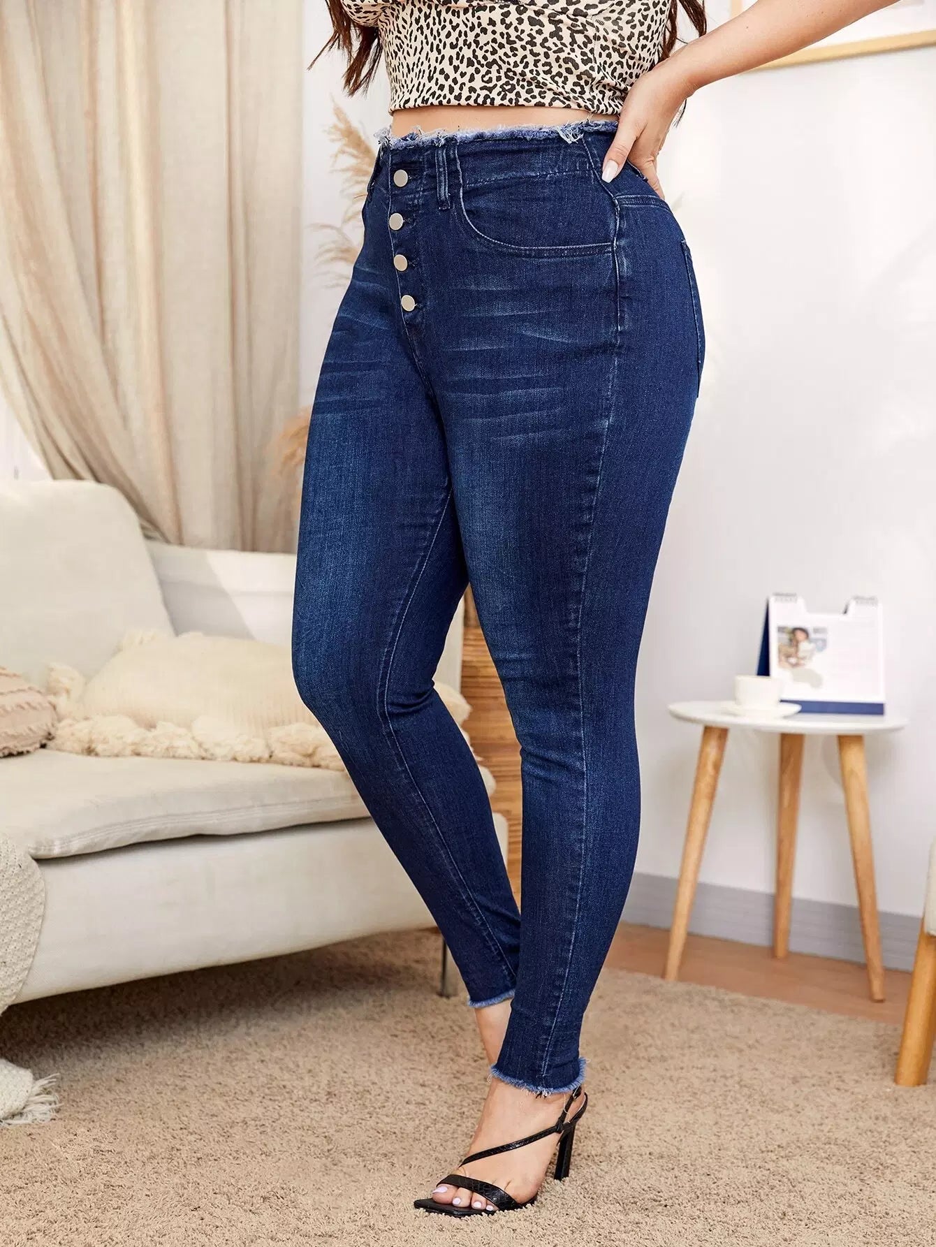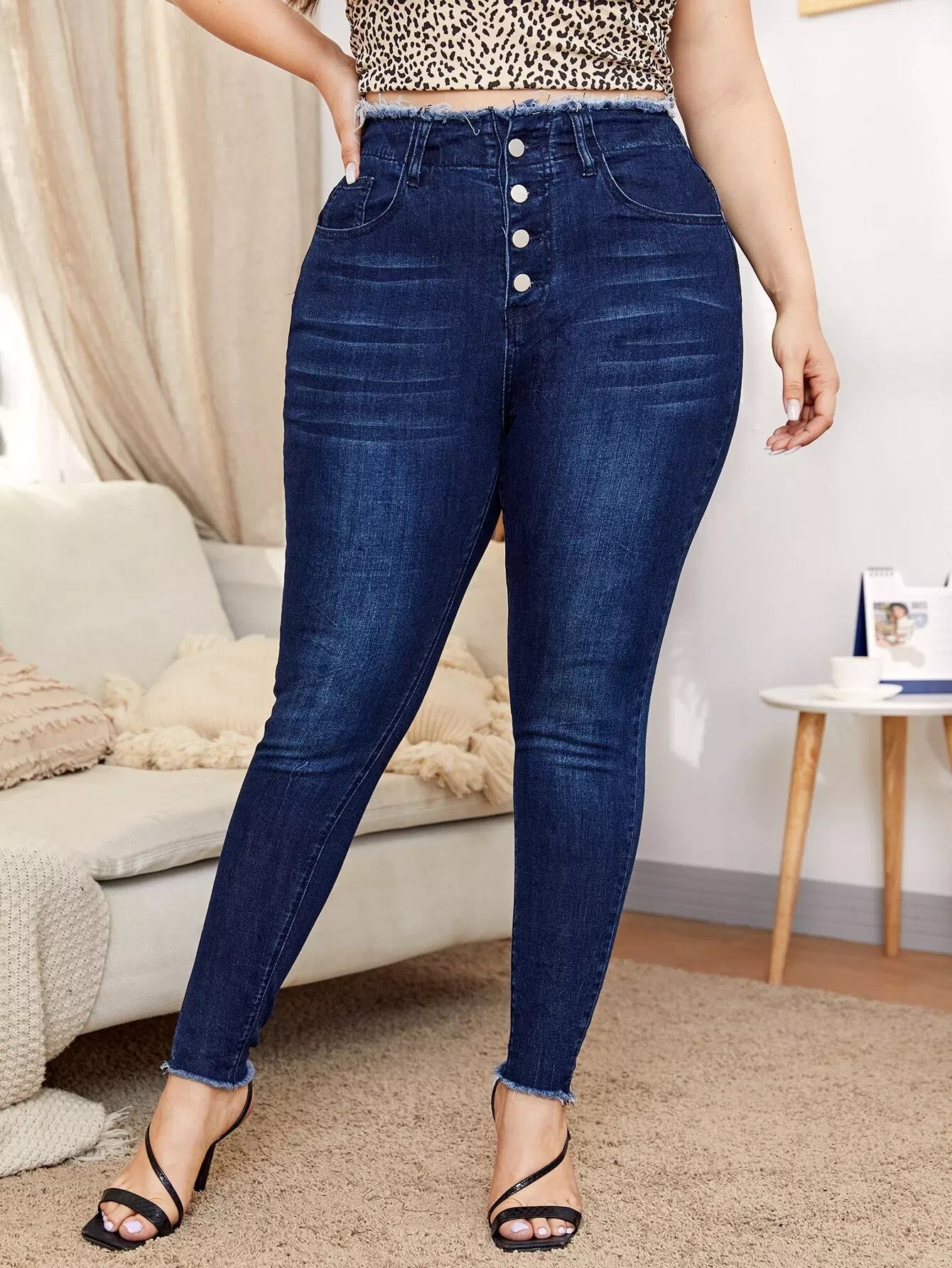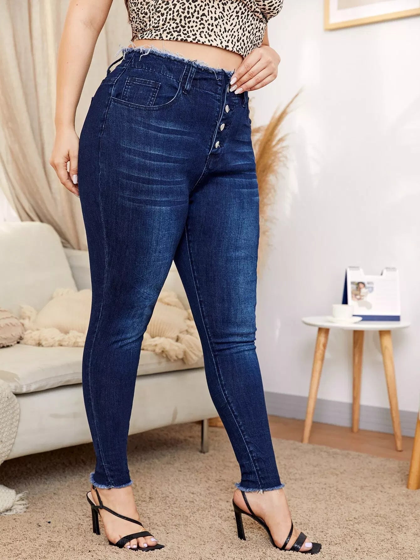 Plus Buttoned Fly High Stretch Raw Trim Fitted Jeans
