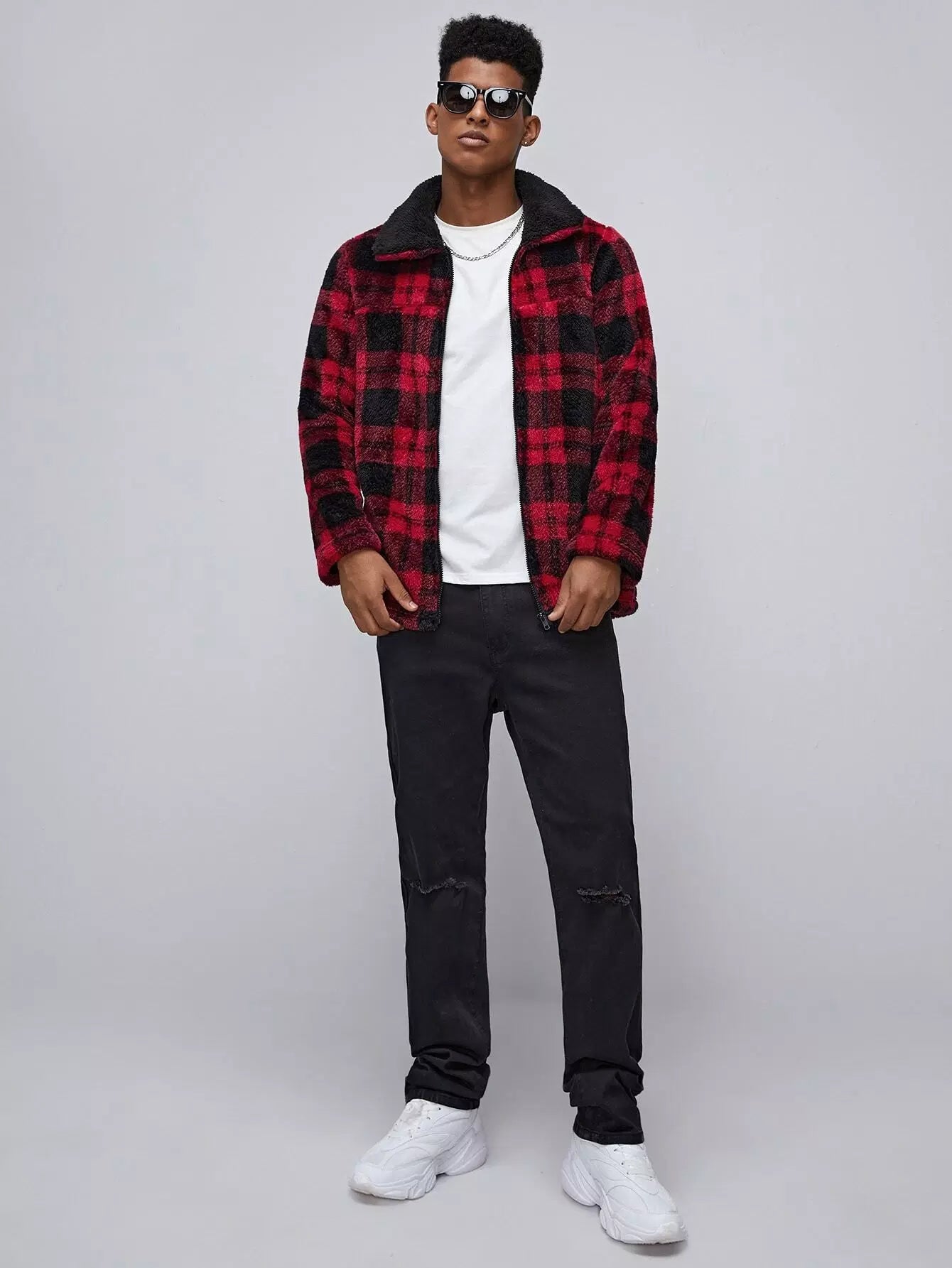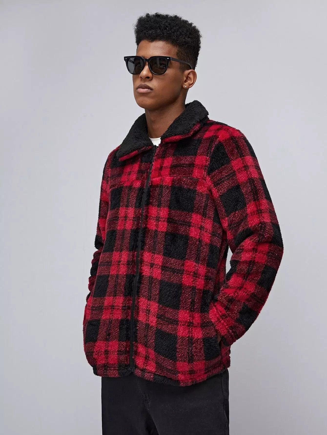 Men Plaid Pattern Slant Pockets Teddy Jacket