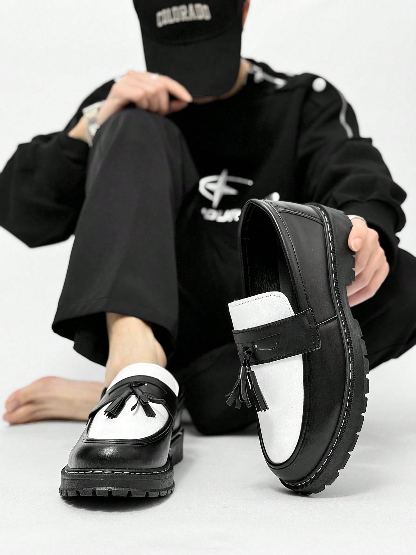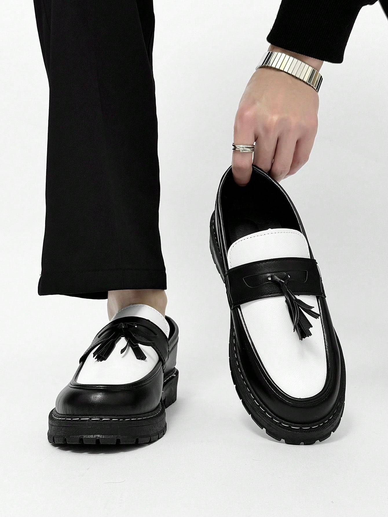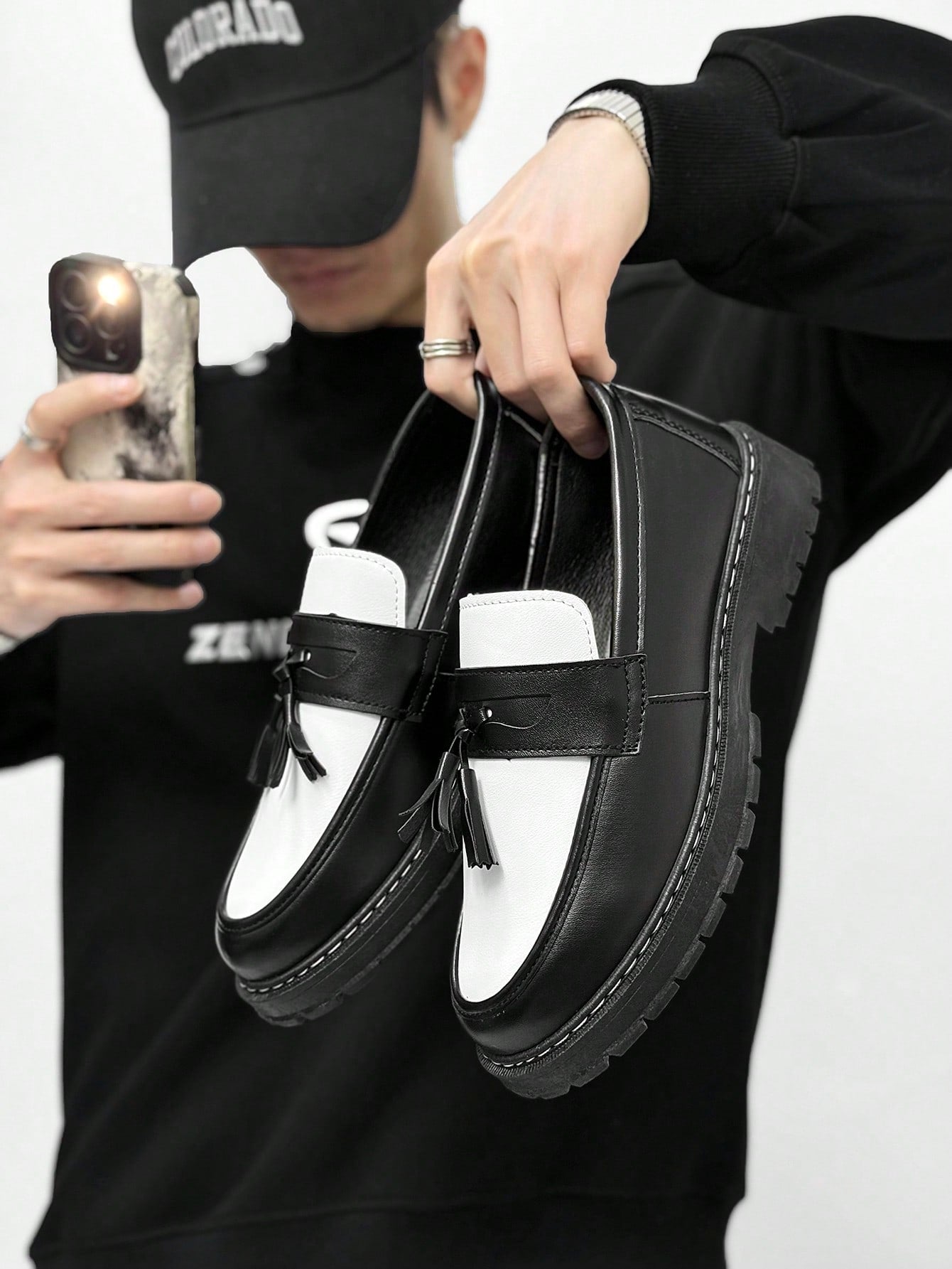 Men's Casual Thick Sole Slip-On Increased Height Plain Black Leather Shoes