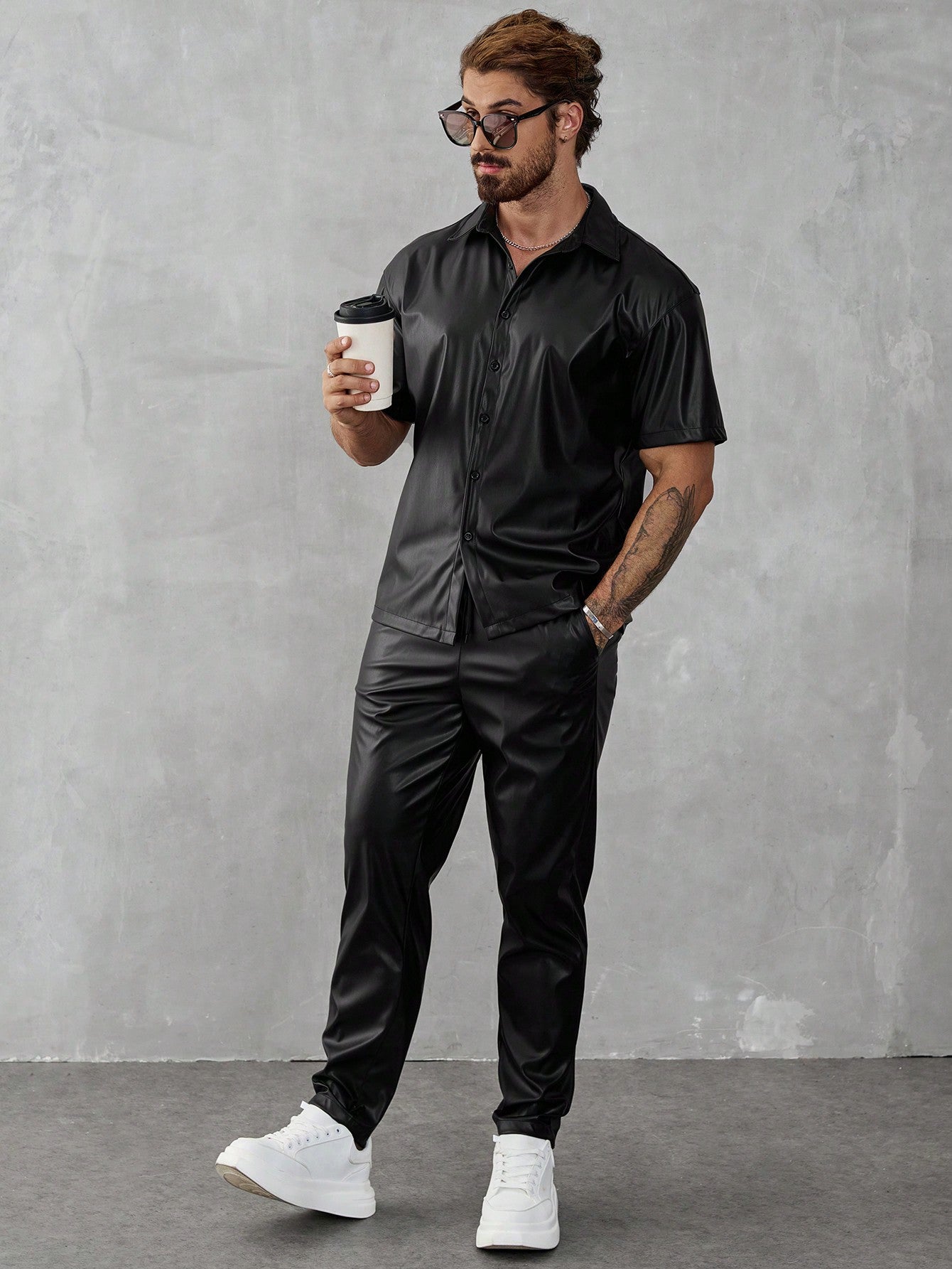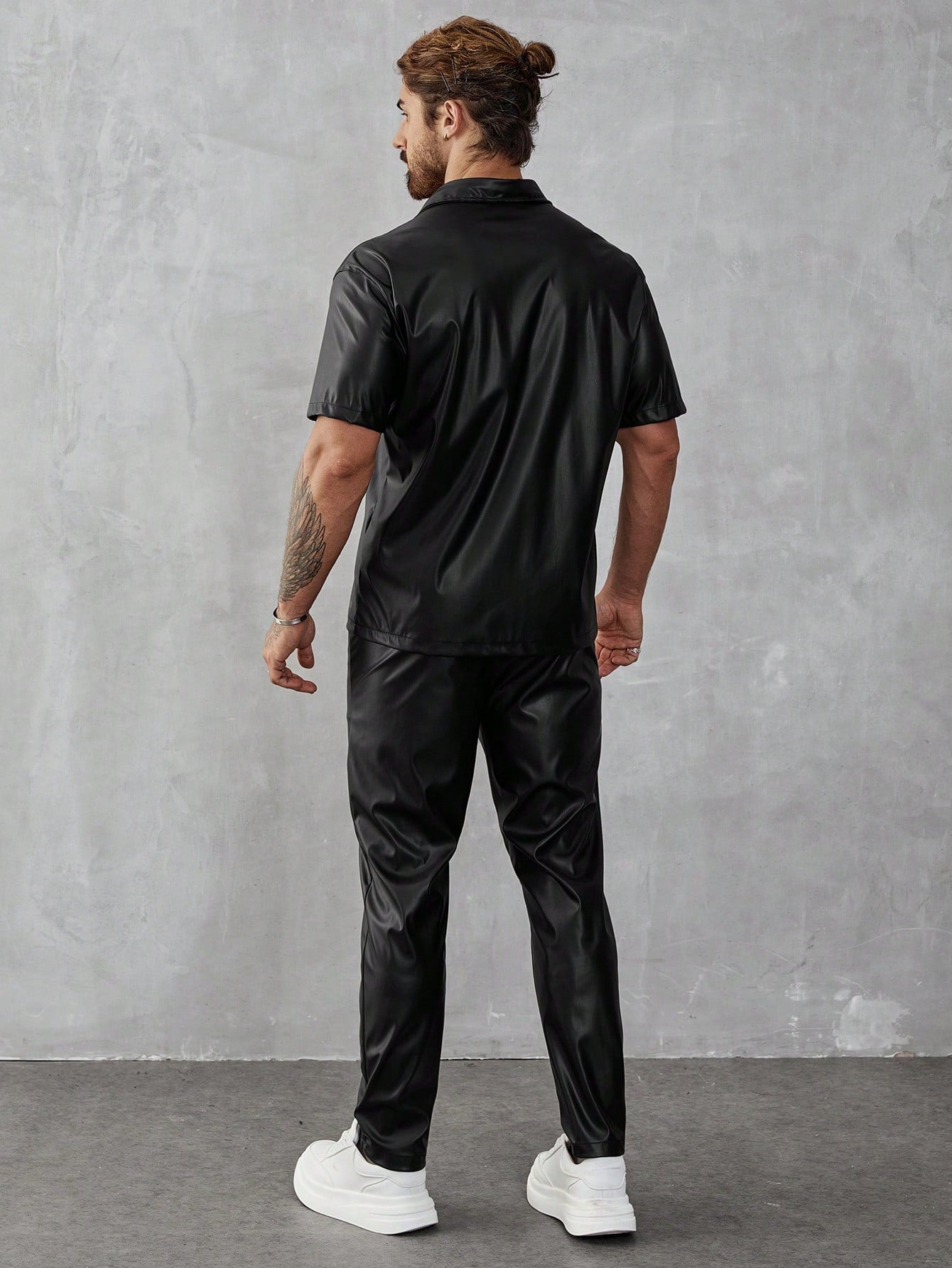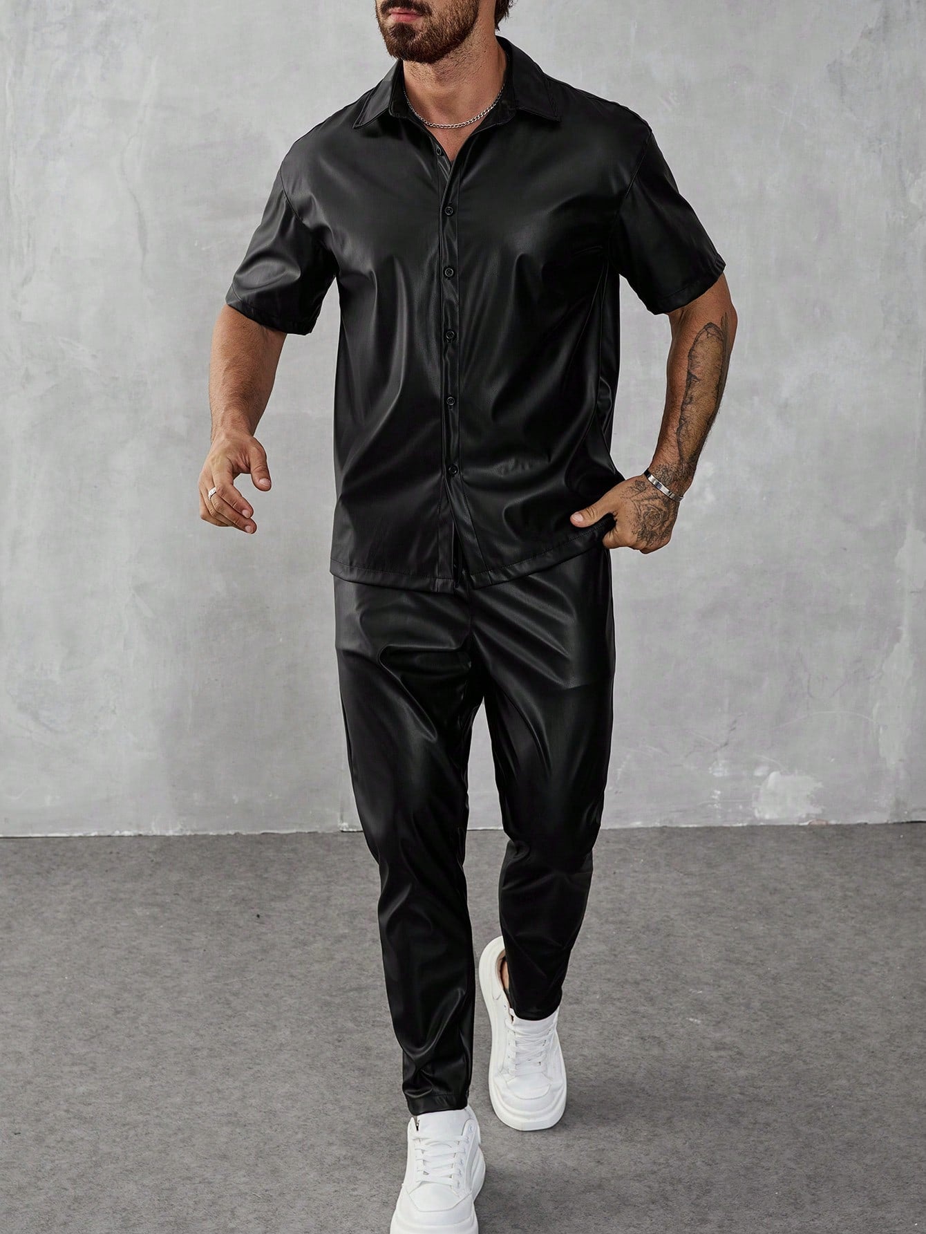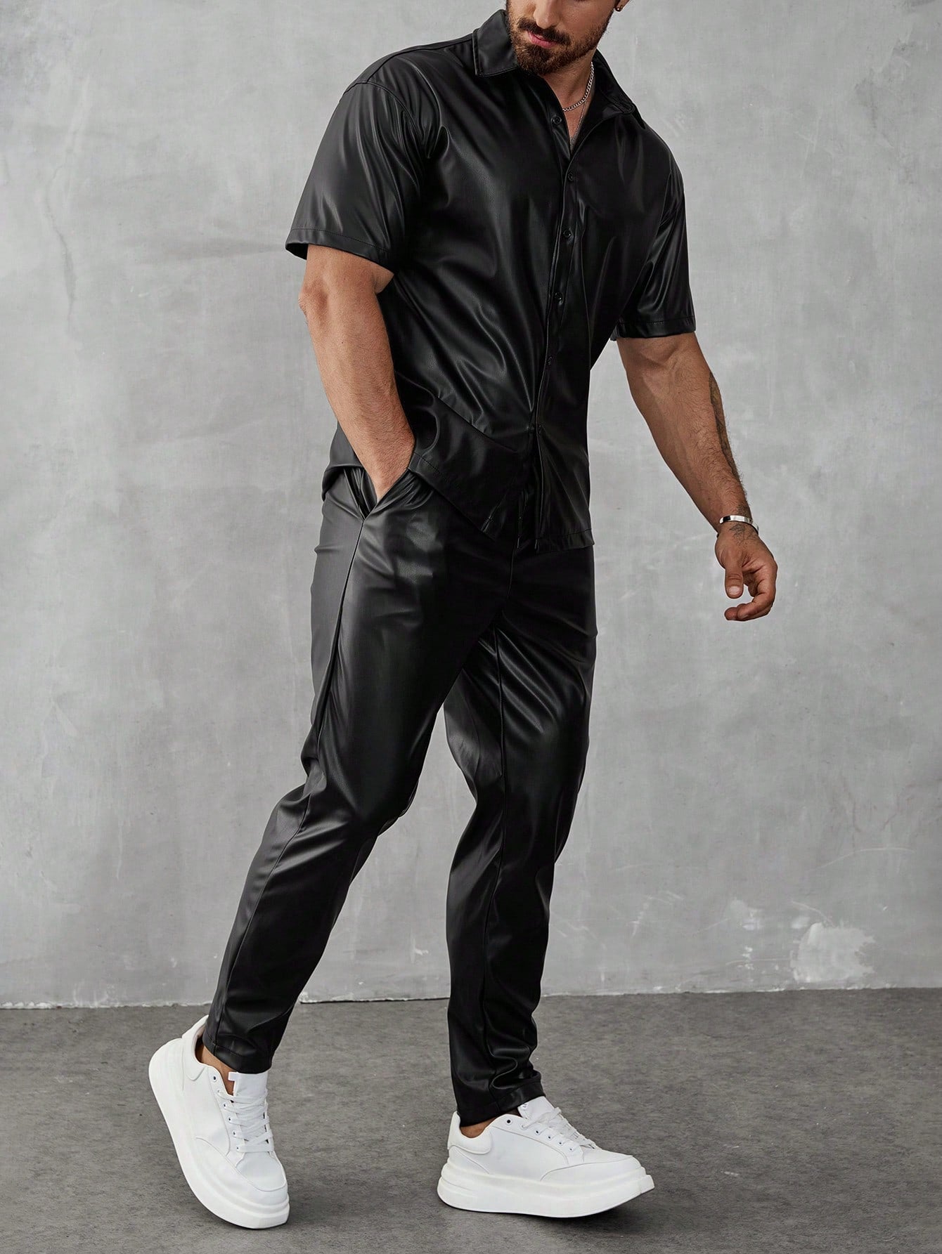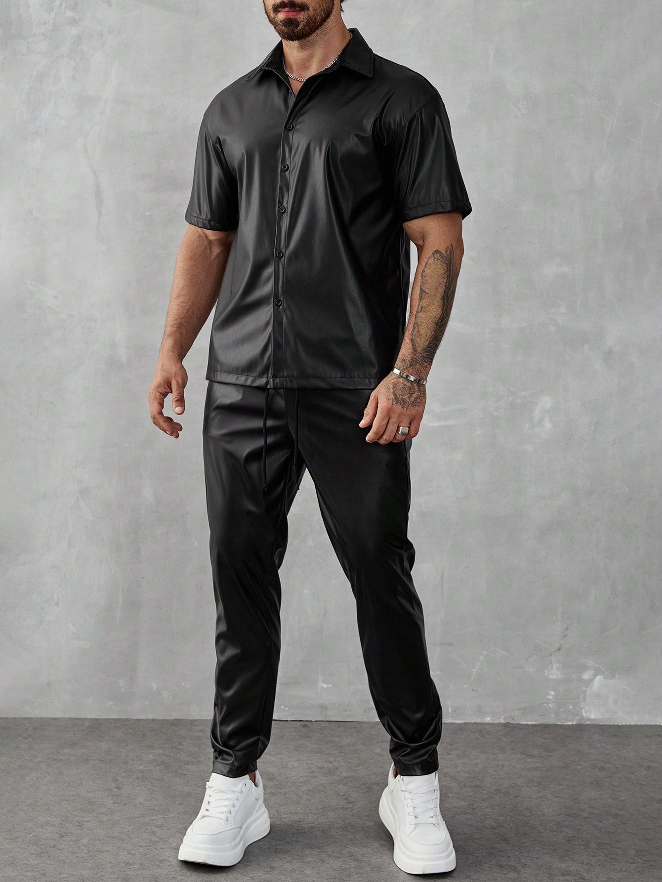 Manfinity LEGND PU 2pcs Men's Solid Color Short Sleeve Shirt And Pants Set