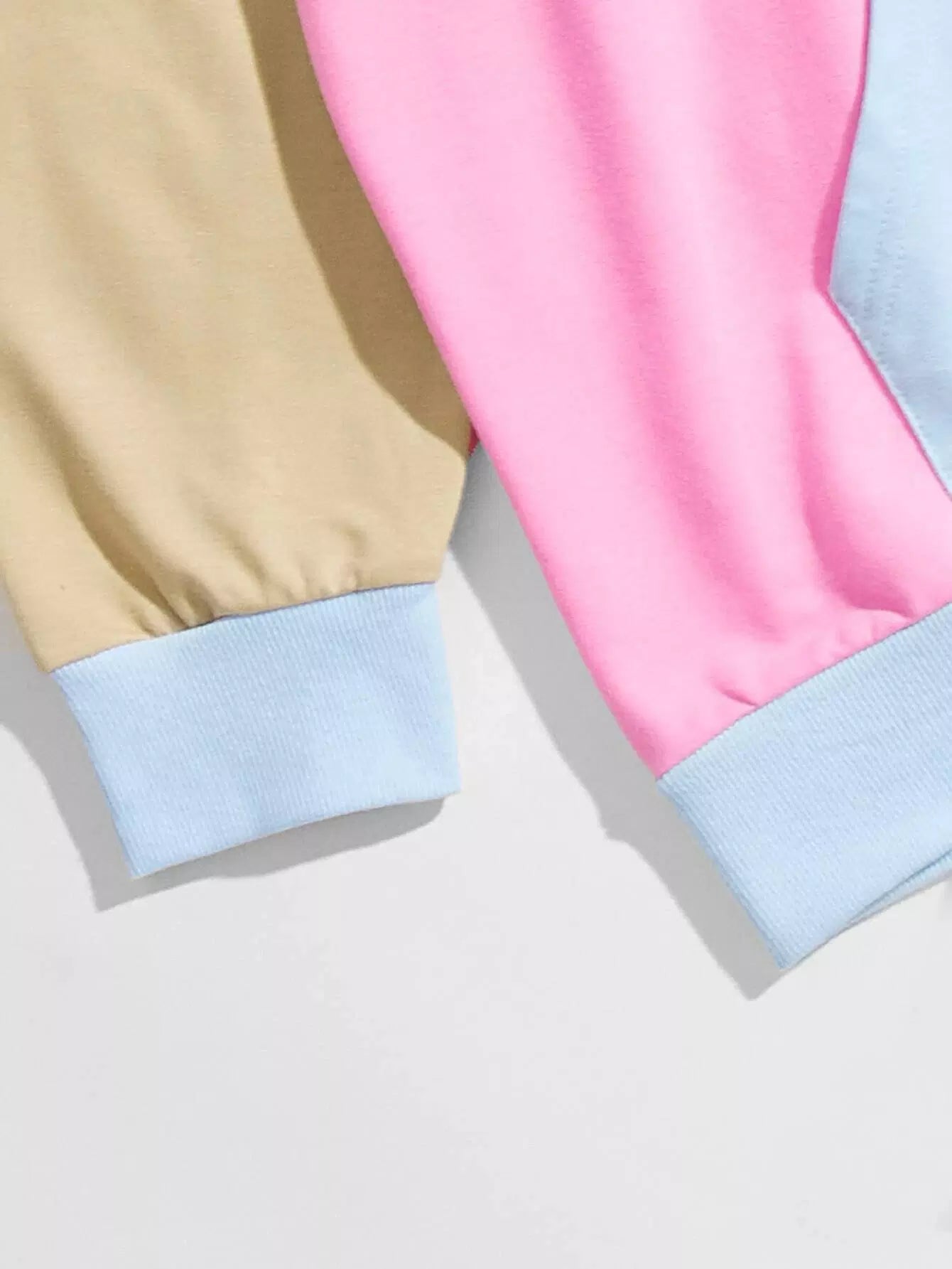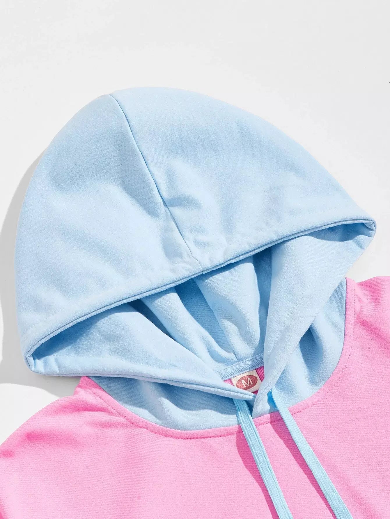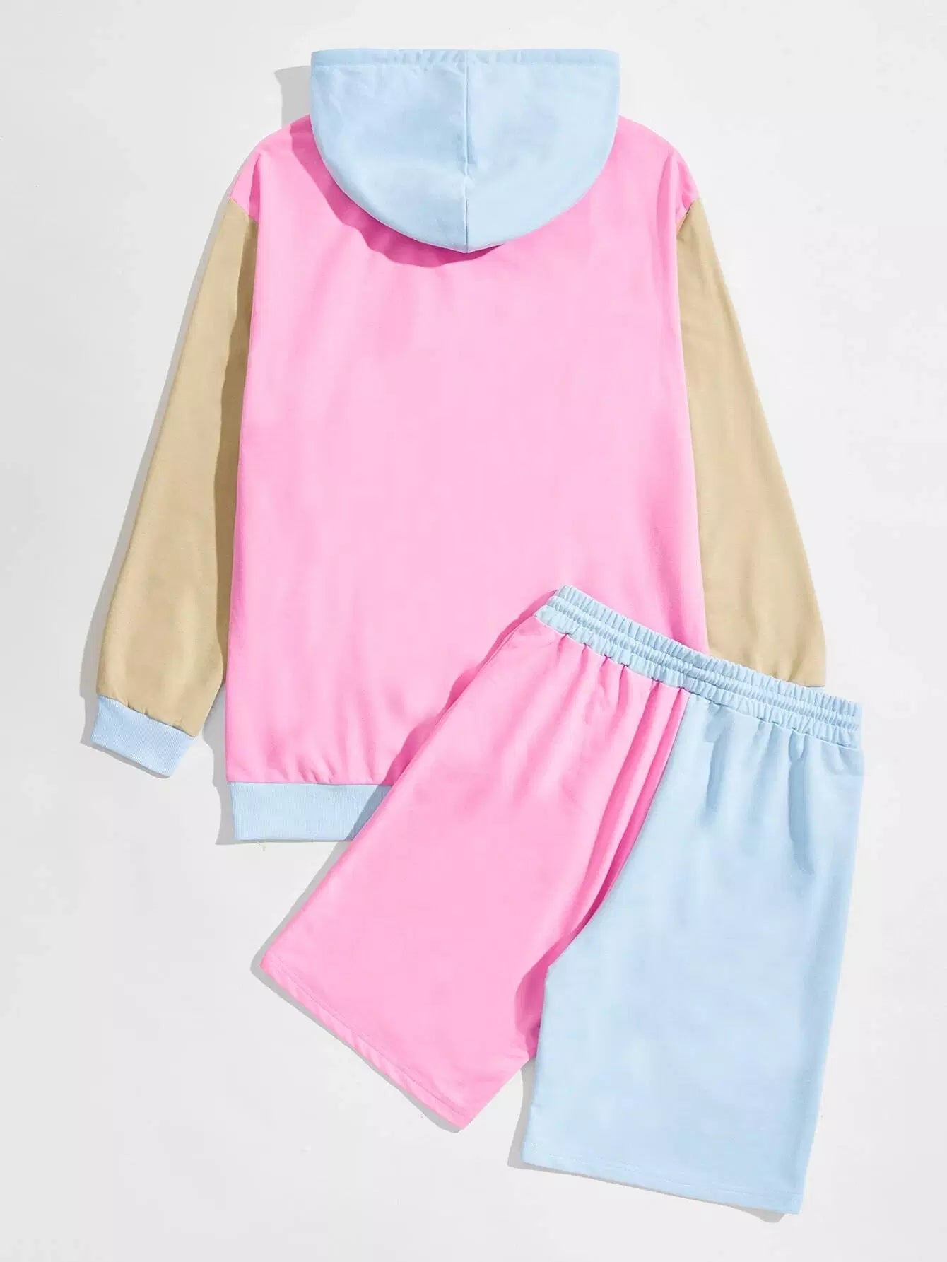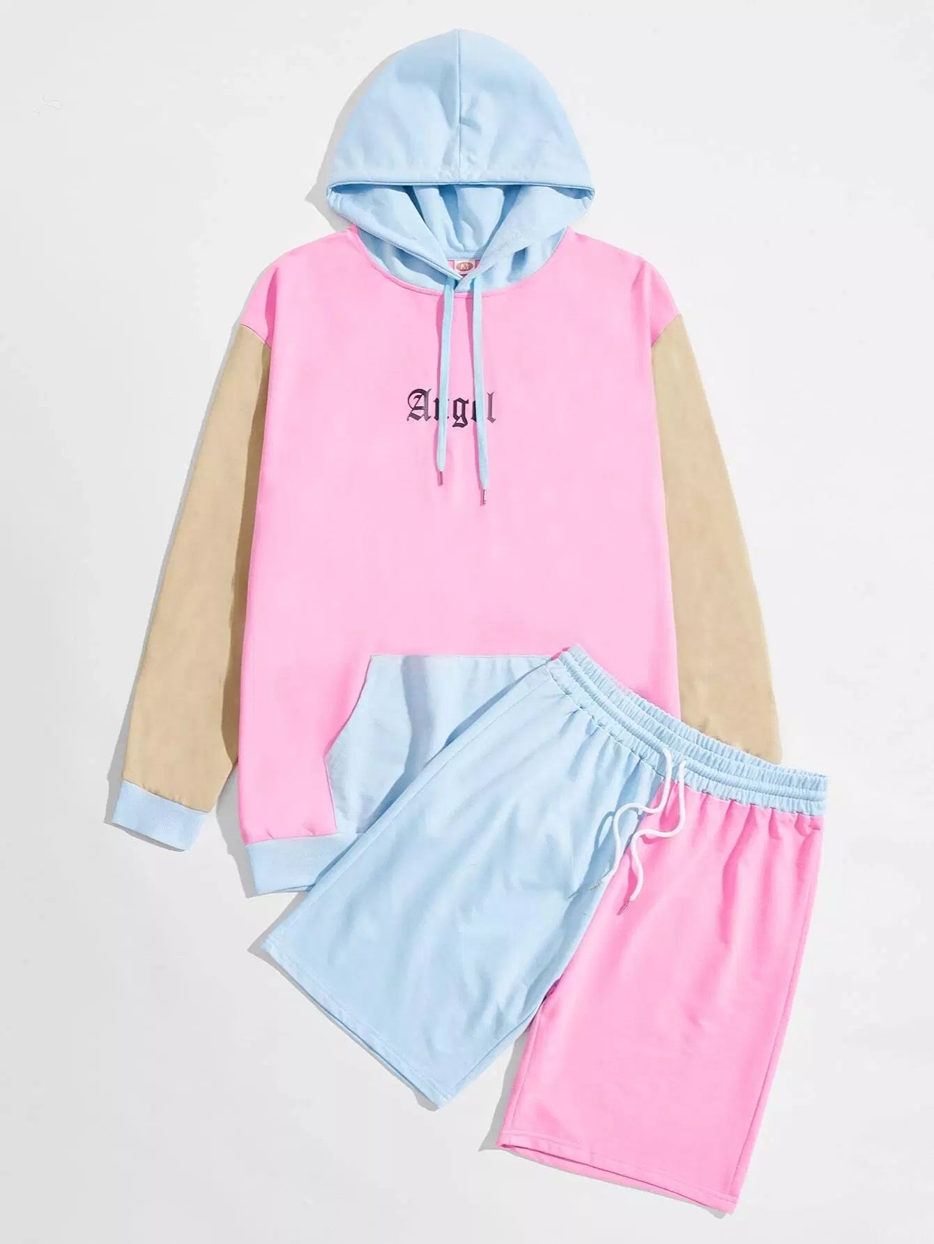 Men Color-block Letter Graphic Drawstring Hoodie & Shorts