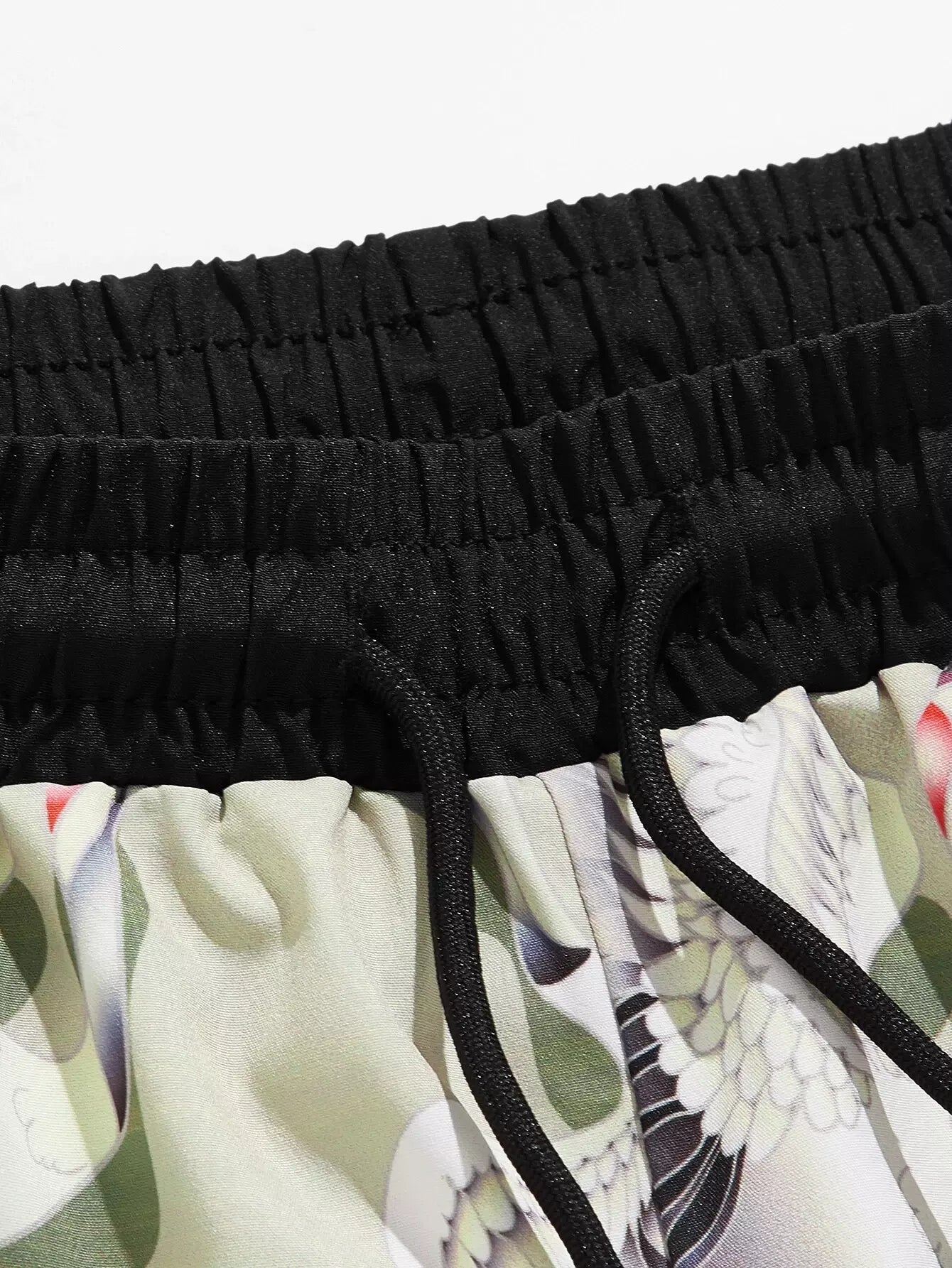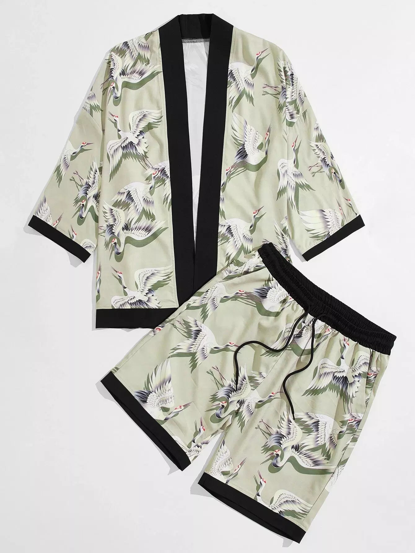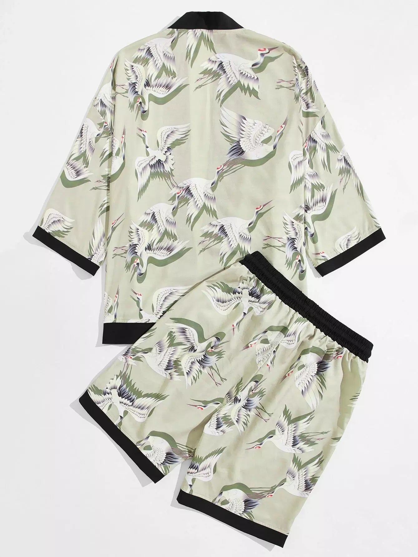 Men - Men Crane Print Contrast Binding Kimono & Shorts