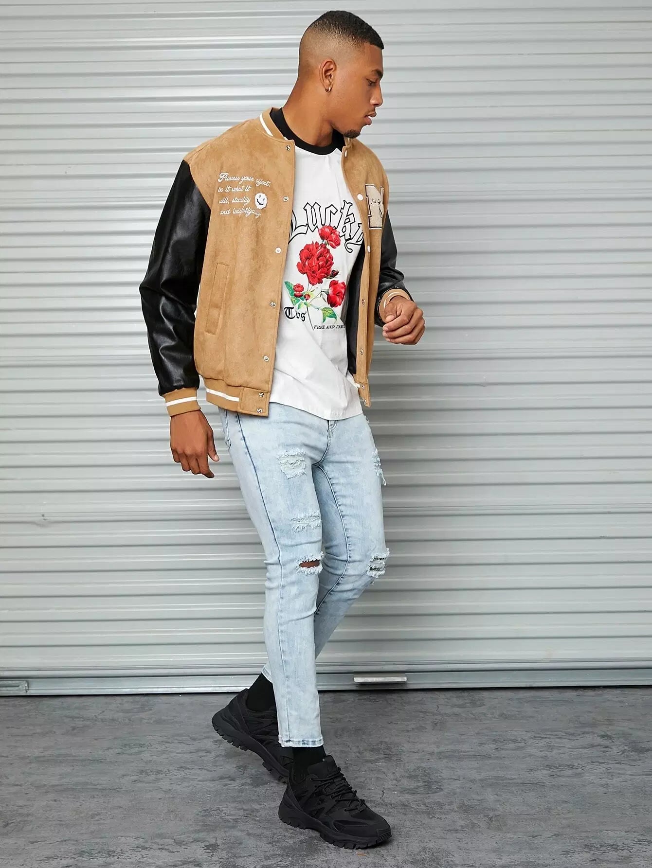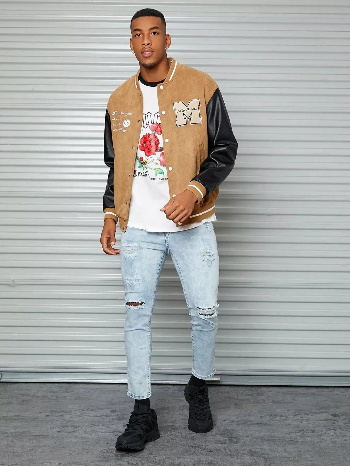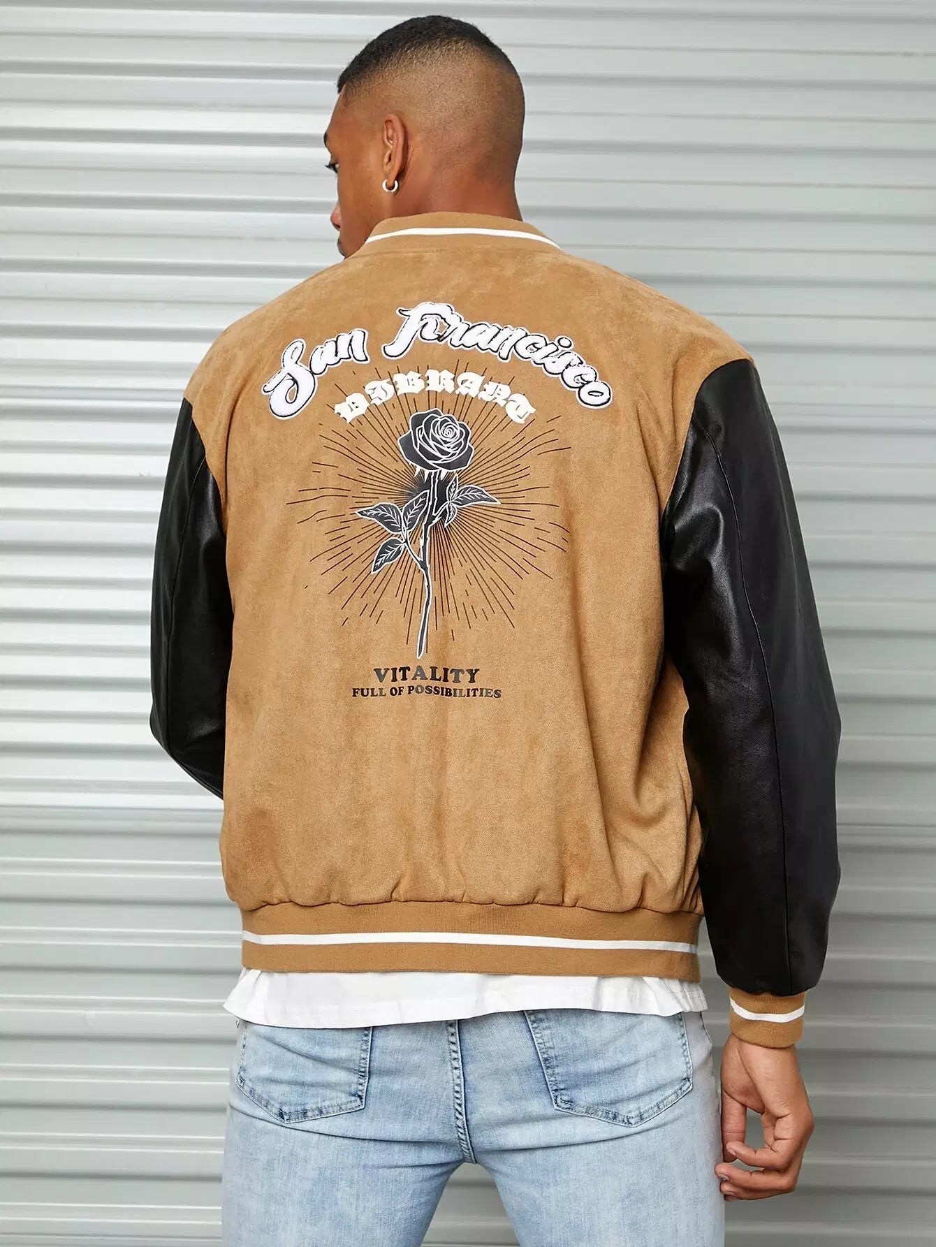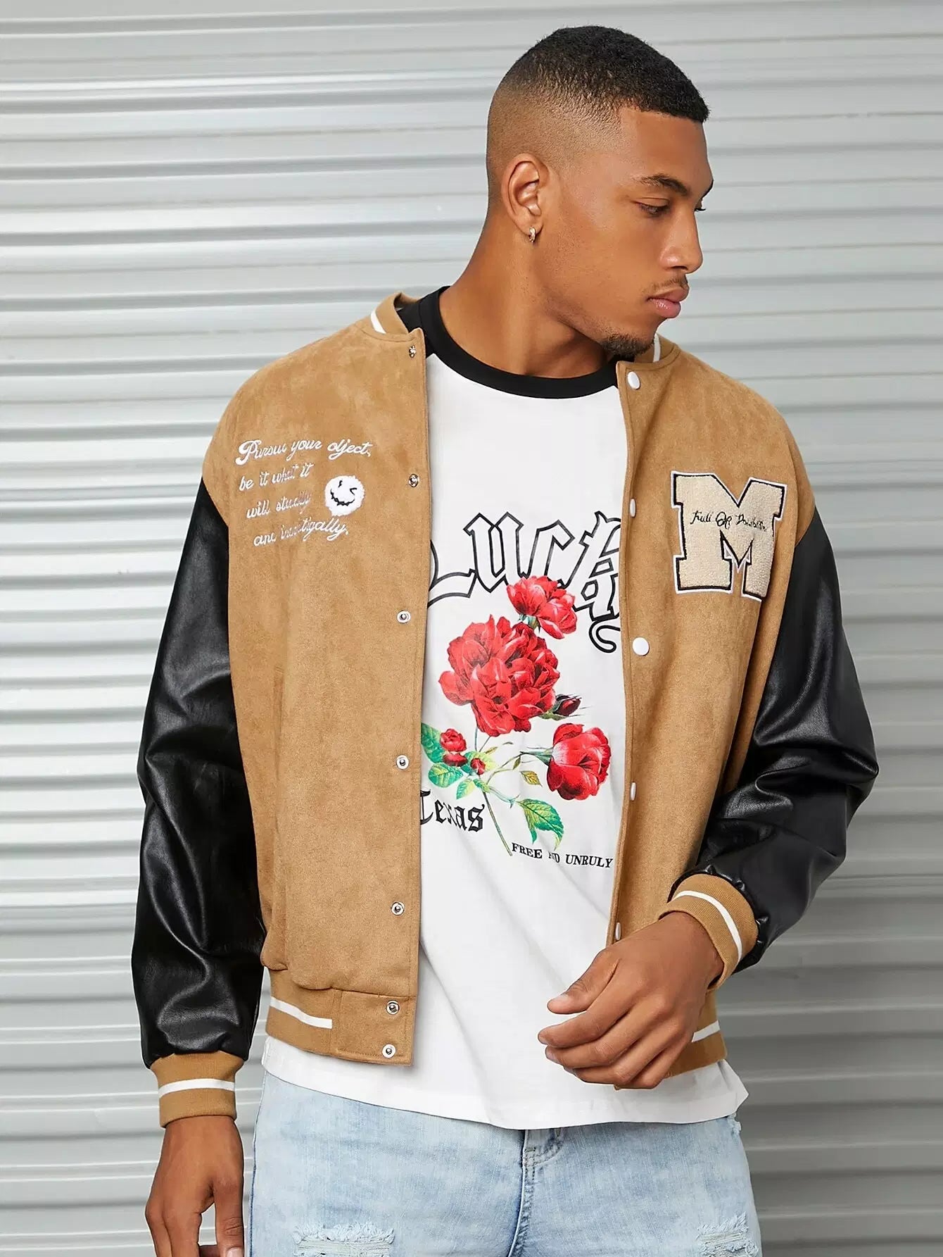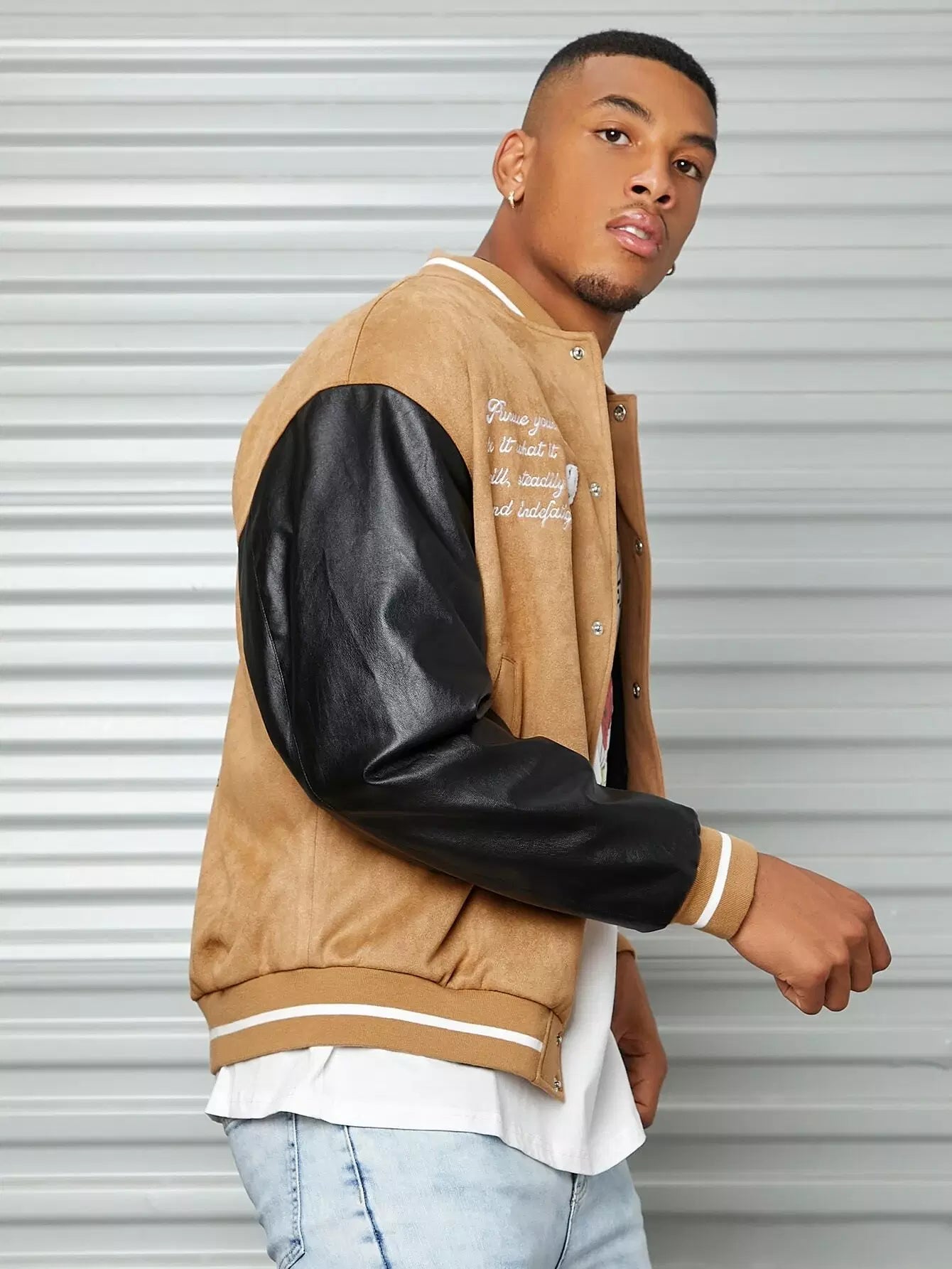 Men Letter Patched Slogan Embroidery Colorblock Striped Trim Suedette Varsity Jacket