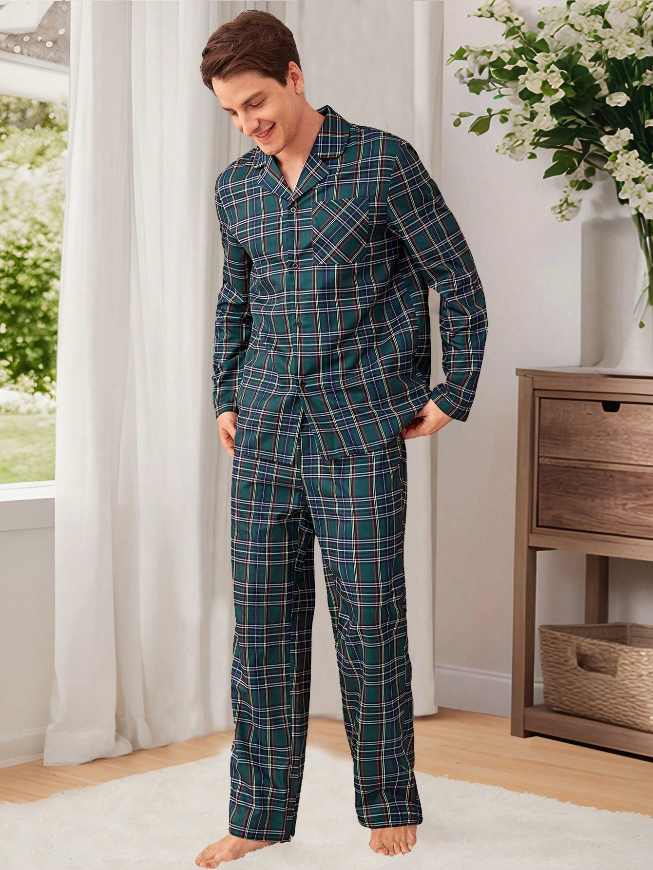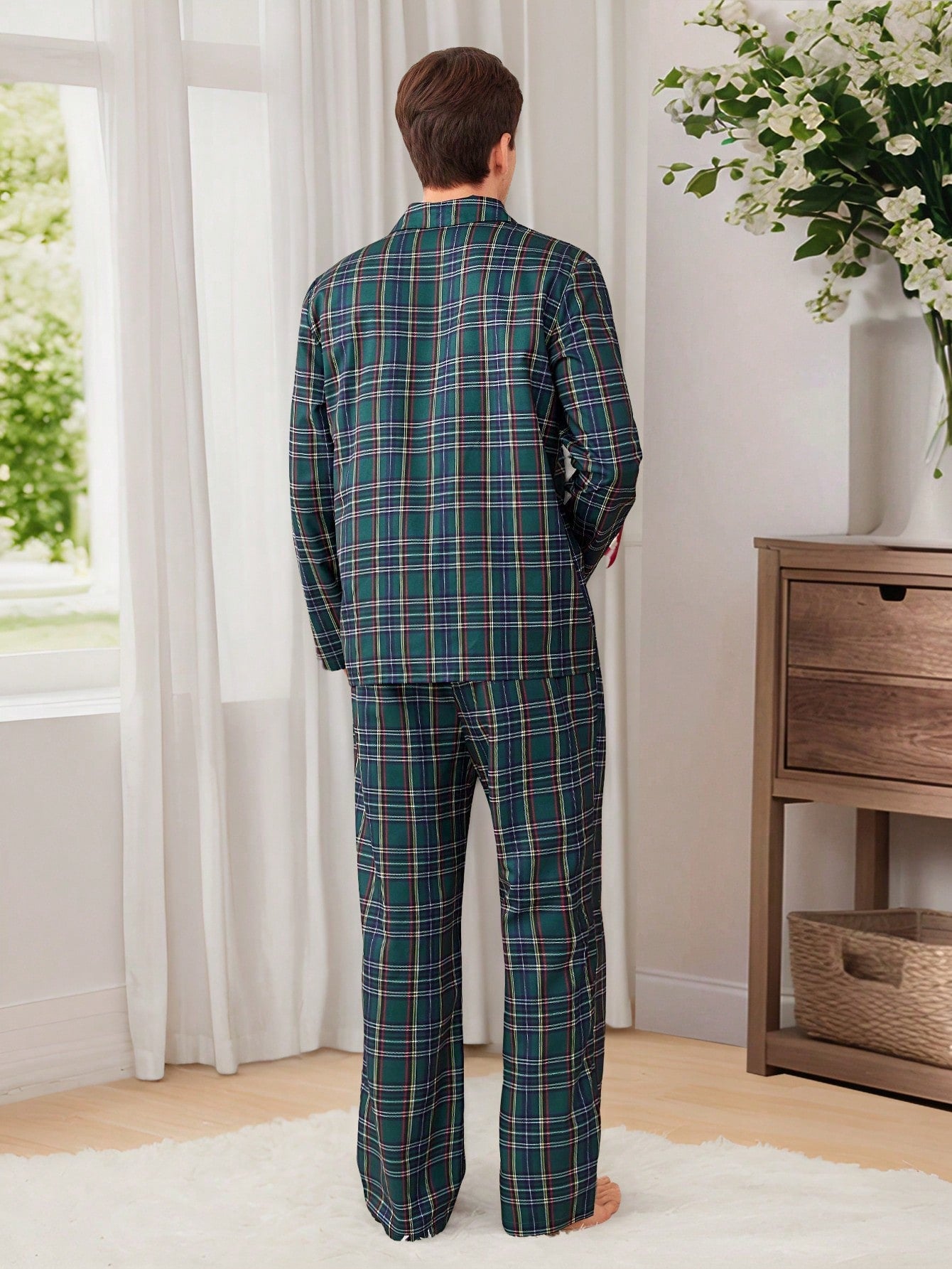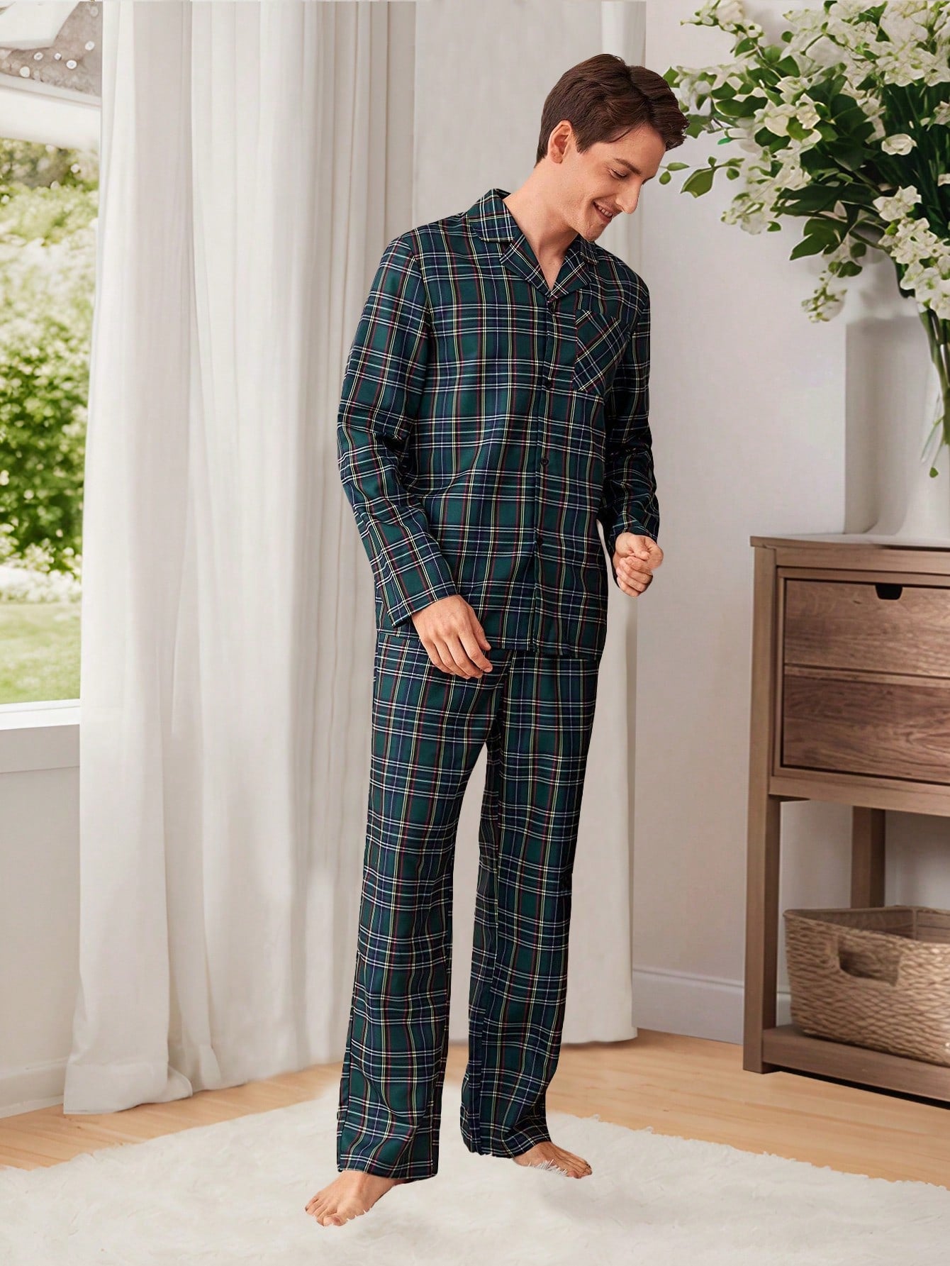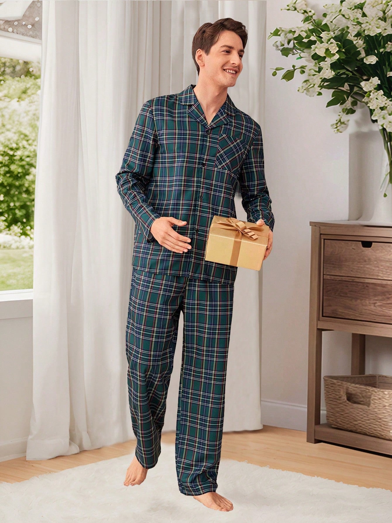 SHEIN Men's Plaid Long Sleeve Top And Pants 2 Pieces Pajama Set