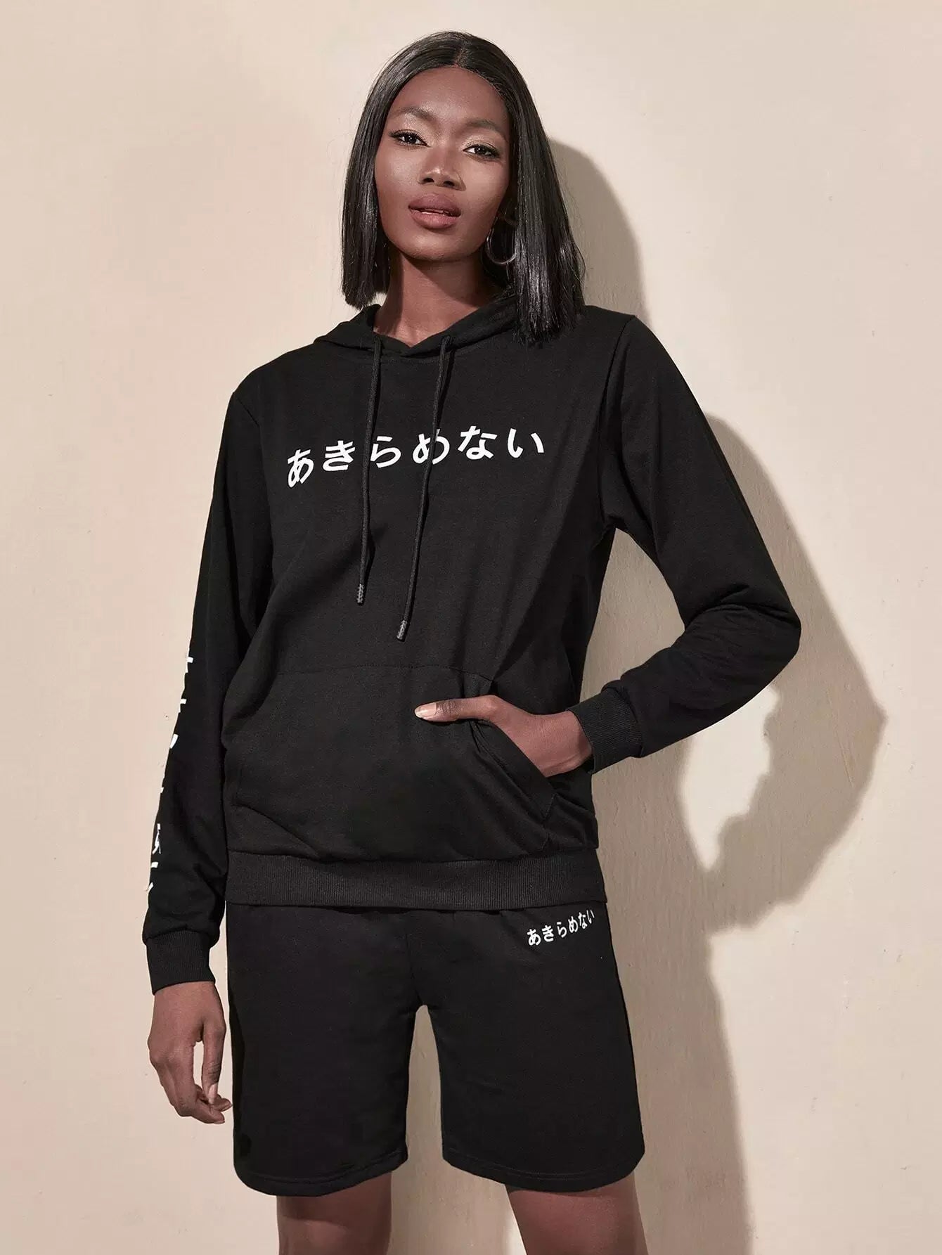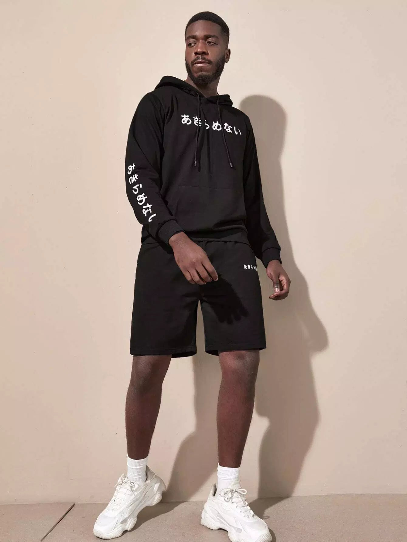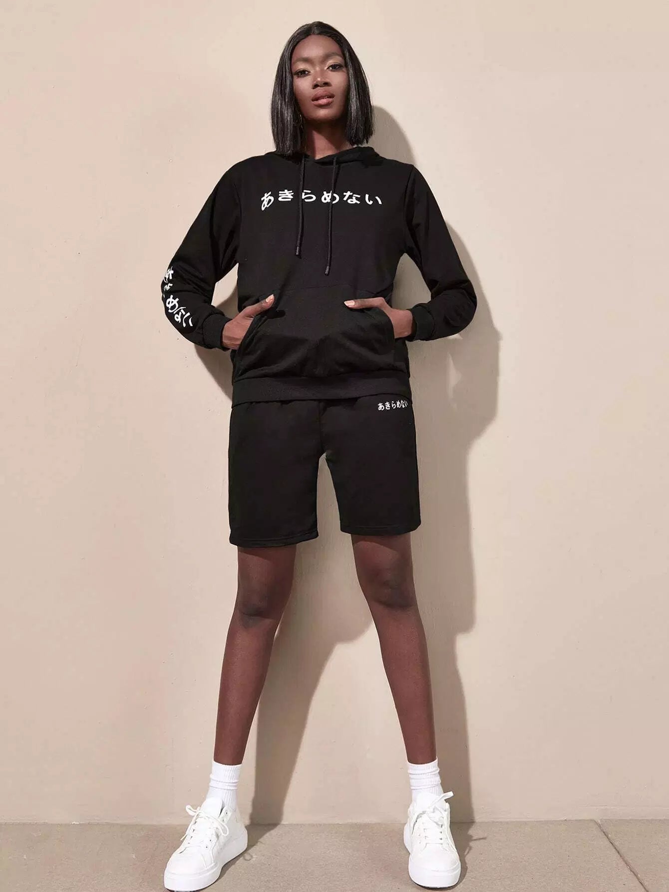Japanese Letter Graphic Drawstring 1pc Hoodie & 1pc Shorts