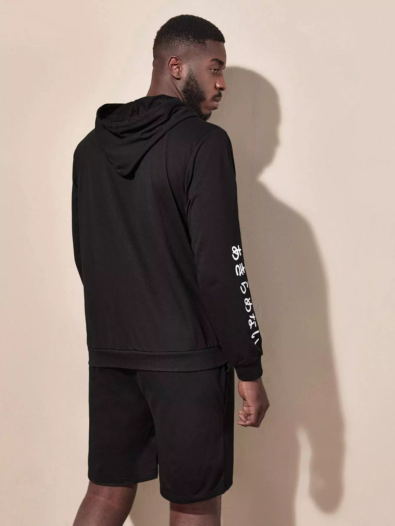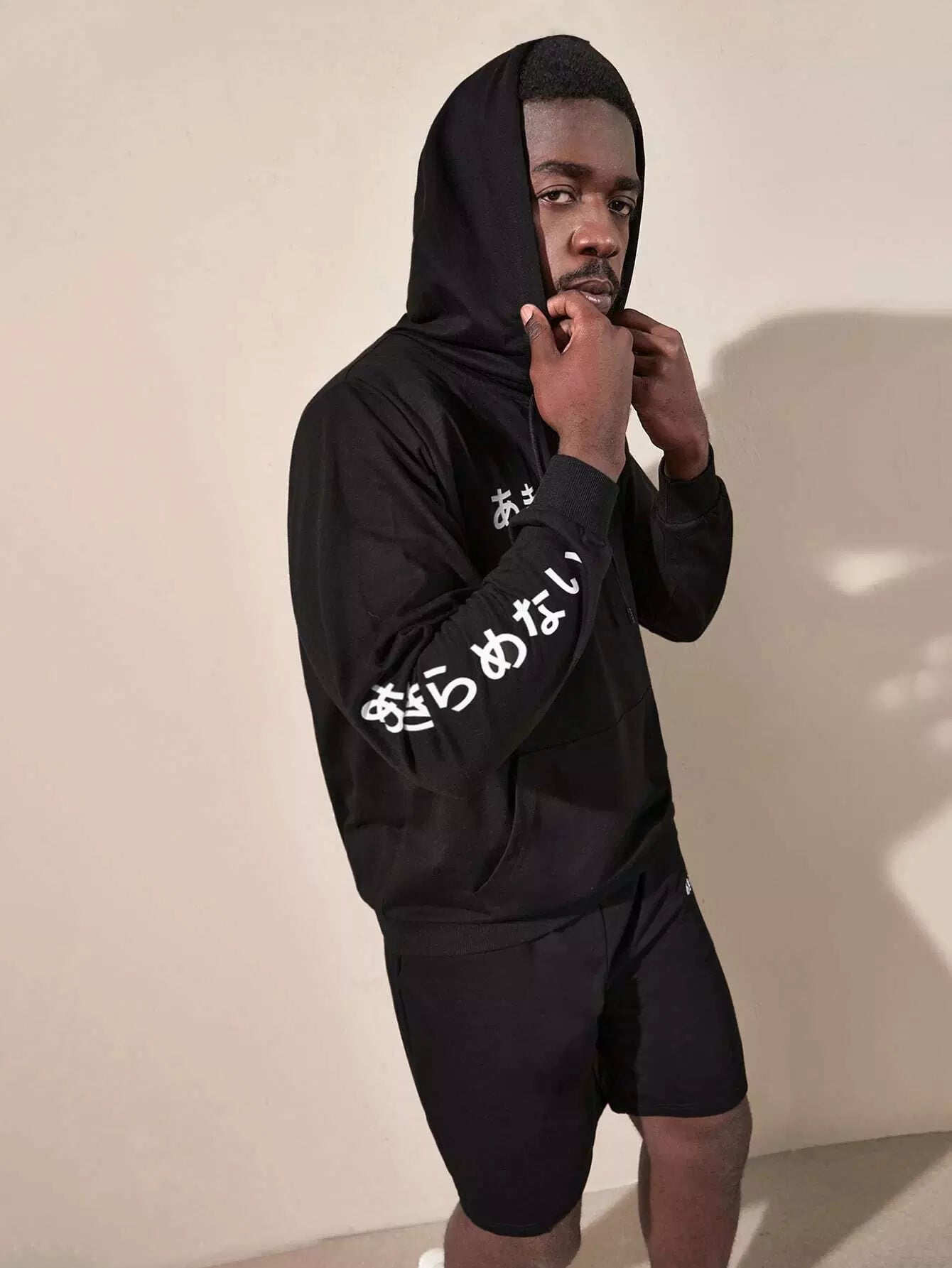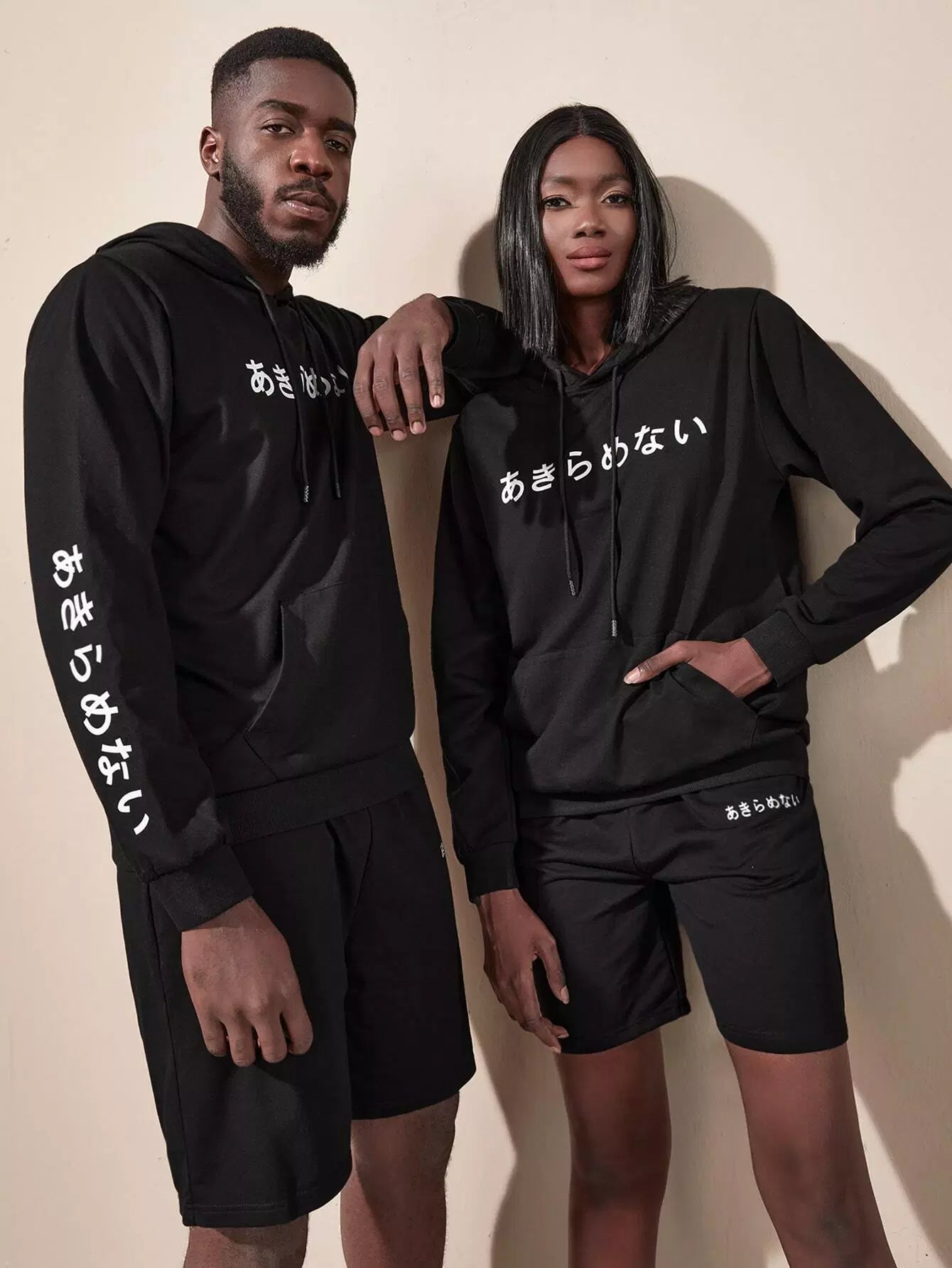 Japanese Letter Graphic Drawstring 1pc Hoodie & 1pc Shorts