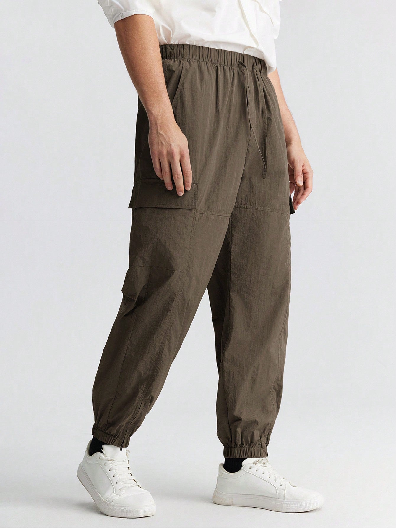 men Maija Men's 2025 Spring Brown Solid Color Zipper Pocket Front Tie Elastic Waistband Drawstring Casual Pants