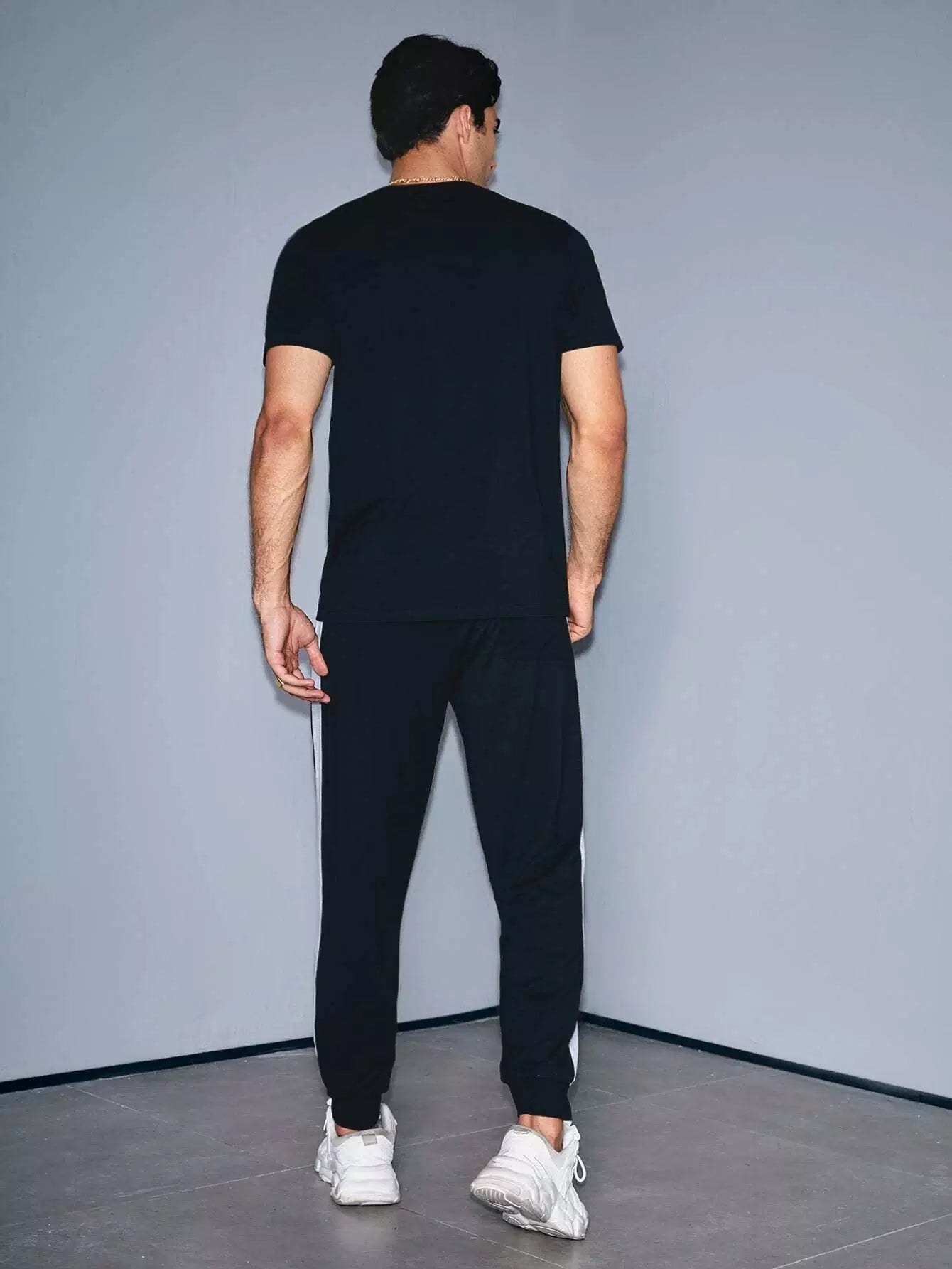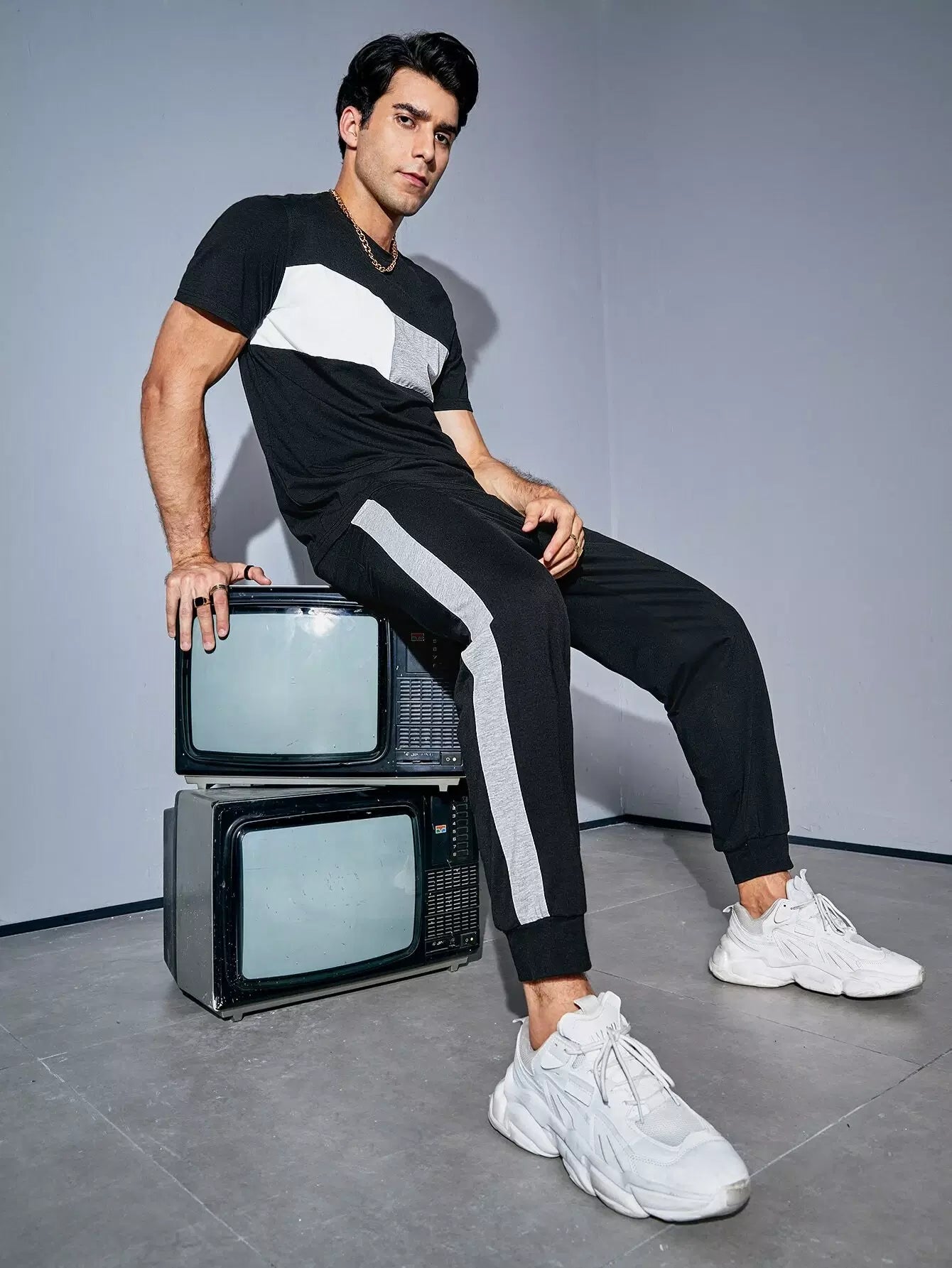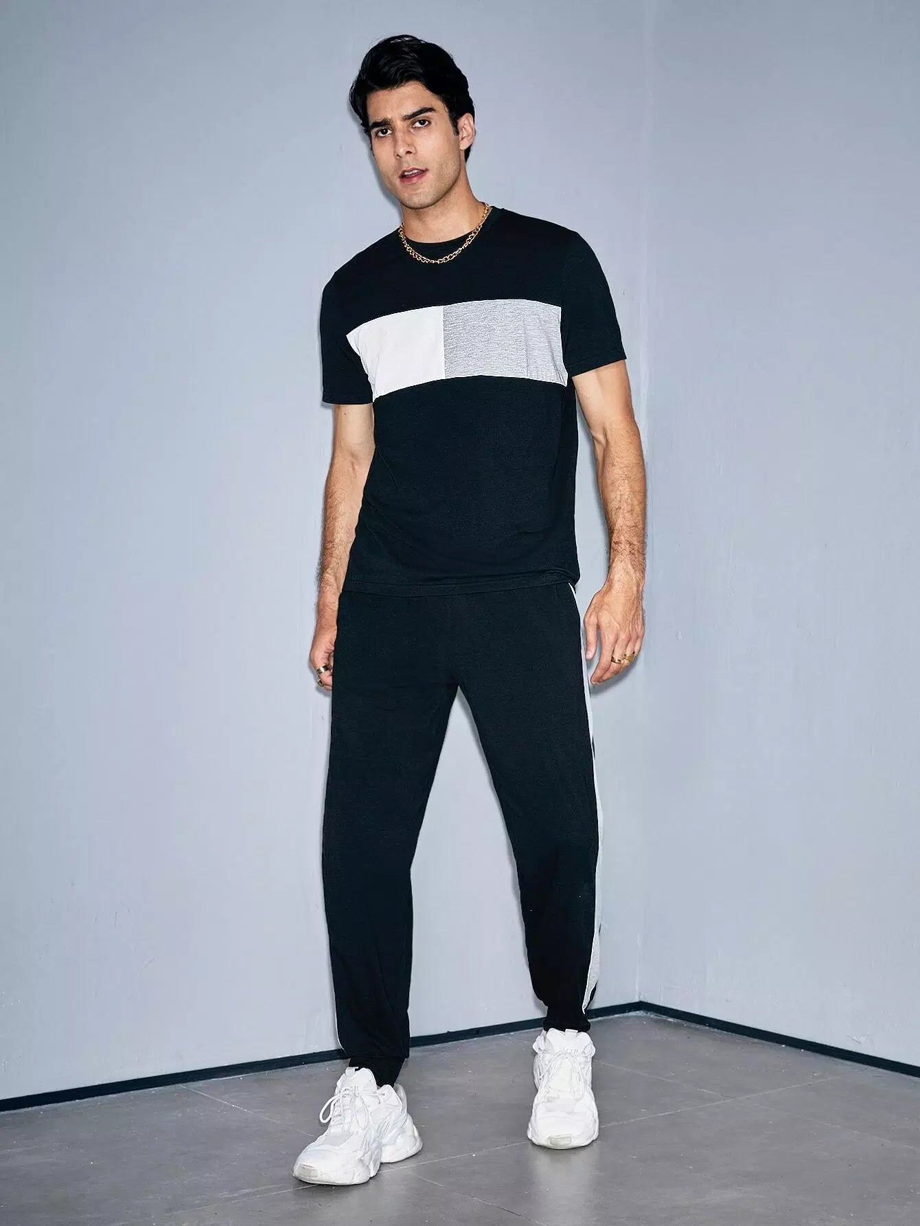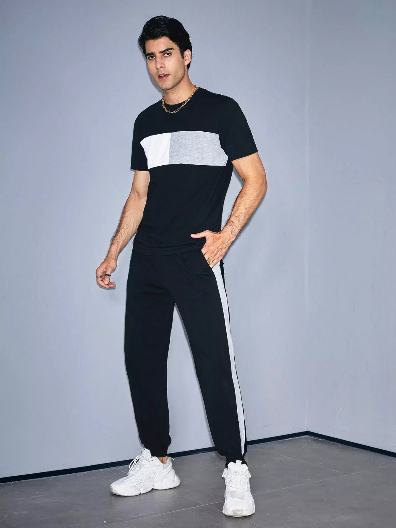Men Colorblock Top & Contrast Sideseam Joggers Set