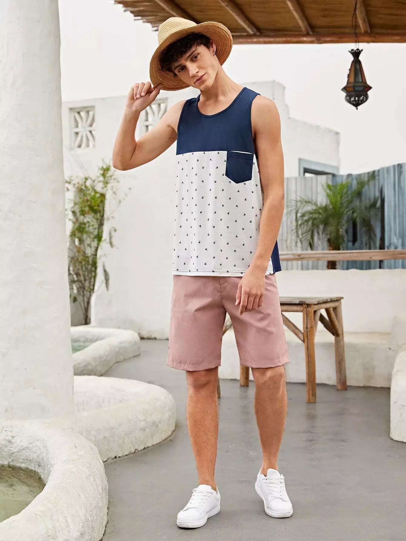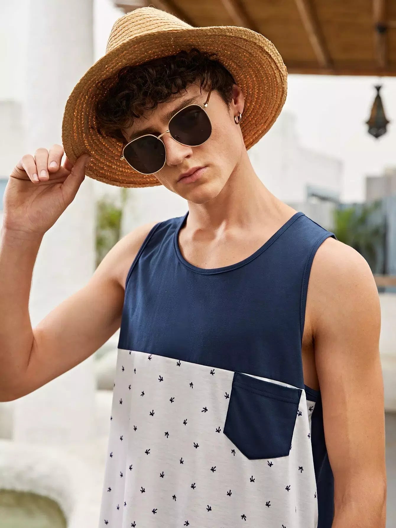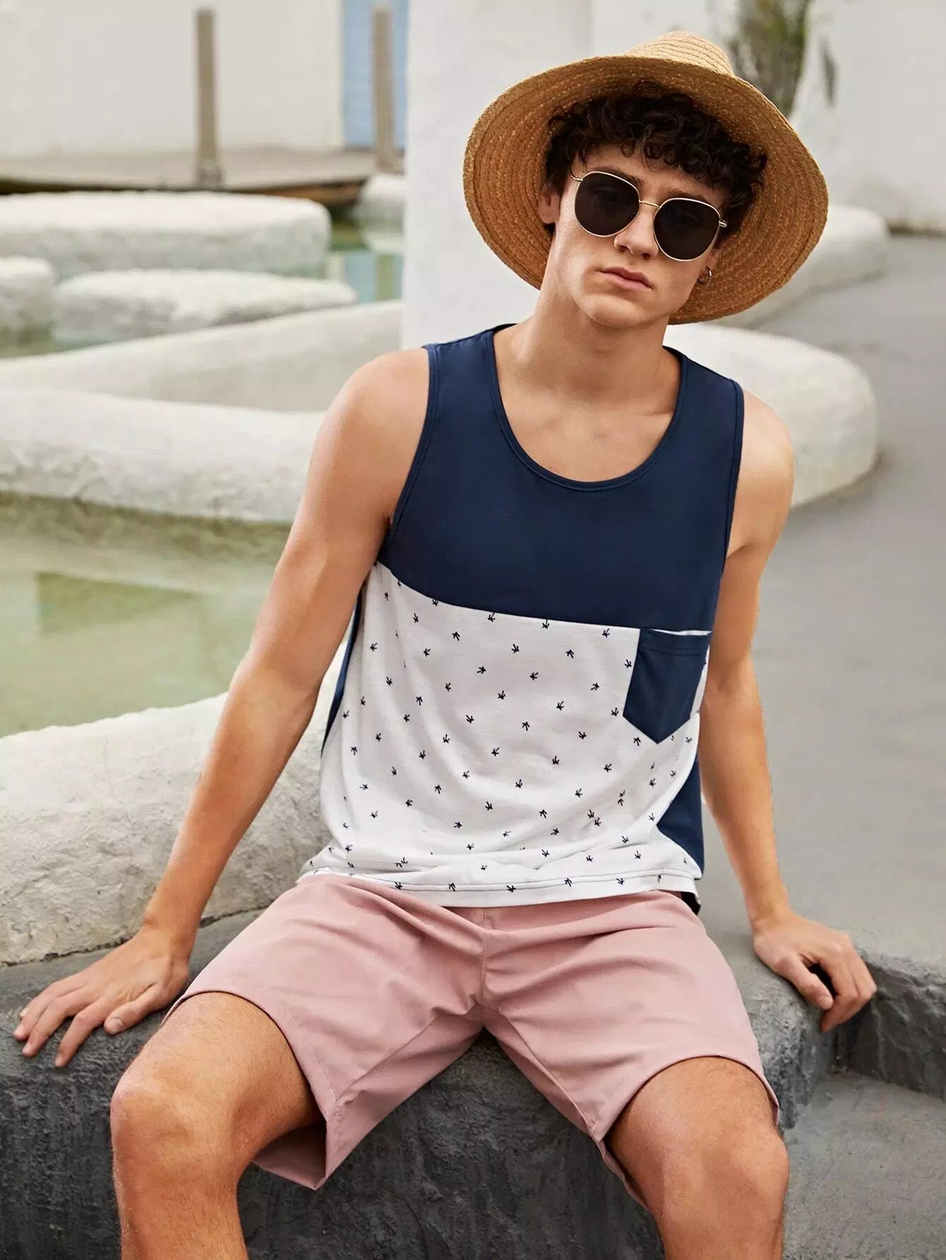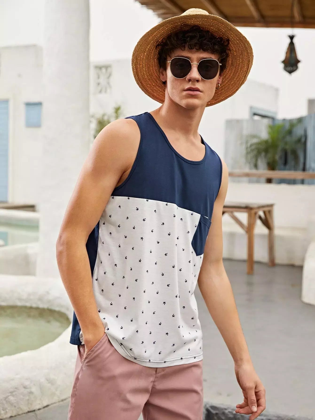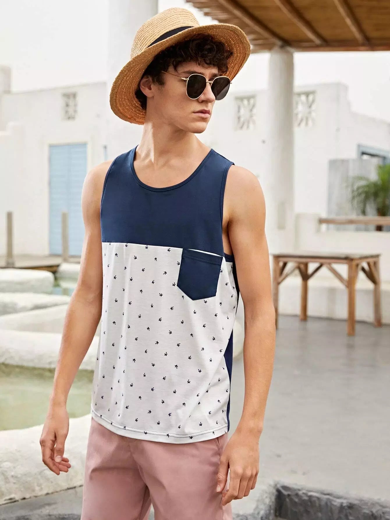 Men Graphic Print Pocket Patched Colorblock Tank Top