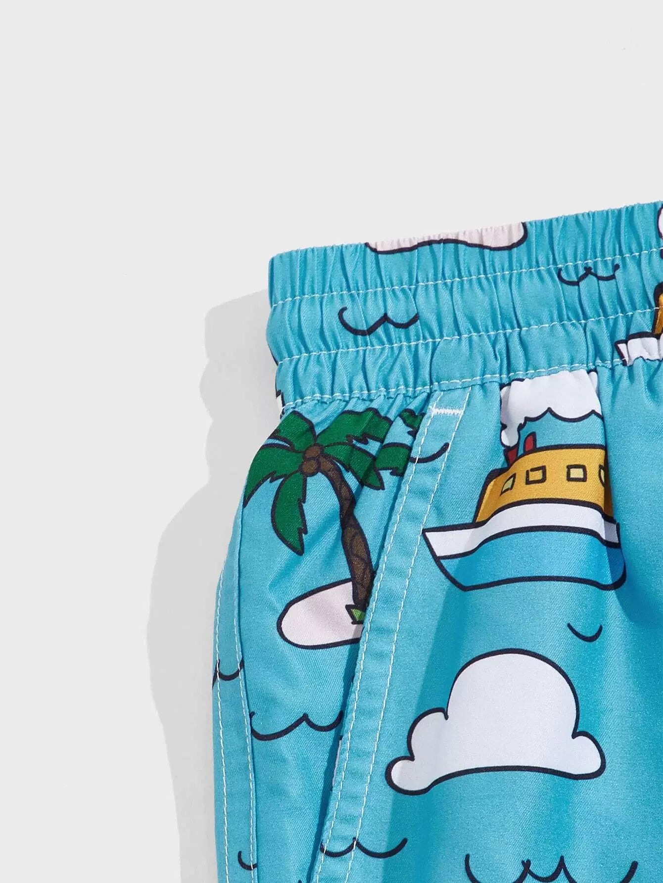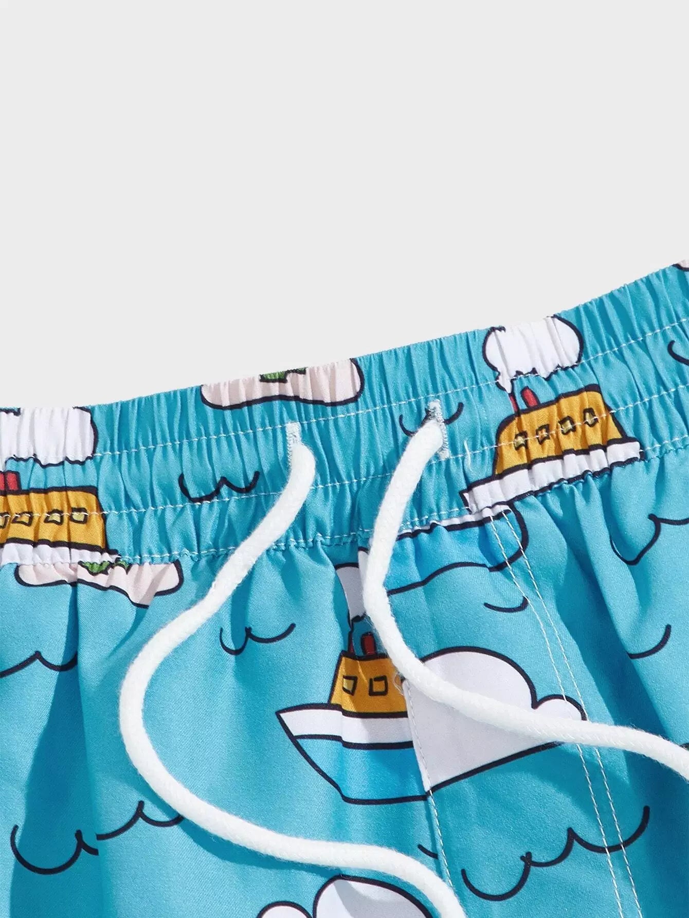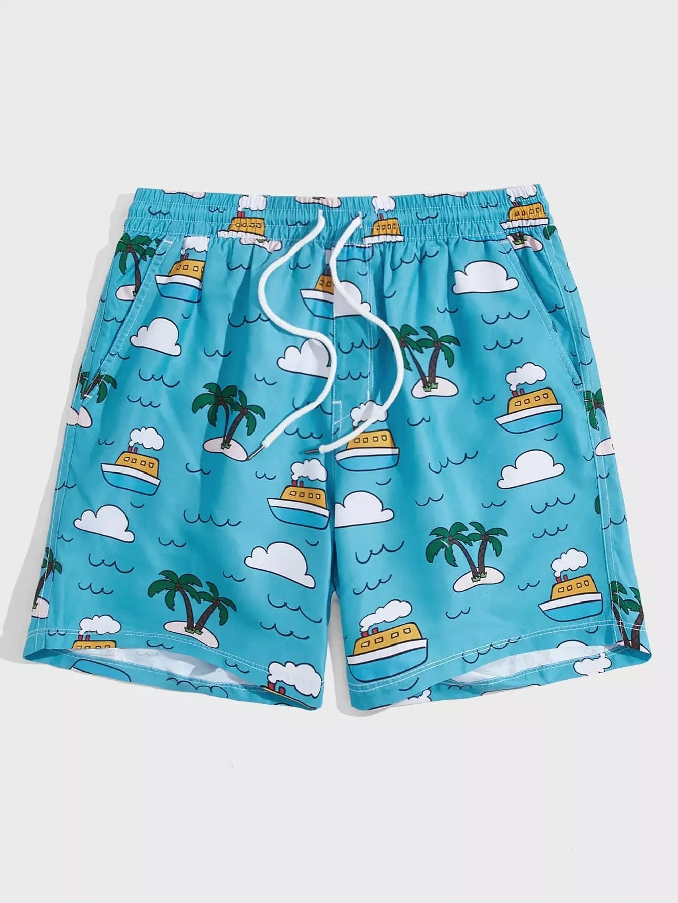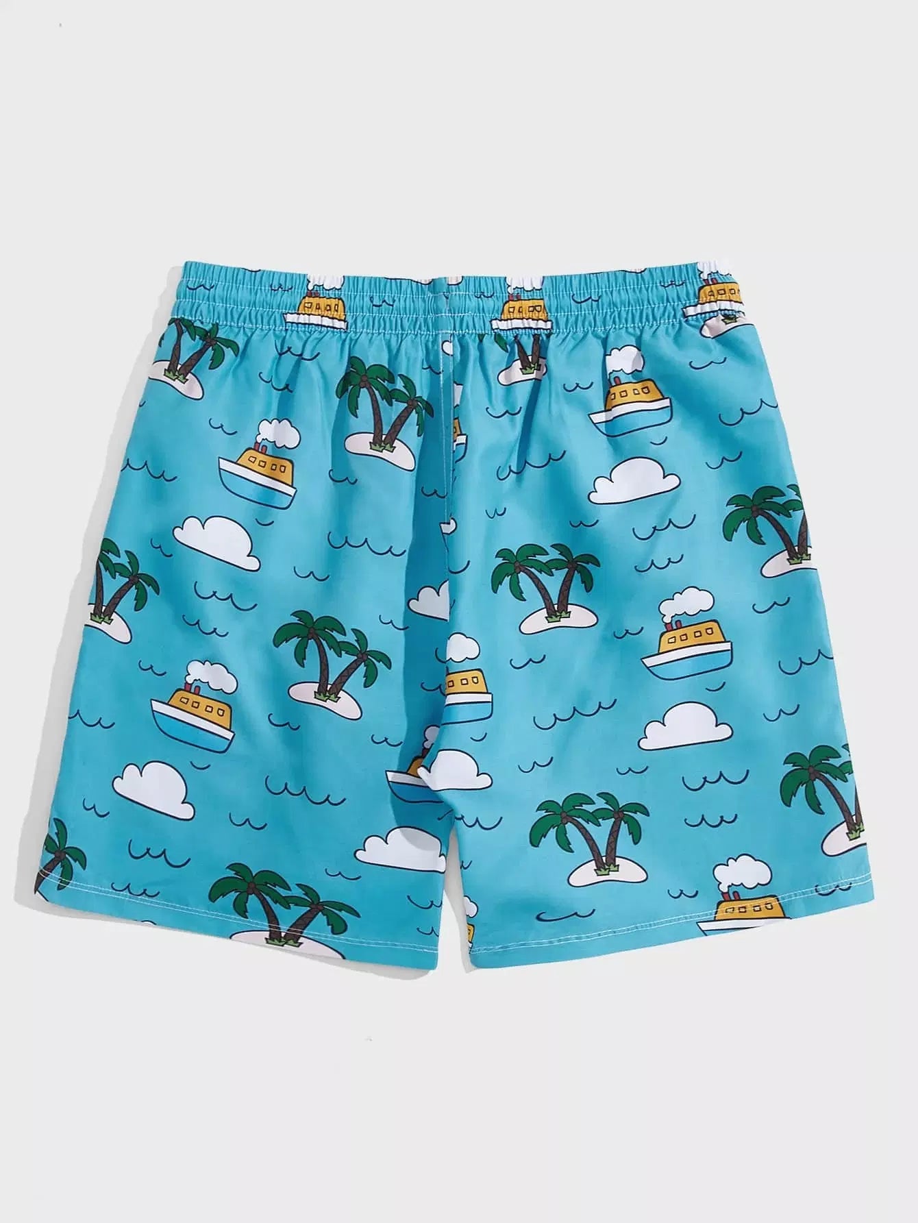 Men - Men Random Sailboat & Palm Tree Print Drawstring Waist Swim Trunks