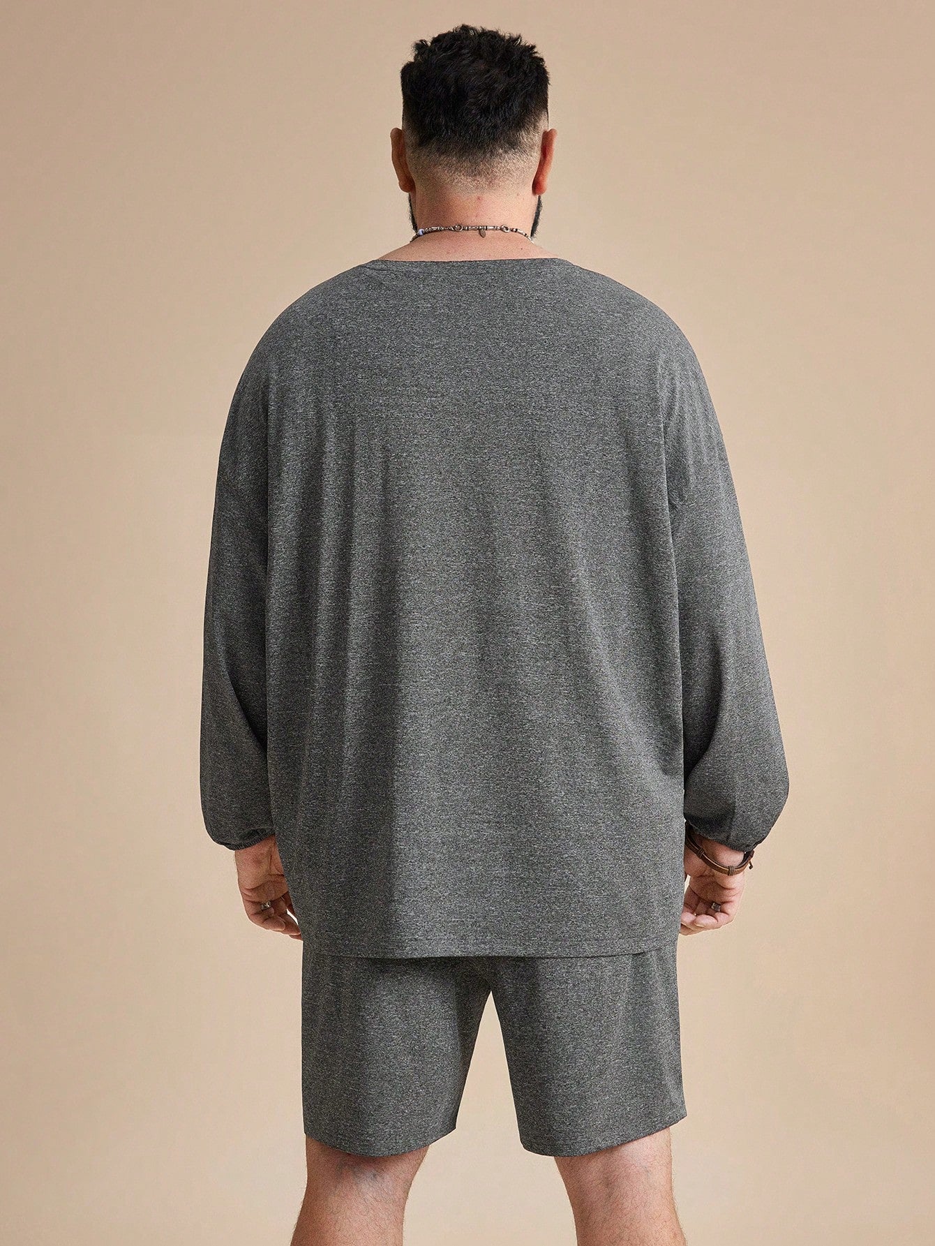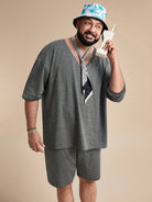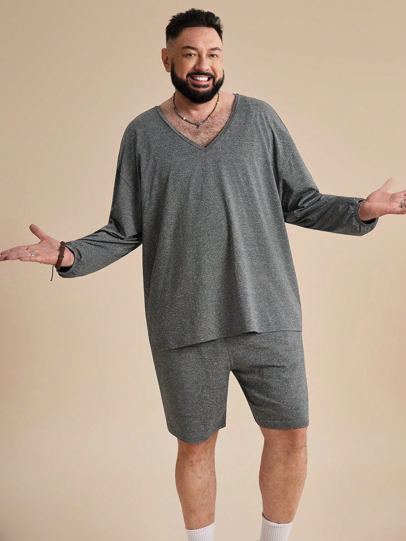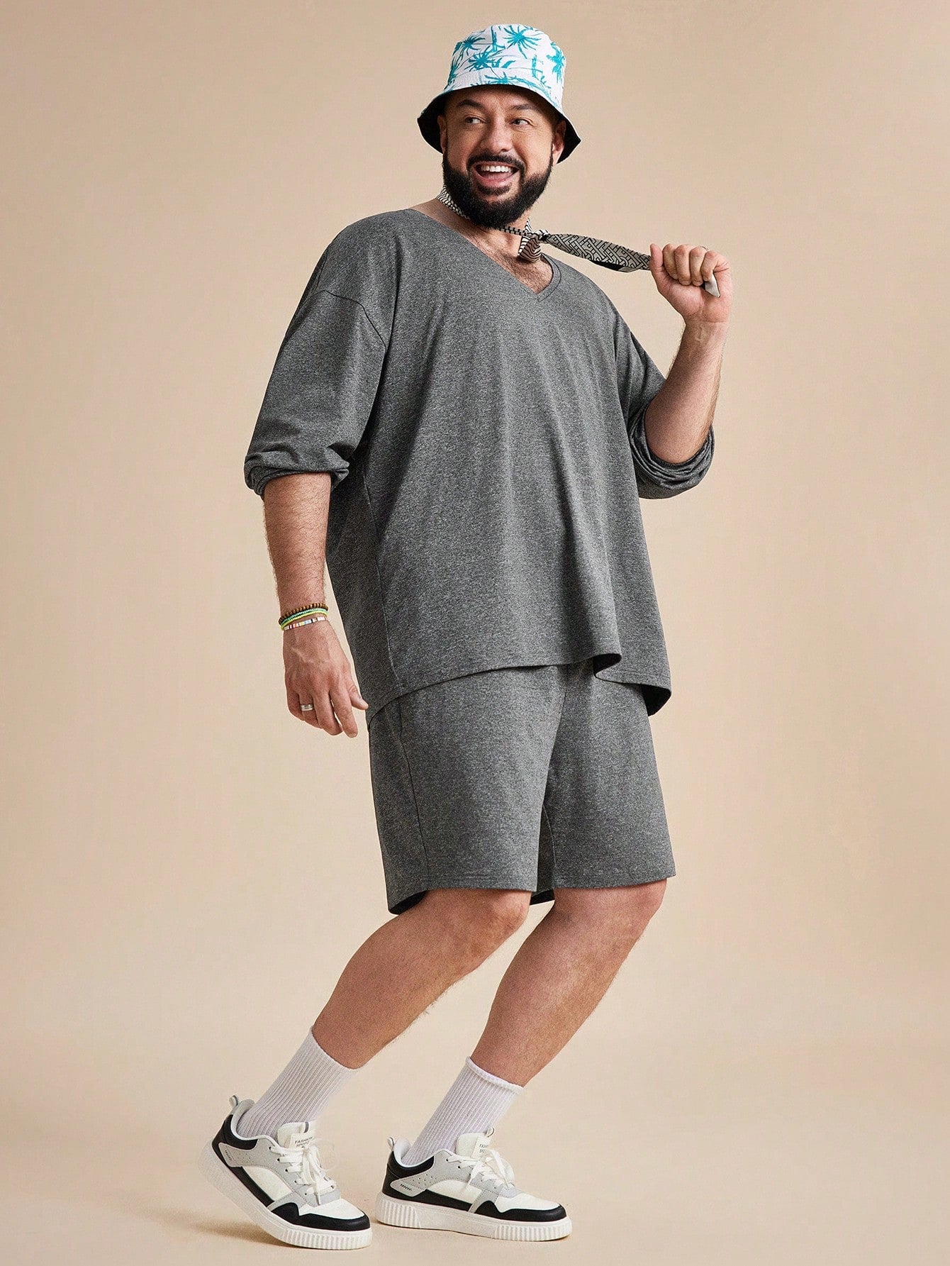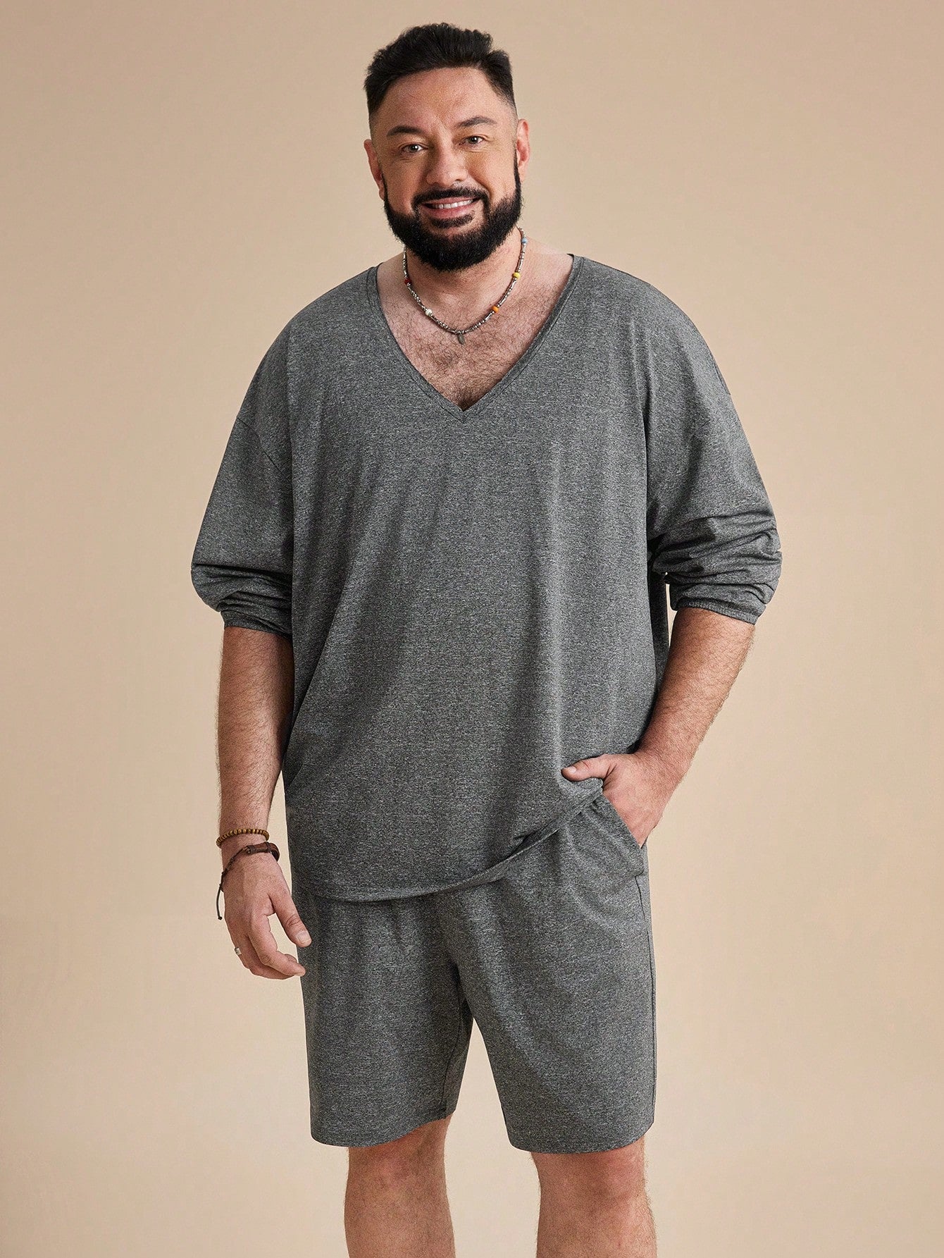 EASEVO Plus Size Men's V-Neck Long Sleeve Casual Loose Oversized T-Shirt And Shorts Set Summer Outfit