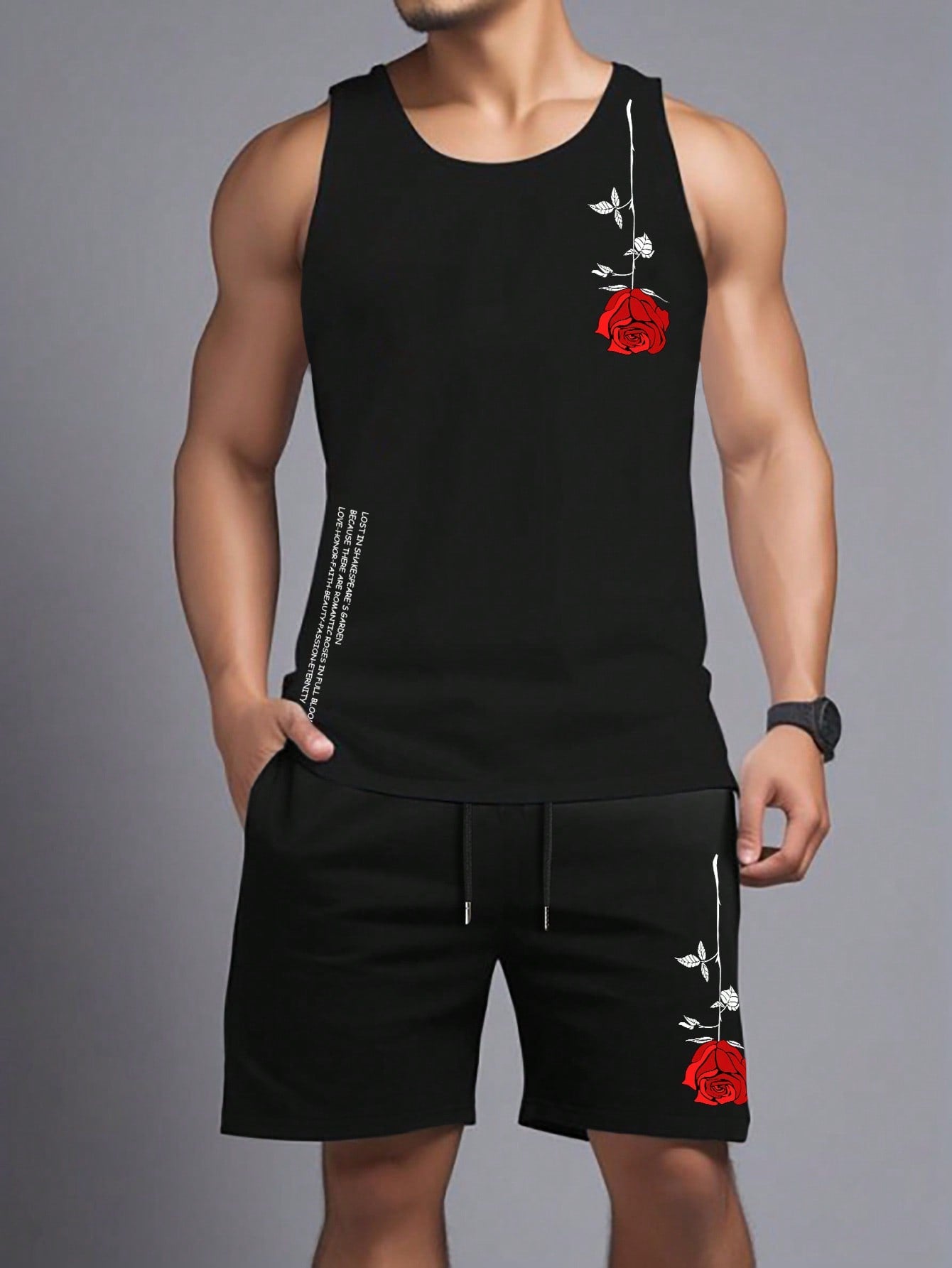 Manfinity Homme Men's Slogan Rose Print Tank Top And Shorts Set