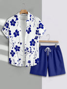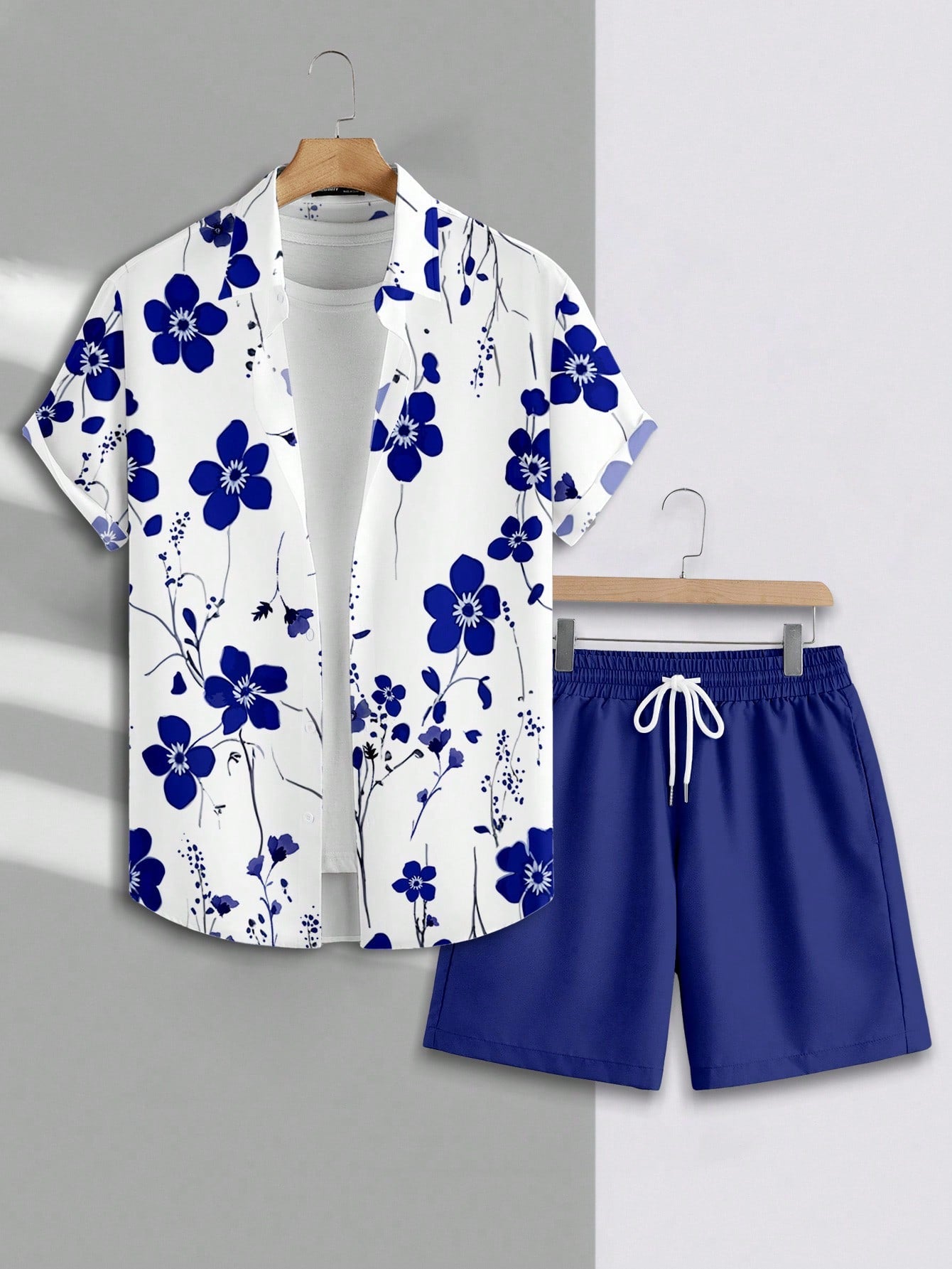 Manfinity RSRT Men's Casual Blue Floral Print Shirt Set, Suitable For Summer