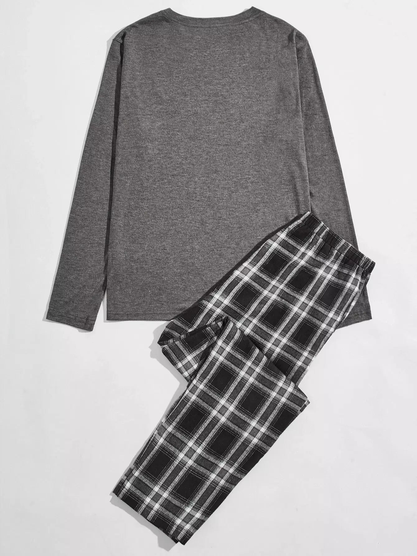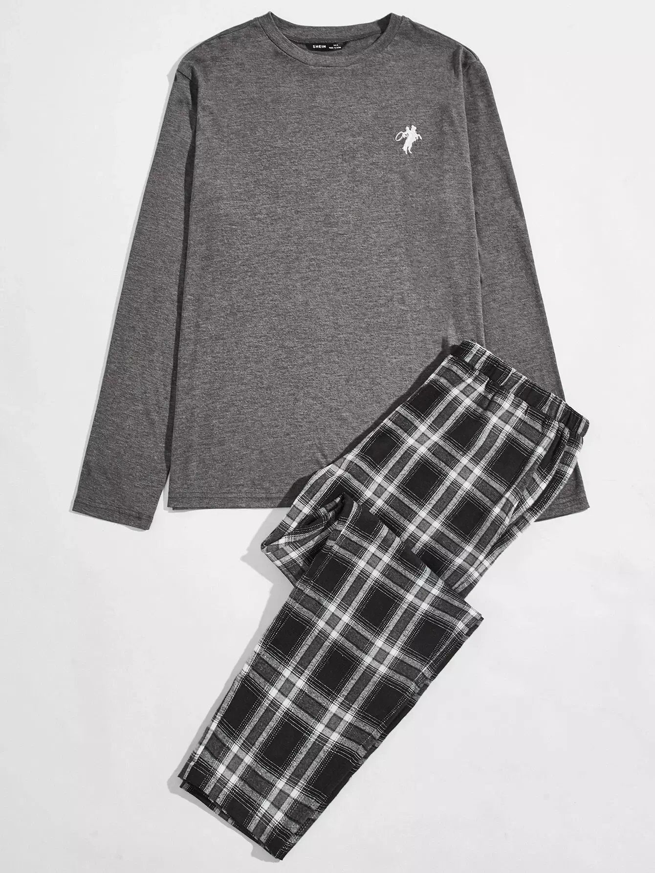 Men Embroidery Graphic Top & Plaid Pants PJ Set